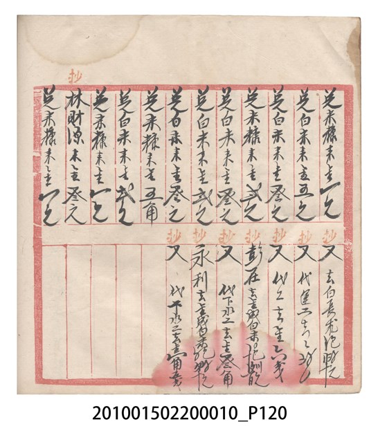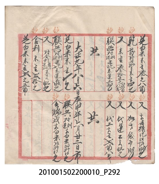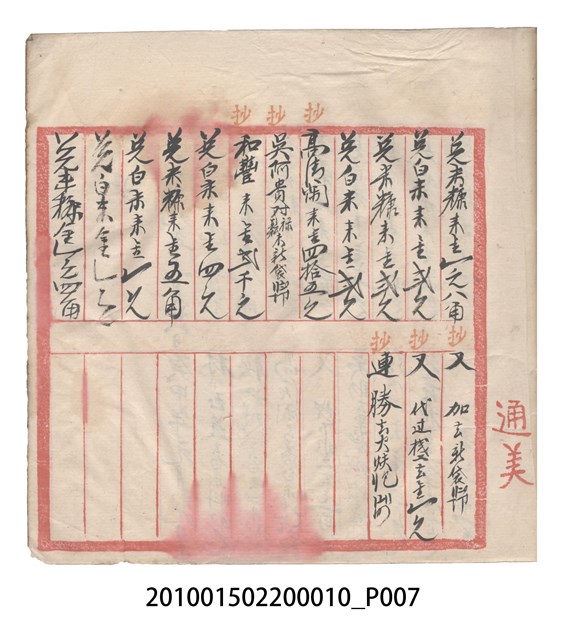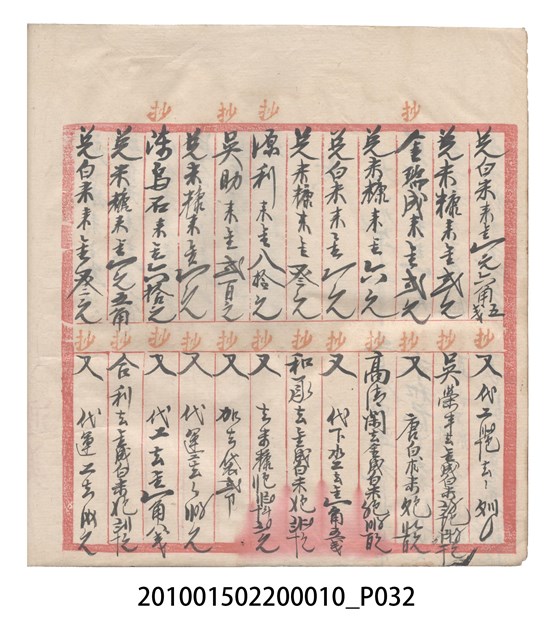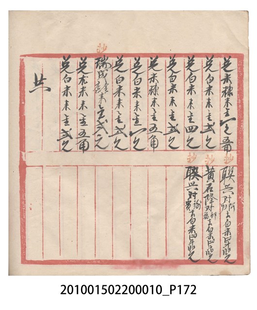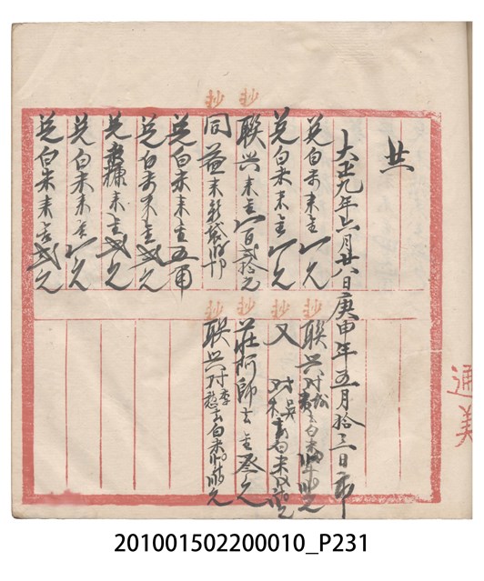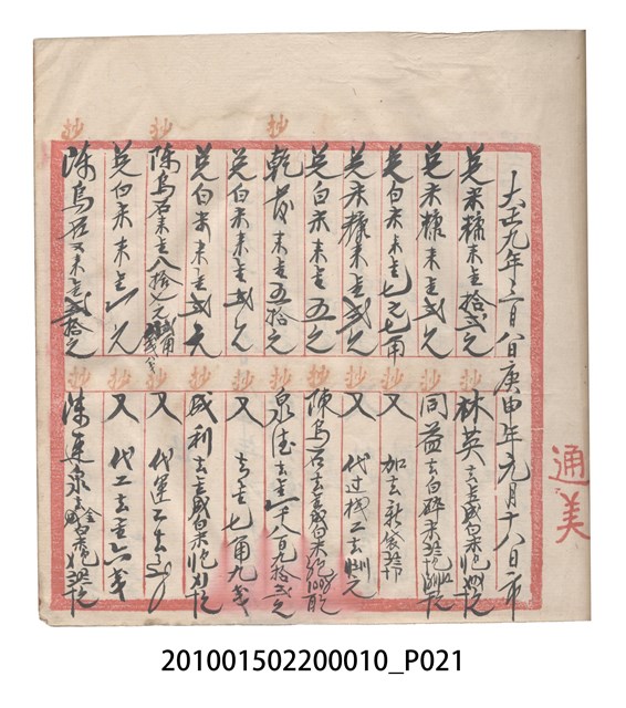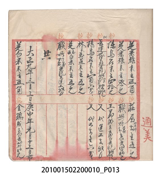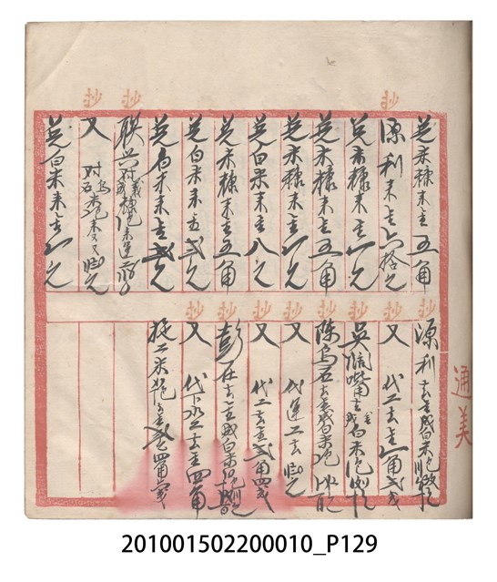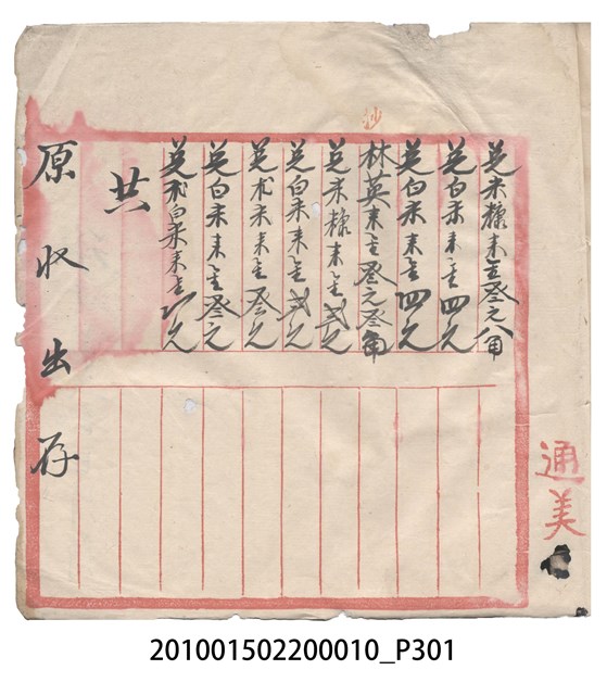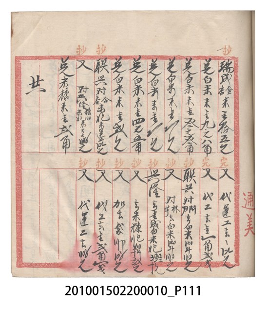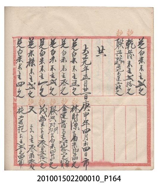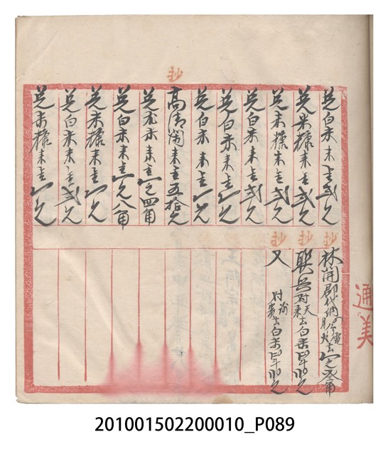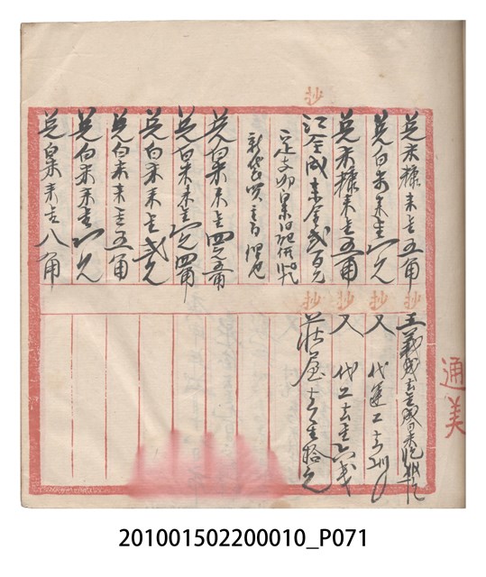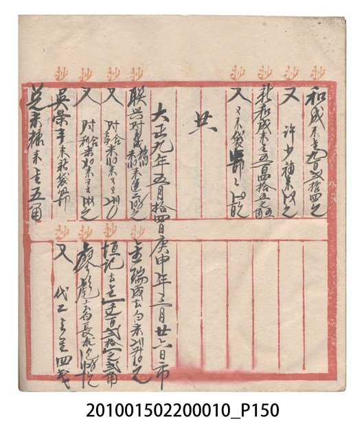 本物件為瑞興大正九年庚申首部日清,該書以棉線裝訂,封面、封底均藍色,封底有蟲蛀破損,頂邊題有瑞興大正九年庚申首部日清字樣,內容涵蓋首行瑞興號大正九年歲次庚申年孟春月立首部日清 承己未年苐叁部日清尾存 大正9年2月20日庚申年元月初一日市上欄共大吉;下欄共大吉。大正9年2月21日庚申年元月初二日市上欄共大吉;下欄支出江和興費用,共吉。大正9年2月22日庚申年元月初三日市上欄收入兌白米費用,共吉;下欄共吉。大正9年2月23日庚申年元月初四日市上欄收入兌白米費用;下欄支出林財源、江和興共吉。大正9年2月24日庚申年元月初五日市上欄收入兌●米、泉德費用;下欄支出拖工費用。大正9年2月25日庚申年元月初六日市上欄收入兌白米、江和興等費用;下欄支出江和興、聯興等費用。大正9年2月26日庚申年元月初七日市上欄收入兌糙米、兌白米、兌米糠費用;下欄支出聯興、吳榮豐、郭成利等費用。大正9年2月28日庚申年元月初九日市上欄收吳榮豐、兌米糠、王義成、兌白米等費用;下欄支出林氏玉燕、聯興等費用。大正9年2月29日庚申年元月初十日市上欄收入兌白米、兌米糠等費用;下欄支出聯興、吳榮豐、林開郡等費用。大正9年8月11日庚申年六月廿七日市上欄收入兌白米、兌米糠等費用;下欄支出林阿嬰、聯興等費用。原收出存。 承過苐弍部日清簿。
