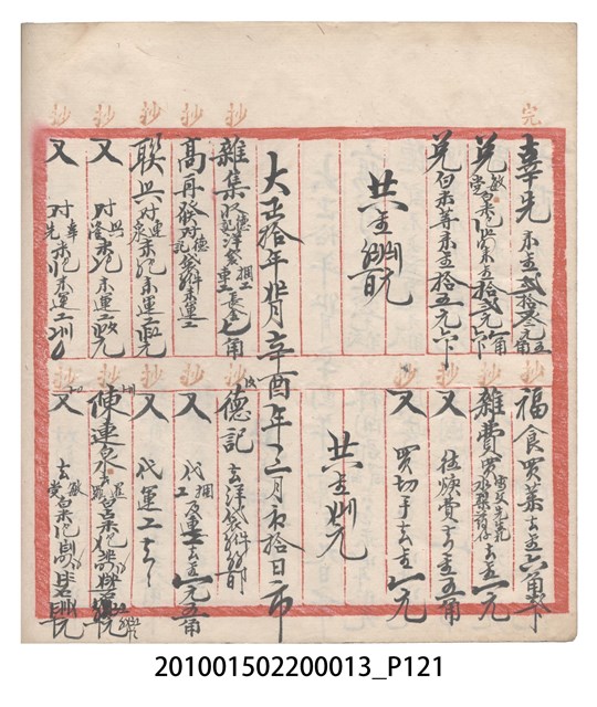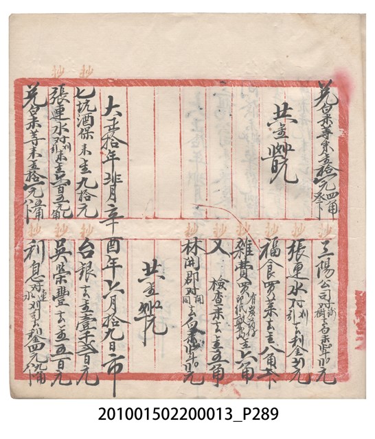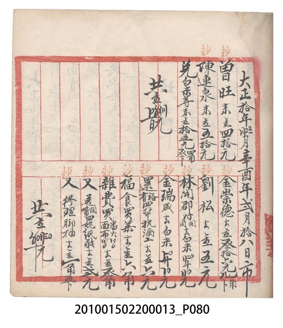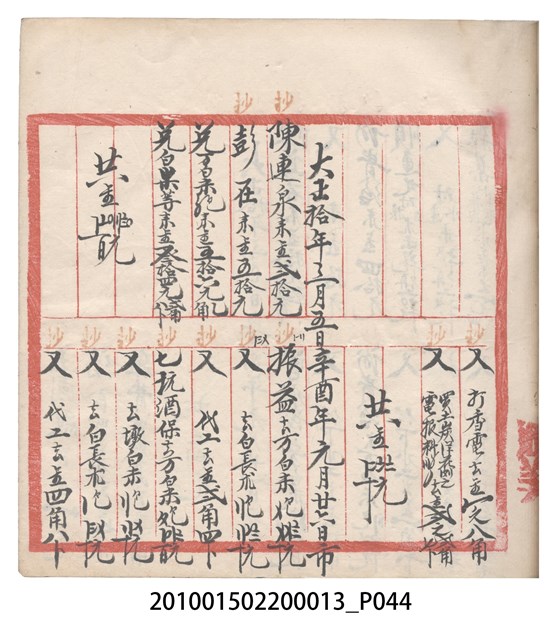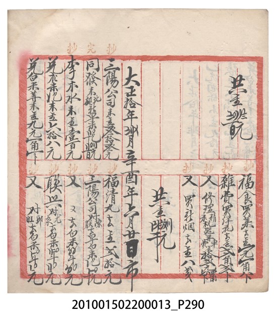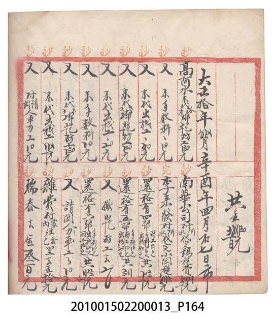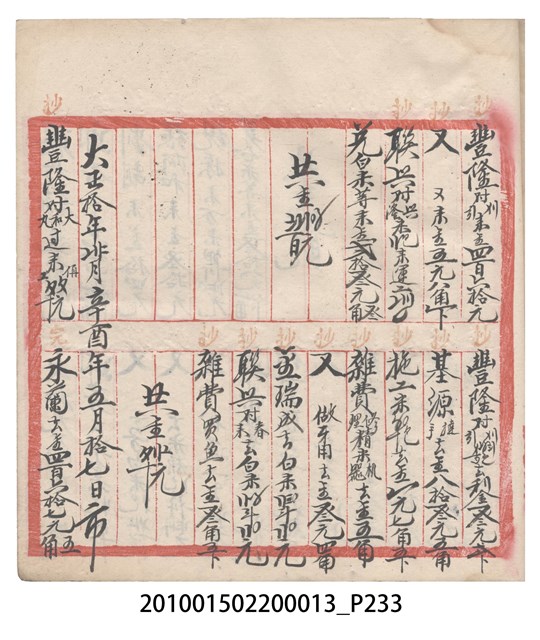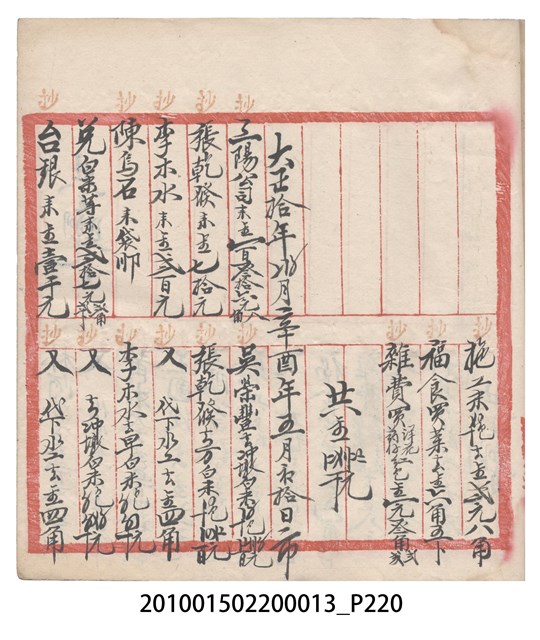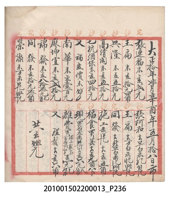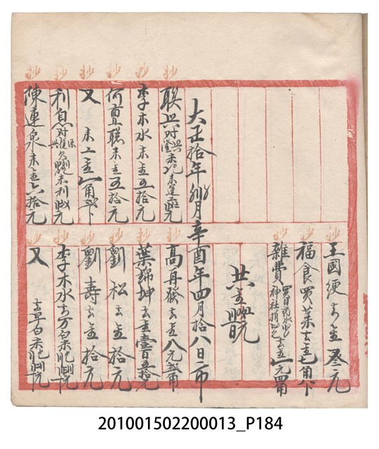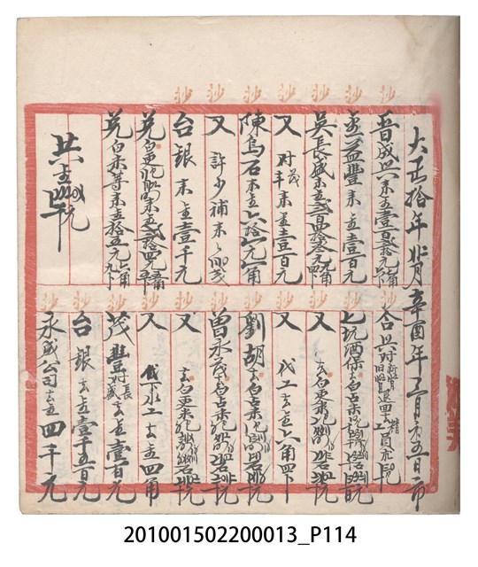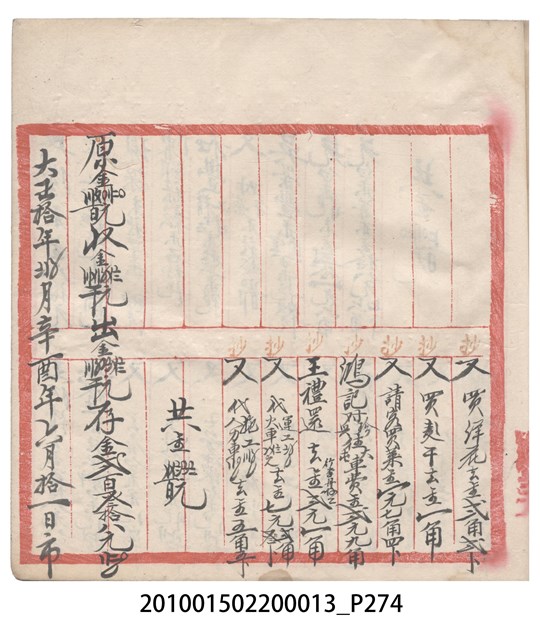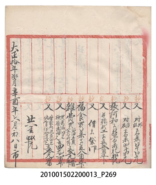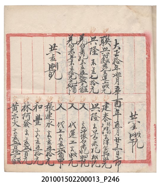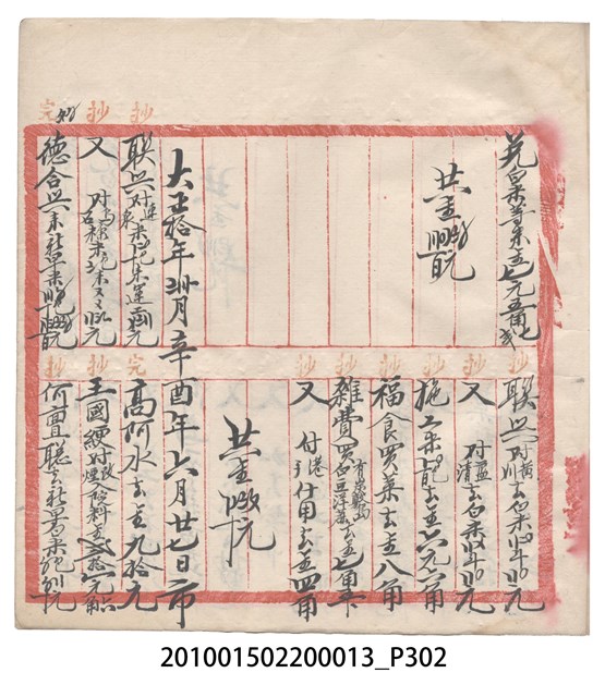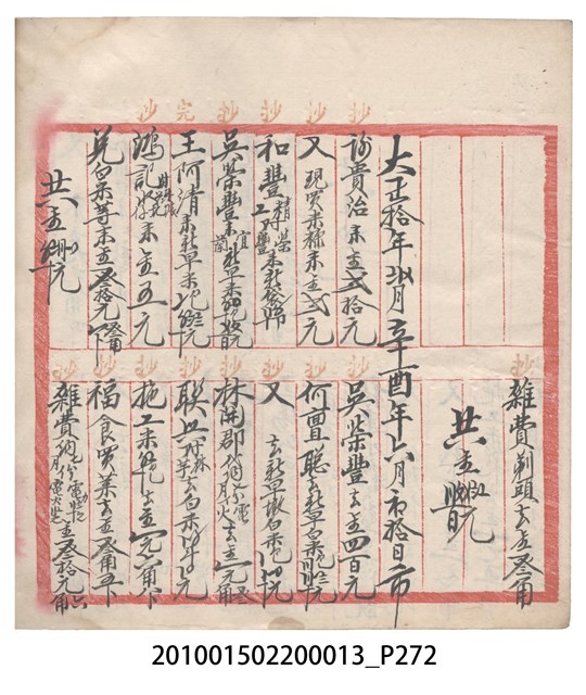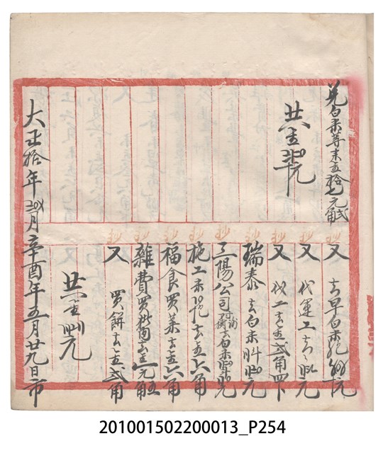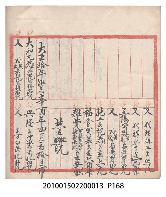 本物件為瑞興大正拾年辛酉苐首部日清,該書以棉線裝訂,封面、封底均藍色,頂邊題有瑞興大正拾年辛酉苐首部日清字樣,內容涵蓋首行瑞興號大正拾年歲次辛酉年孟春月立首部日清 承庚申年苐弍部日清尾存金499元●● 大正10年2月8日辛酉年元月初一日市上欄收入兌白米費用;下欄共吉。大正10年2月9日辛酉年元月初二日市上欄收入兌白米費用;下欄共吉。大正10年2月11日辛酉年元月初四日市上欄收入瑞泰、兌白米等費用;下欄支出彭在、雜費等費用。大正10年2月12日辛酉年元月初五日市上欄收入郭查某、張呆、邱房等費用;下欄支出郭查某、張呆、高清閑等費用。總計原金、收金、出金、存金 承過苐弍部日清簿。