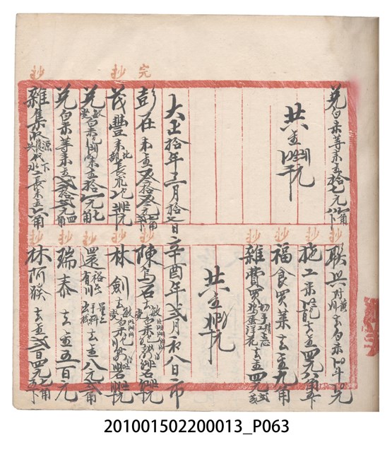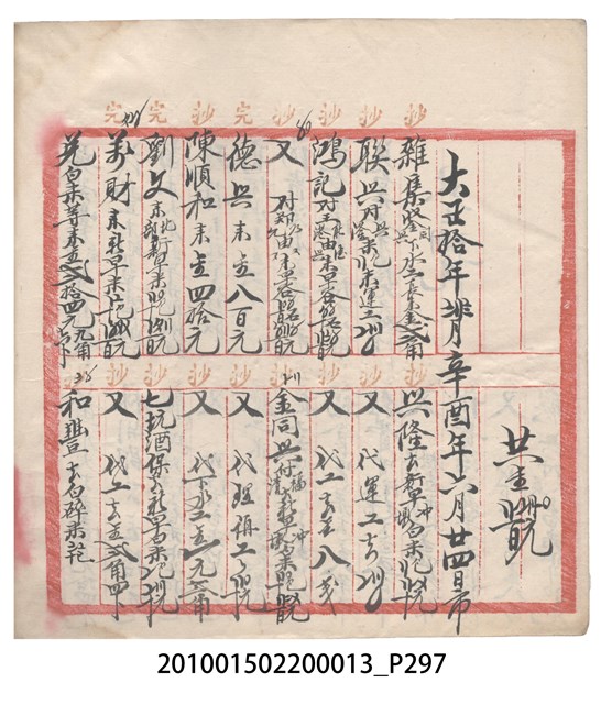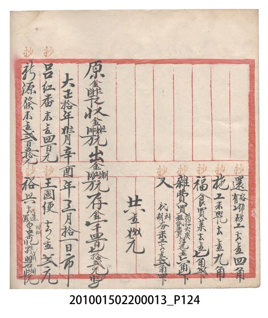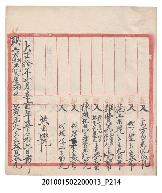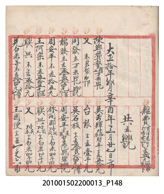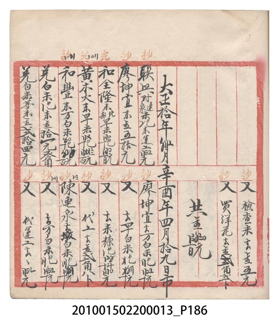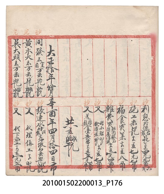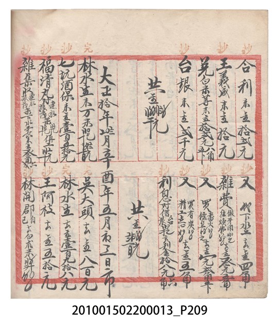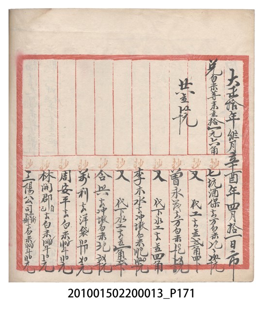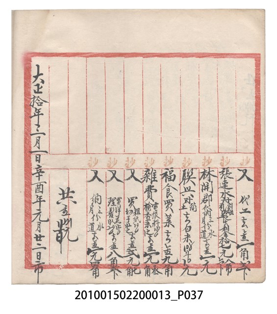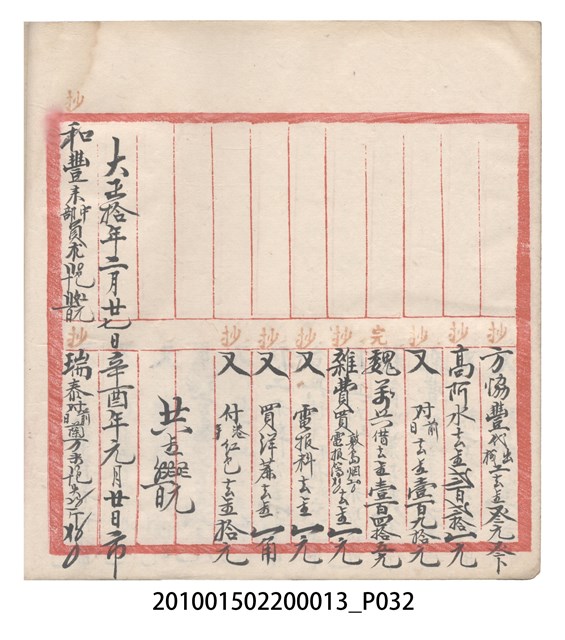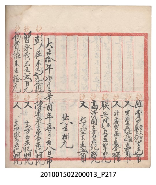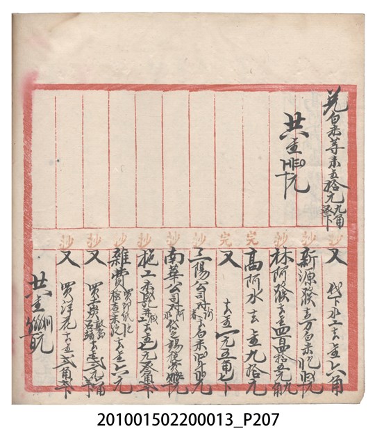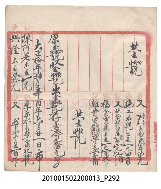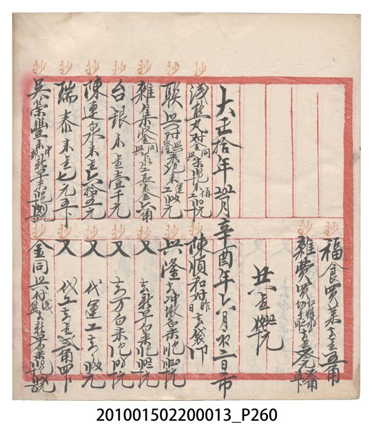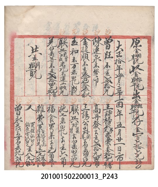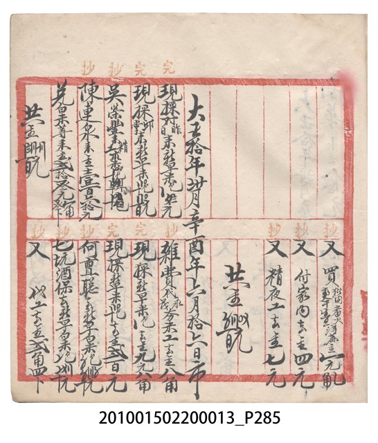 本物件為瑞興大正拾年辛酉苐首部日清,該書以棉線裝訂,封面、封底均藍色,頂邊題有瑞興大正拾年辛酉苐首部日清字樣,內容涵蓋首行瑞興號大正拾年歲次辛酉年孟春月立首部日清 承庚申年苐弍部日清尾存金499元●● 大正10年2月8日辛酉年元月初一日市上欄收入兌白米費用;下欄共吉。大正10年2月9日辛酉年元月初二日市上欄收入兌白米費用;下欄共吉。大正10年2月11日辛酉年元月初四日市上欄收入瑞泰、兌白米等費用;下欄支出彭在、雜費等費用。大正10年2月12日辛酉年元月初五日市上欄收入郭查某、張呆、邱房等費用;下欄支出郭查某、張呆、高清閑等費用。總計原金、收金、出金、存金 承過苐弍部日清簿。