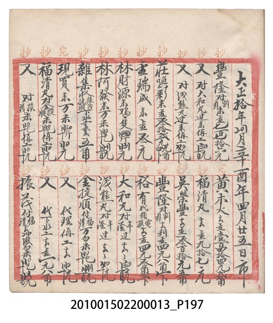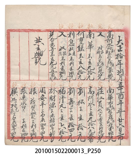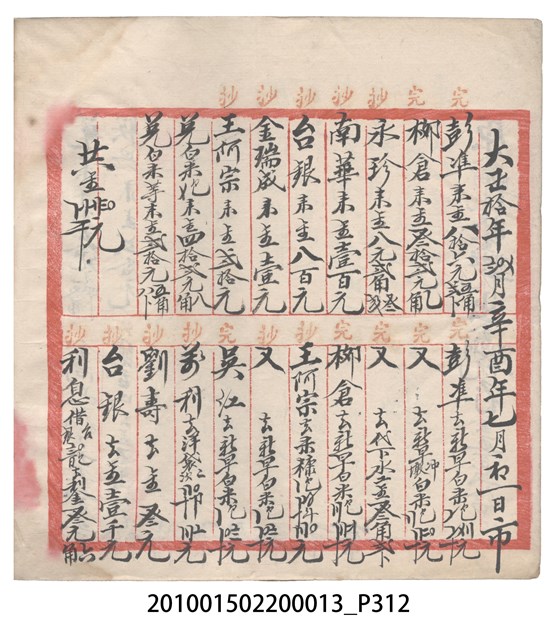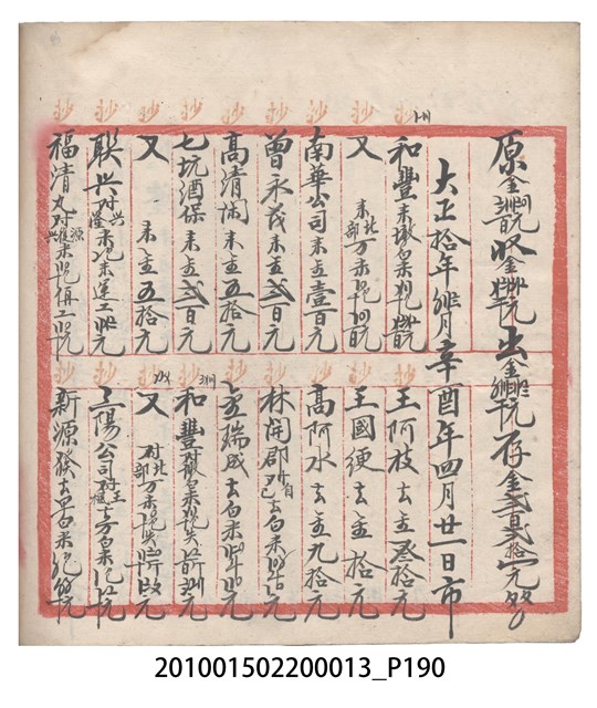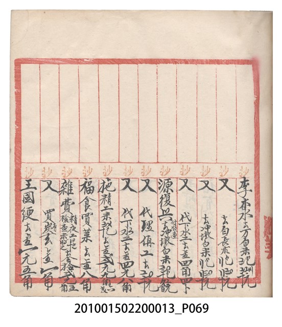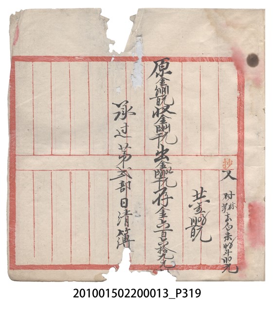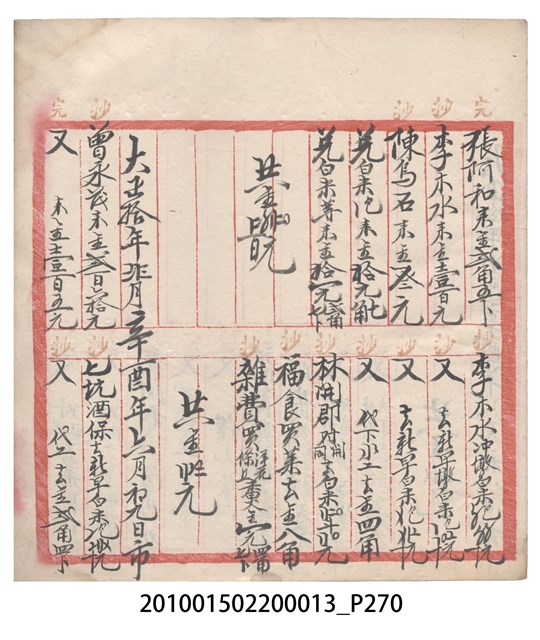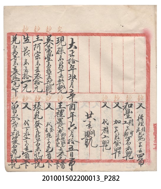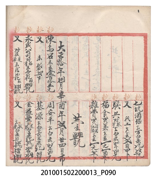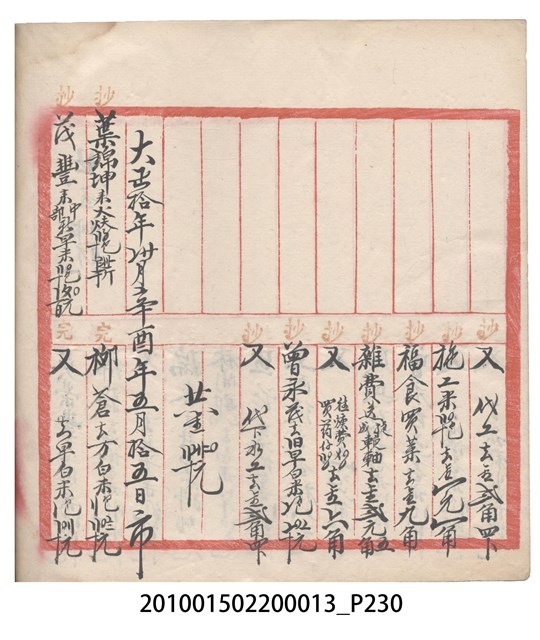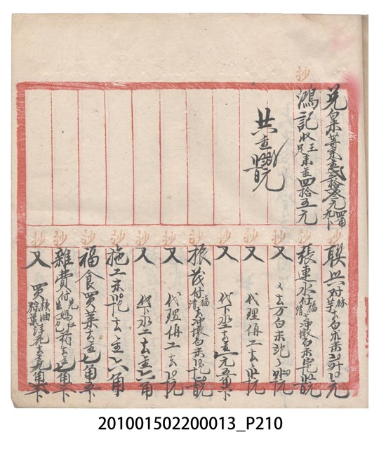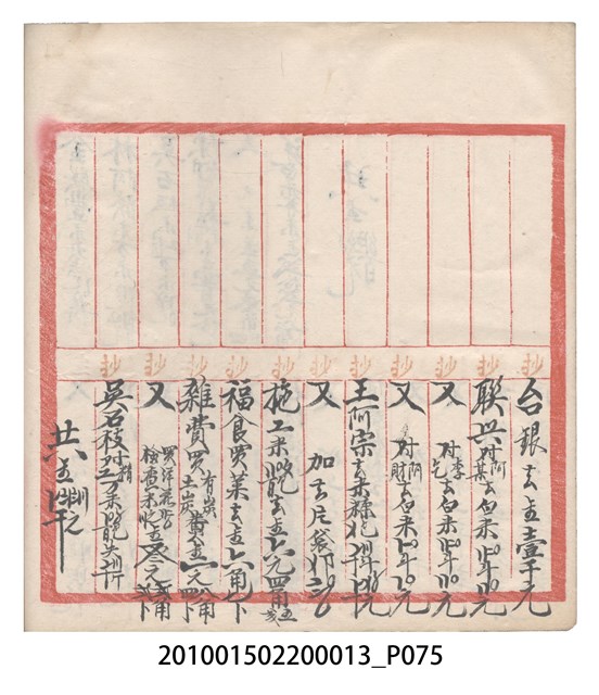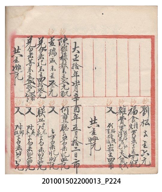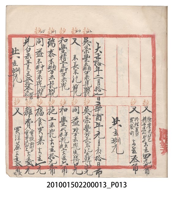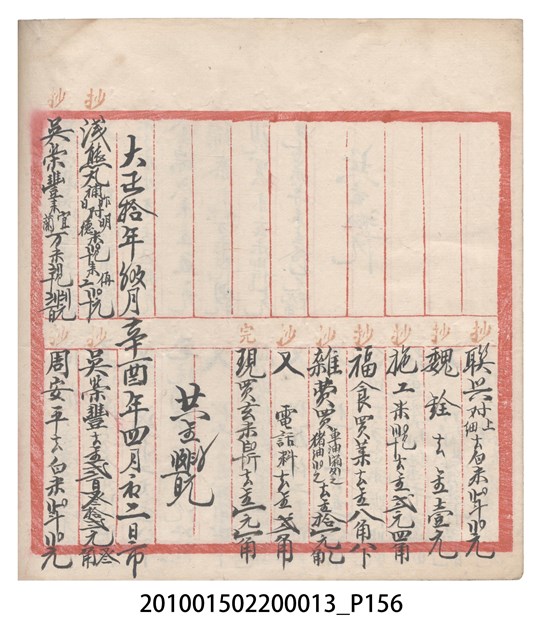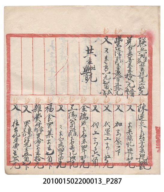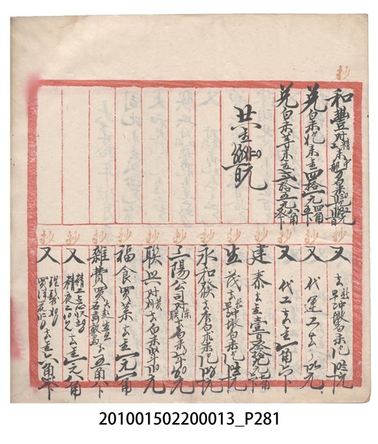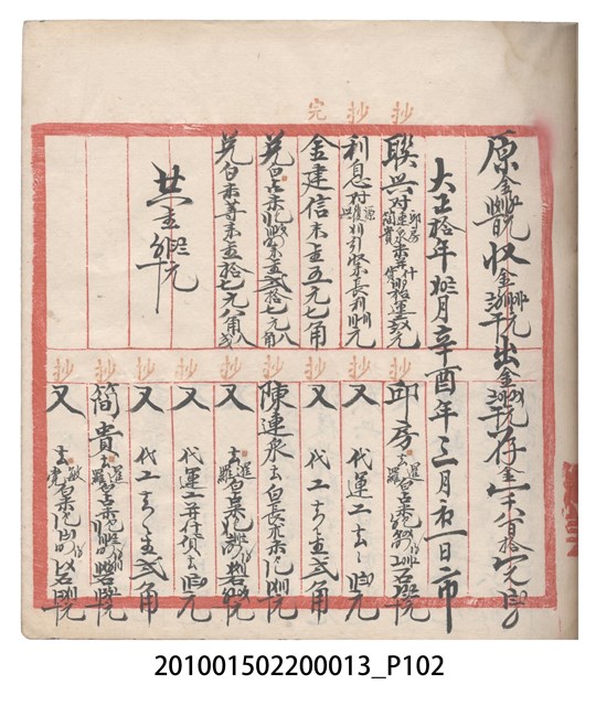 本物件為瑞興大正拾年辛酉苐首部日清,該書以棉線裝訂,封面、封底均藍色,頂邊題有瑞興大正拾年辛酉苐首部日清字樣,內容涵蓋首行瑞興號大正拾年歲次辛酉年孟春月立首部日清 承庚申年苐弍部日清尾存金499元●● 大正10年2月8日辛酉年元月初一日市上欄收入兌白米費用;下欄共吉。大正10年2月9日辛酉年元月初二日市上欄收入兌白米費用;下欄共吉。大正10年2月11日辛酉年元月初四日市上欄收入瑞泰、兌白米等費用;下欄支出彭在、雜費等費用。大正10年2月12日辛酉年元月初五日市上欄收入郭查某、張呆、邱房等費用;下欄支出郭查某、張呆、高清閑等費用。總計原金、收金、出金、存金 承過苐弍部日清簿。