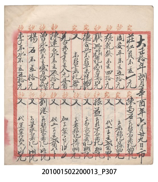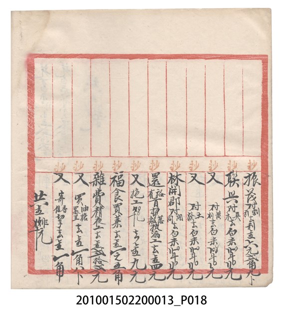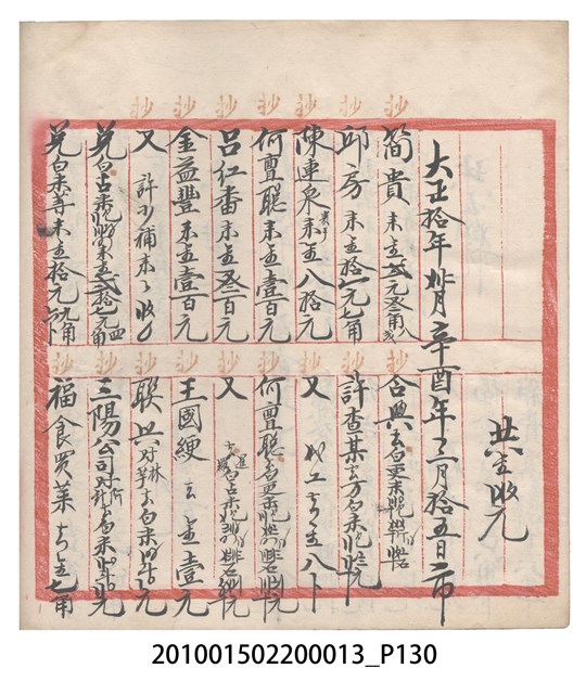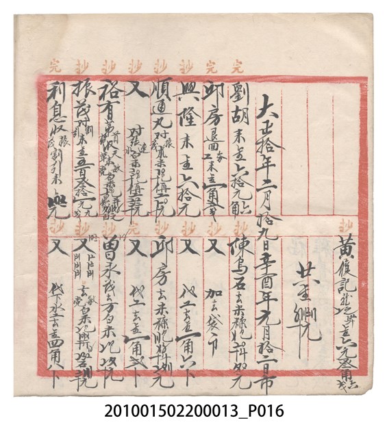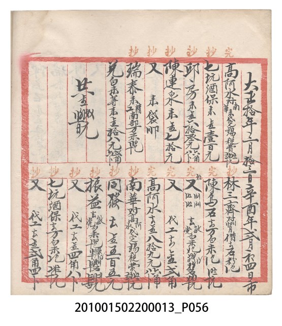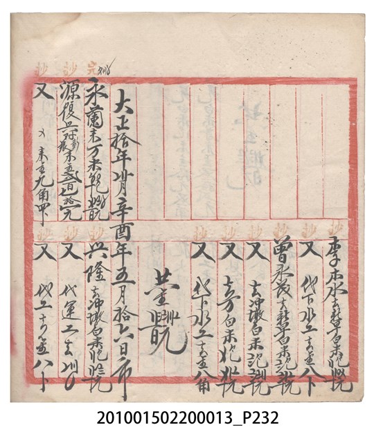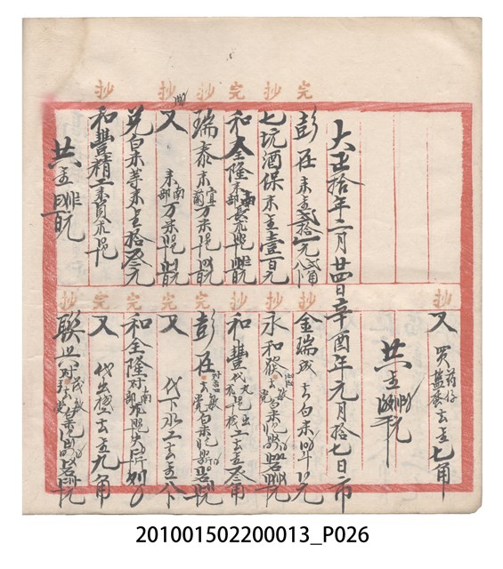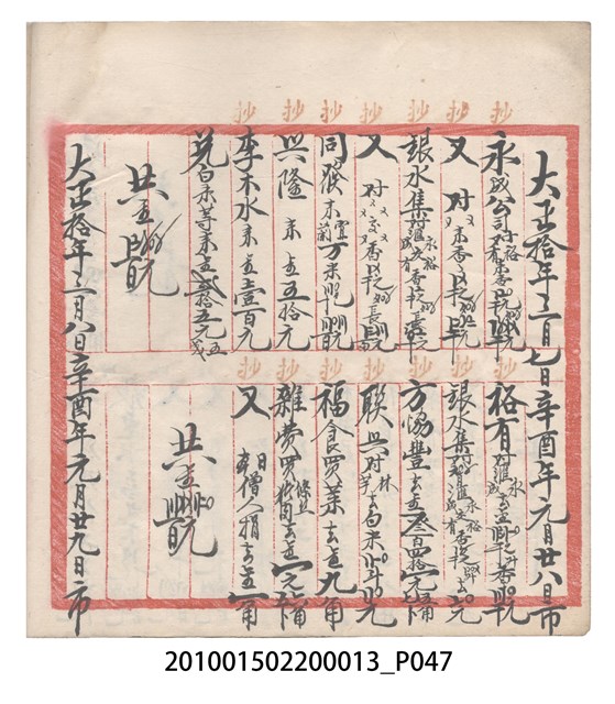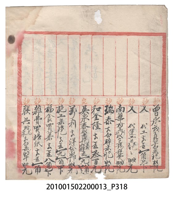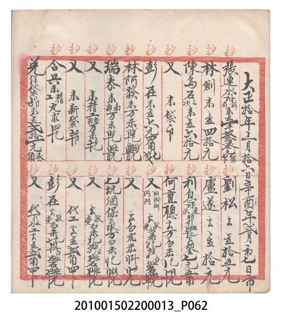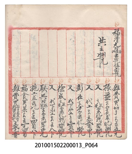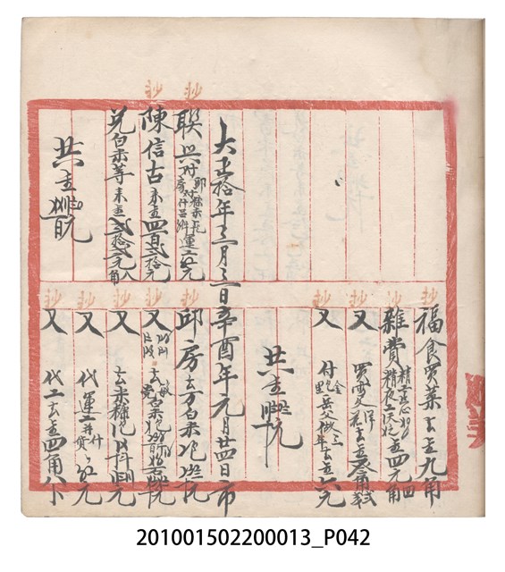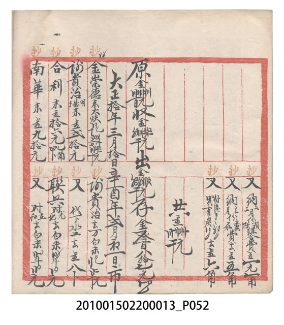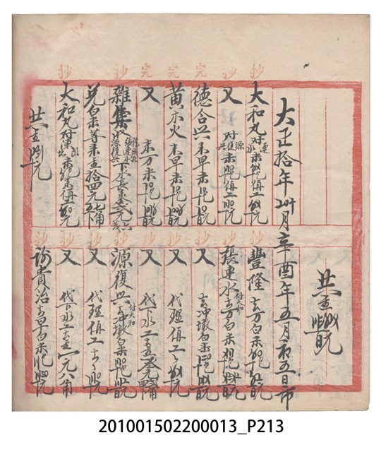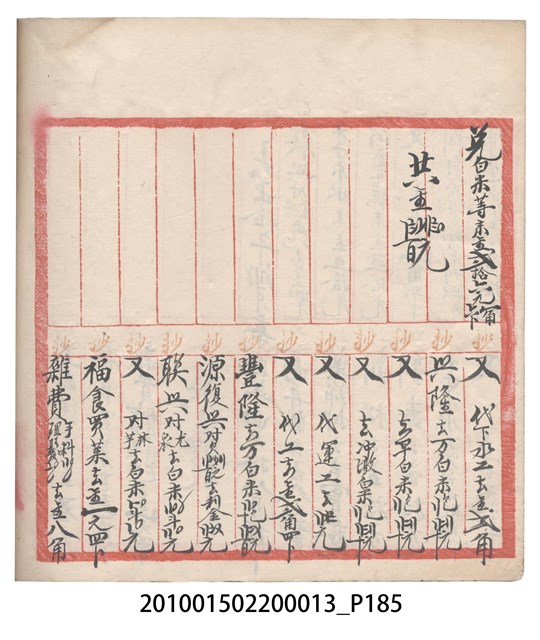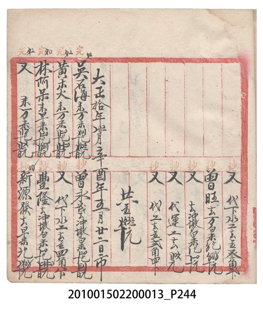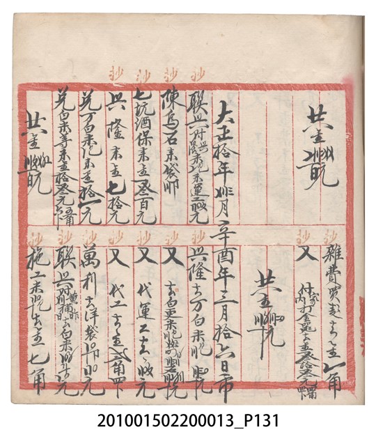 本物件為瑞興大正拾年辛酉苐首部日清,該書以棉線裝訂,封面、封底均藍色,頂邊題有瑞興大正拾年辛酉苐首部日清字樣,內容涵蓋首行瑞興號大正拾年歲次辛酉年孟春月立首部日清 承庚申年苐弍部日清尾存金499元●● 大正10年2月8日辛酉年元月初一日市上欄收入兌白米費用;下欄共吉。大正10年2月9日辛酉年元月初二日市上欄收入兌白米費用;下欄共吉。大正10年2月11日辛酉年元月初四日市上欄收入瑞泰、兌白米等費用;下欄支出彭在、雜費等費用。大正10年2月12日辛酉年元月初五日市上欄收入郭查某、張呆、邱房等費用;下欄支出郭查某、張呆、高清閑等費用。總計原金、收金、出金、存金 承過苐弍部日清簿。
