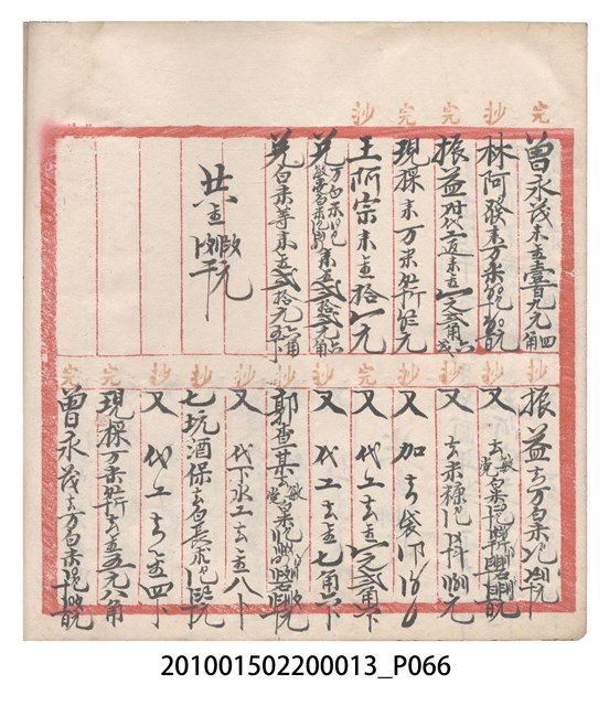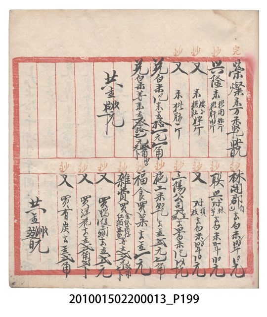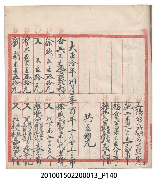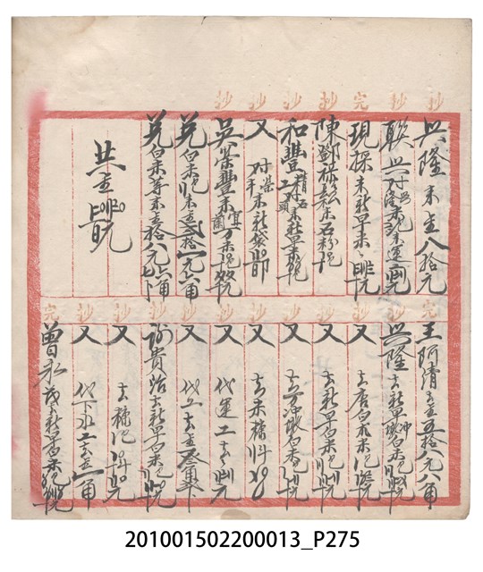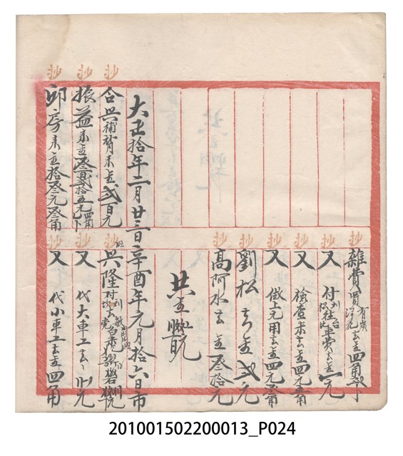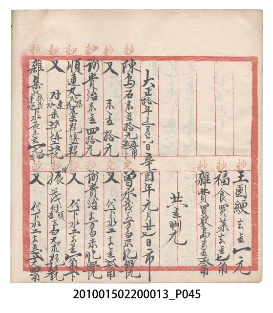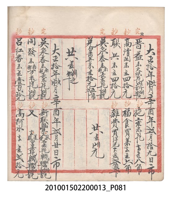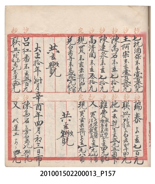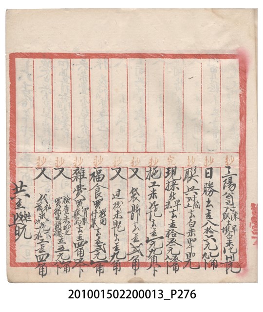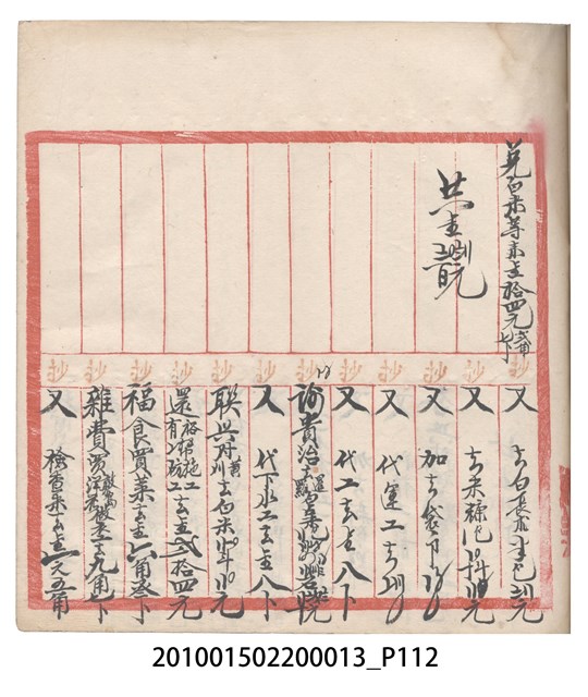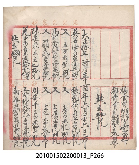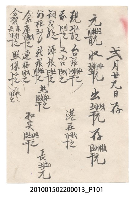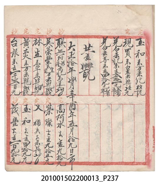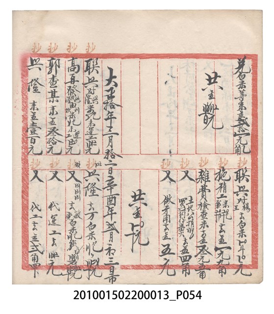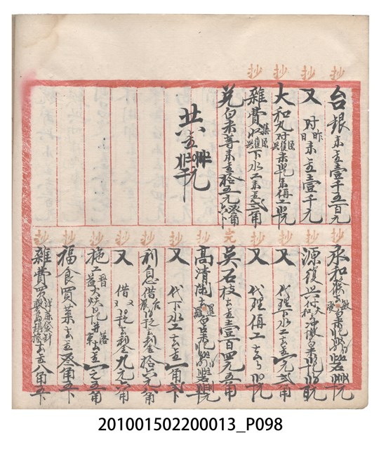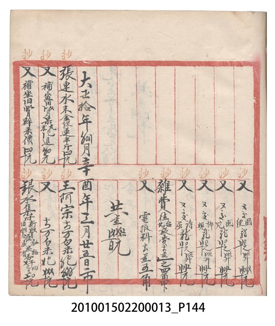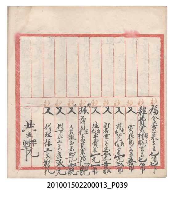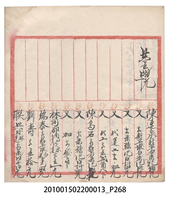 本物件為瑞興大正拾年辛酉苐首部日清,該書以棉線裝訂,封面、封底均藍色,頂邊題有瑞興大正拾年辛酉苐首部日清字樣,內容涵蓋首行瑞興號大正拾年歲次辛酉年孟春月立首部日清 承庚申年苐弍部日清尾存金499元●● 大正10年2月8日辛酉年元月初一日市上欄收入兌白米費用;下欄共吉。大正10年2月9日辛酉年元月初二日市上欄收入兌白米費用;下欄共吉。大正10年2月11日辛酉年元月初四日市上欄收入瑞泰、兌白米等費用;下欄支出彭在、雜費等費用。大正10年2月12日辛酉年元月初五日市上欄收入郭查某、張呆、邱房等費用;下欄支出郭查某、張呆、高清閑等費用。總計原金、收金、出金、存金 承過苐弍部日清簿。