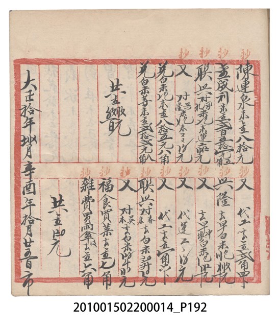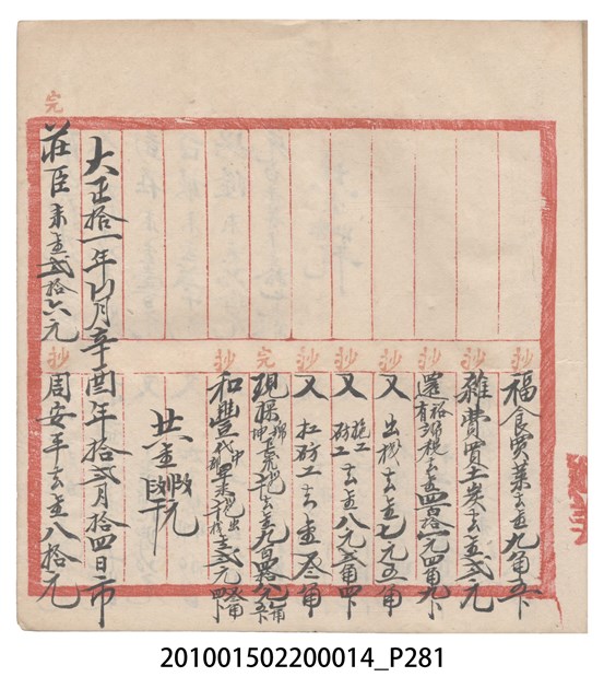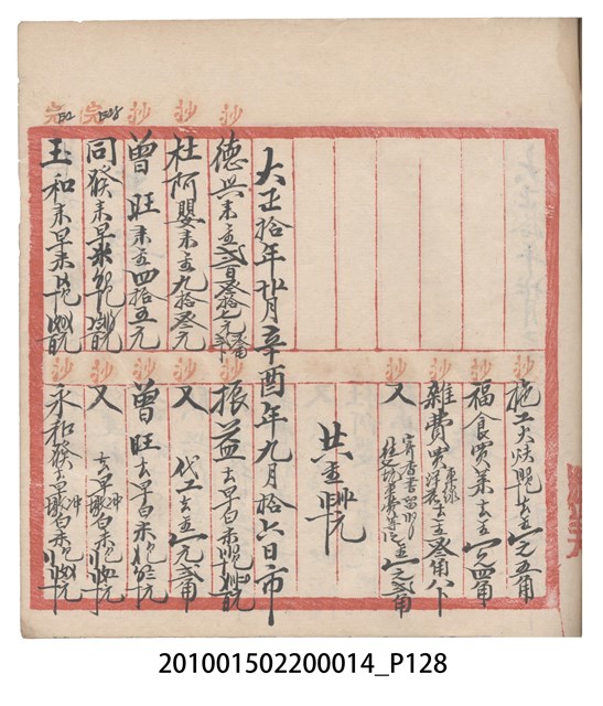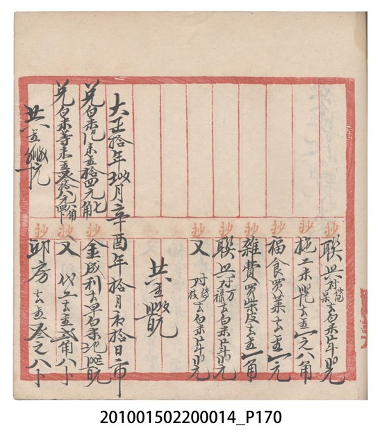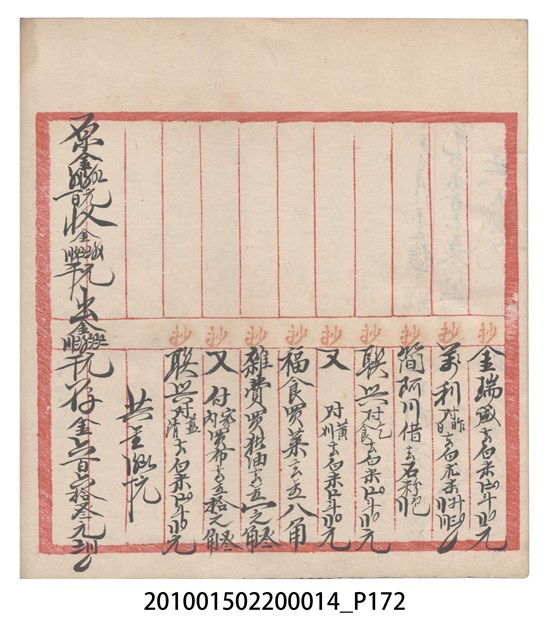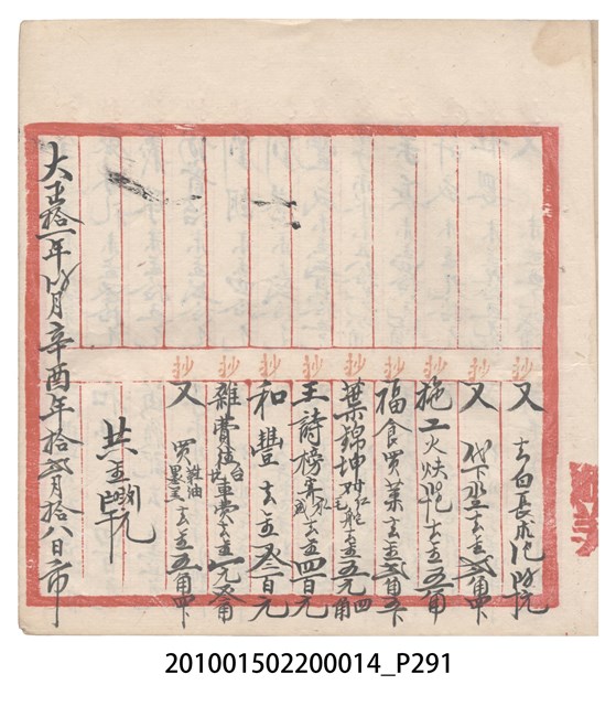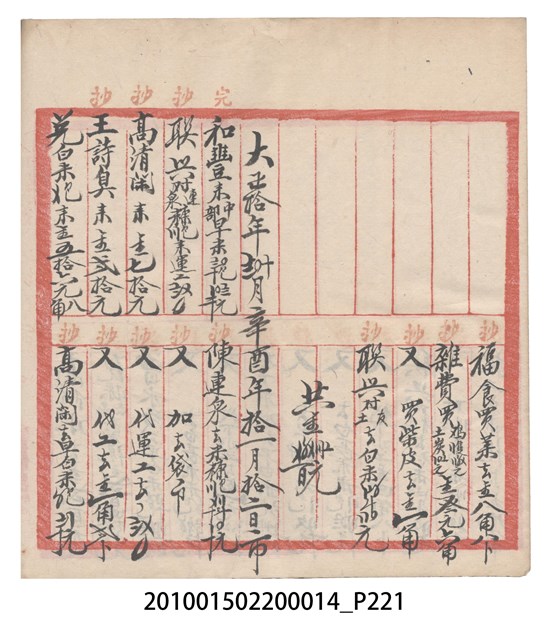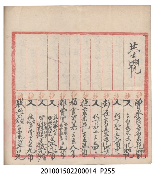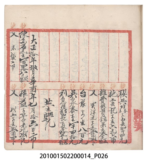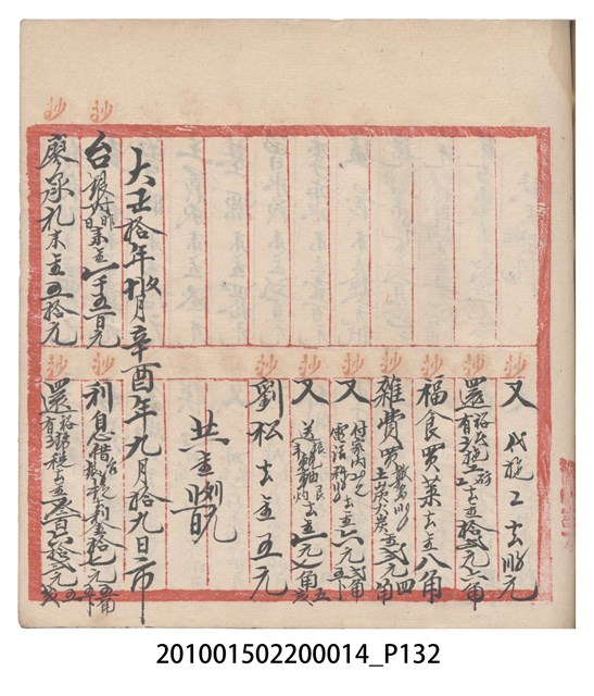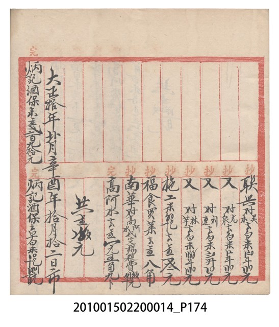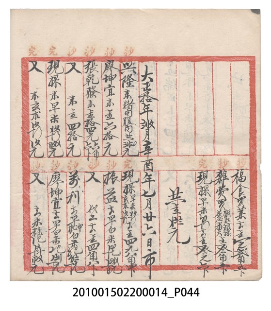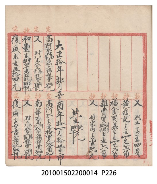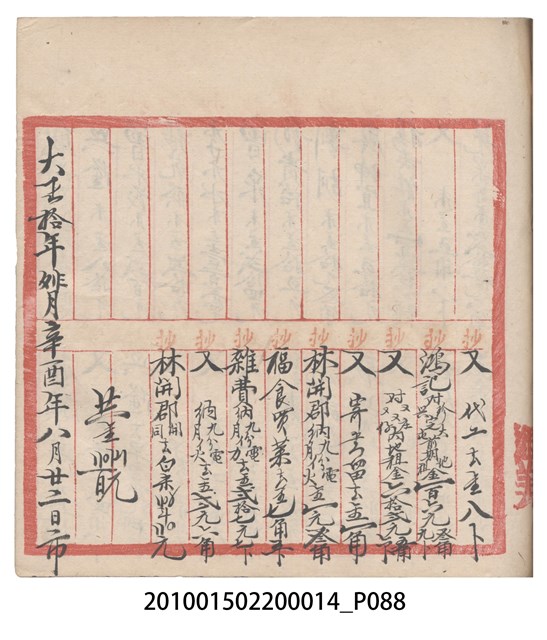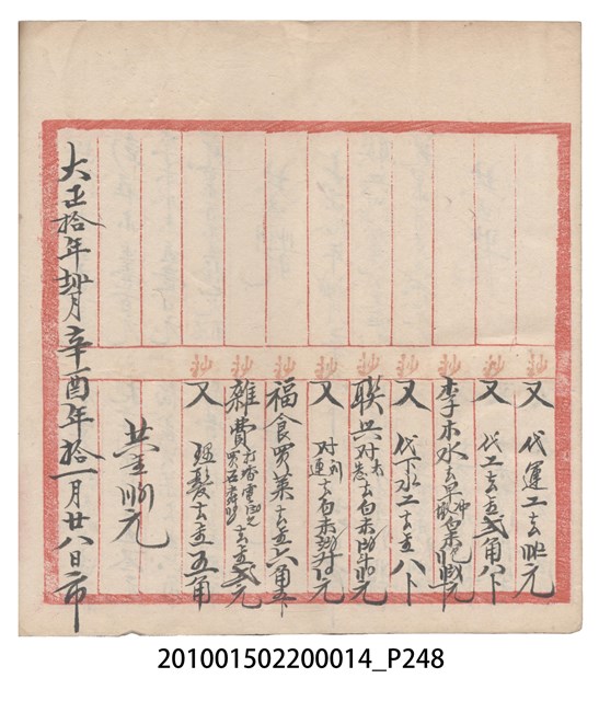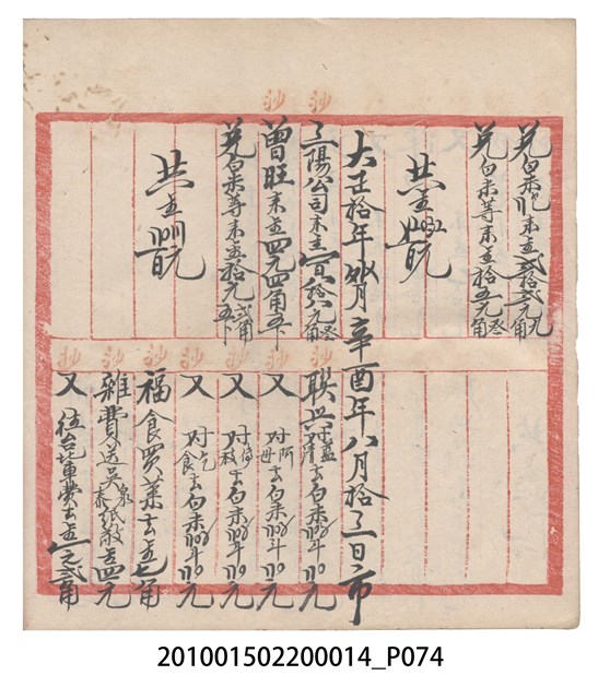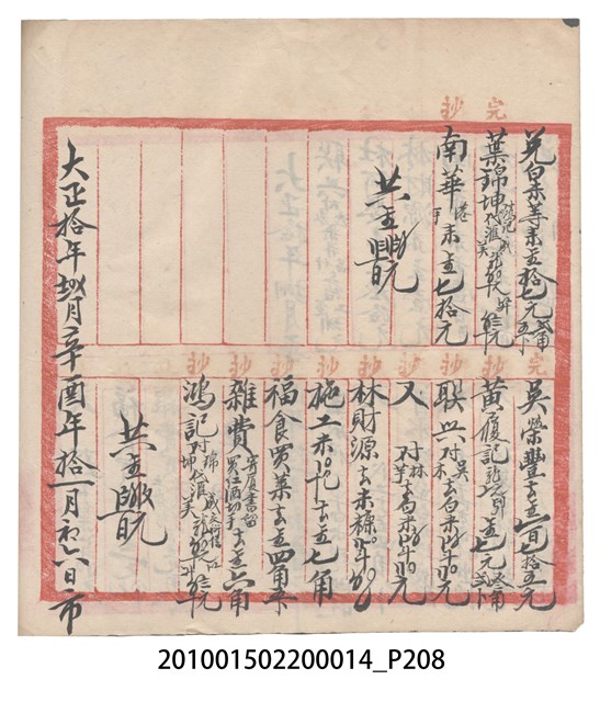 本物件為瑞興大正拾年辛酉苐首部日清,該書以棉線裝訂,封面、封底均藍色,頂邊題有瑞興大正拾年辛酉苐首部日清字樣,內容涵蓋首行瑞興號大正拾年歲次辛酉年孟秋月立苐弍部日清 承首部日清尾存金669元●● 大正10年●月辛酉年七月初五日市上欄收入聯興、何亶聰、曾泉等費用;下欄支出振益、何亶聰、彭在等費用。大正10年●月辛酉年七月初六日市。[夾紙] 現日收、出,元侵、收、出、存,現等費用。 上欄收入劉國、豐隆等費用;下欄支出賞家內、買柑仔等費用。
