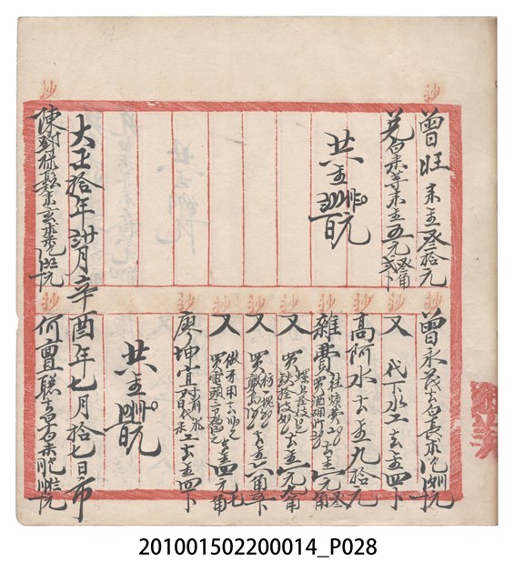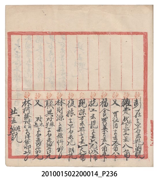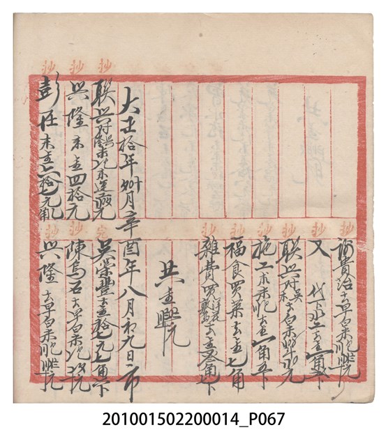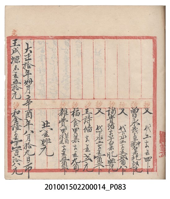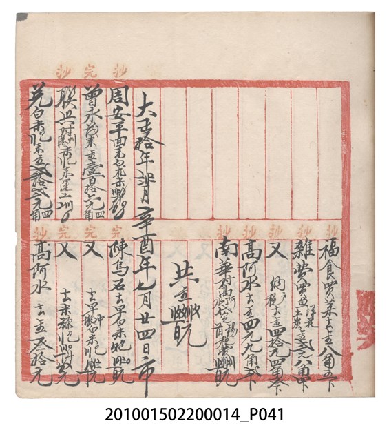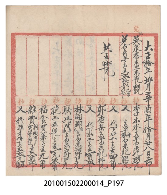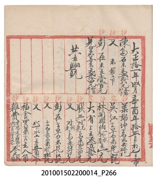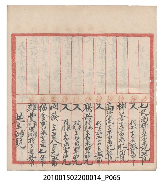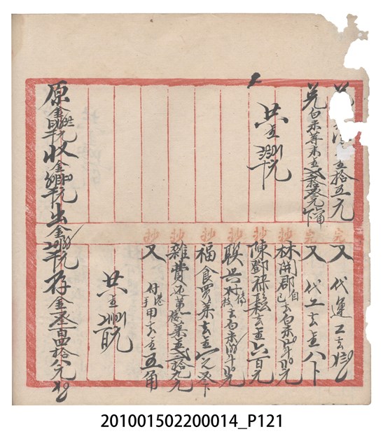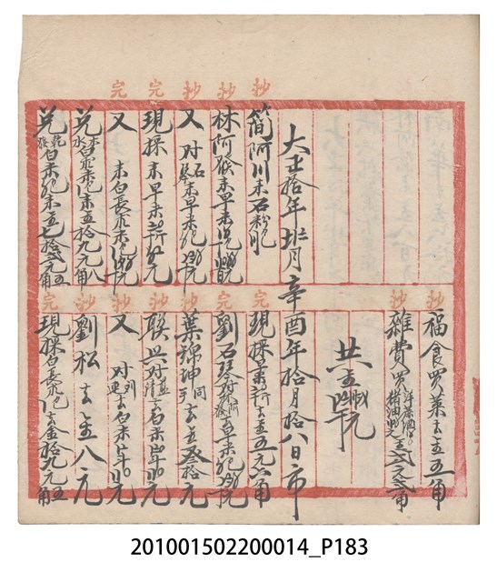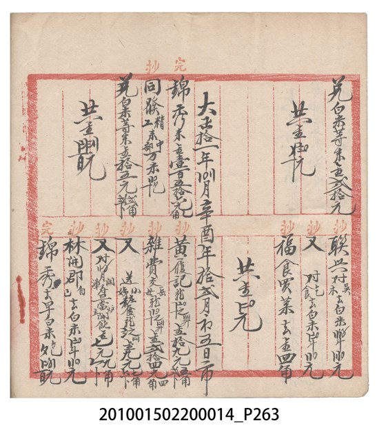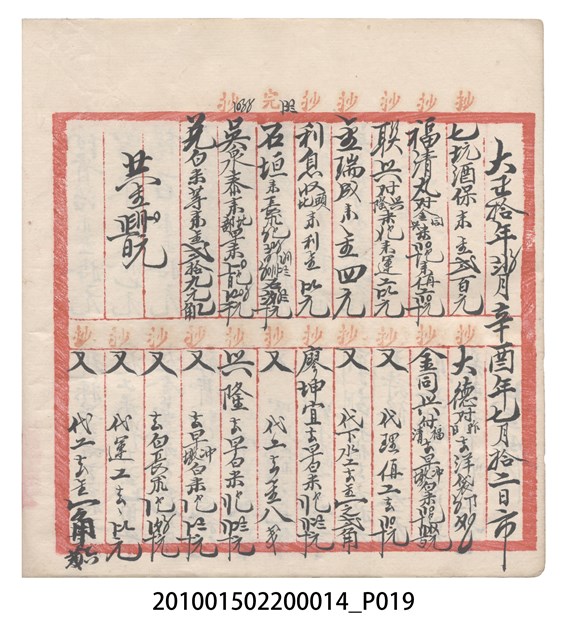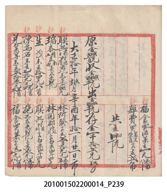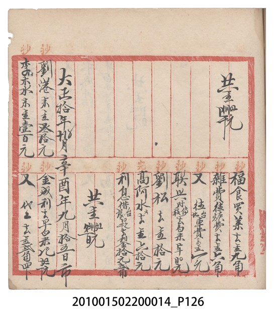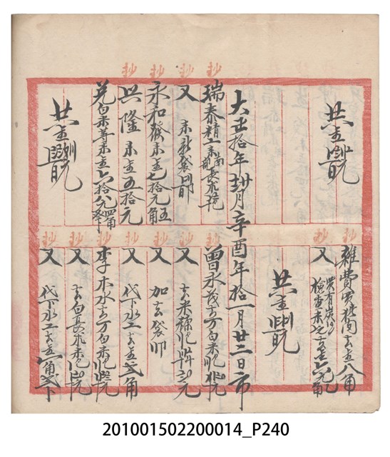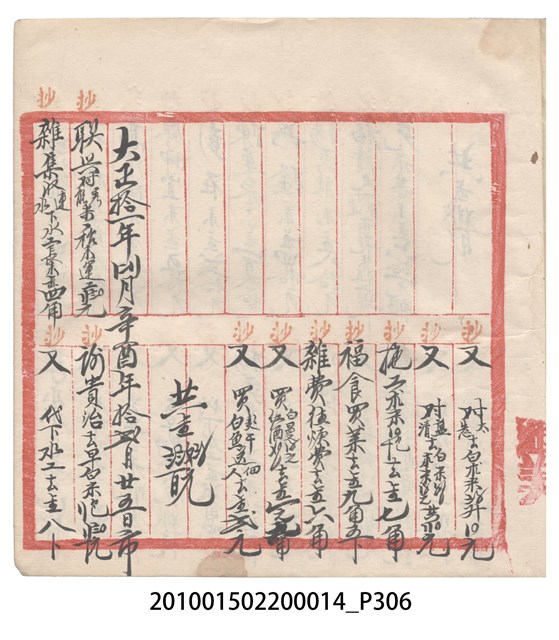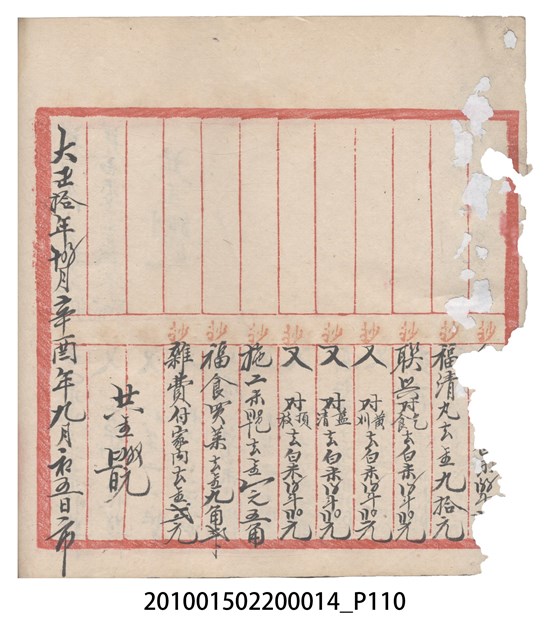 本物件為瑞興大正拾年辛酉苐首部日清,該書以棉線裝訂,封面、封底均藍色,頂邊題有瑞興大正拾年辛酉苐首部日清字樣,內容涵蓋首行瑞興號大正拾年歲次辛酉年孟秋月立苐弍部日清 承首部日清尾存金669元●● 大正10年●月辛酉年七月初五日市上欄收入聯興、何亶聰、曾泉等費用;下欄支出振益、何亶聰、彭在等費用。大正10年●月辛酉年七月初六日市。[夾紙] 現日收、出,元侵、收、出、存,現等費用。 上欄收入劉國、豐隆等費用;下欄支出賞家內、買柑仔等費用。