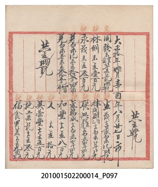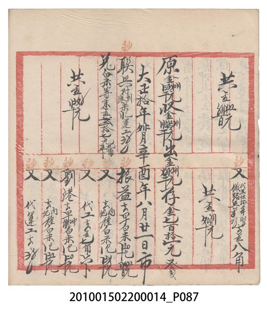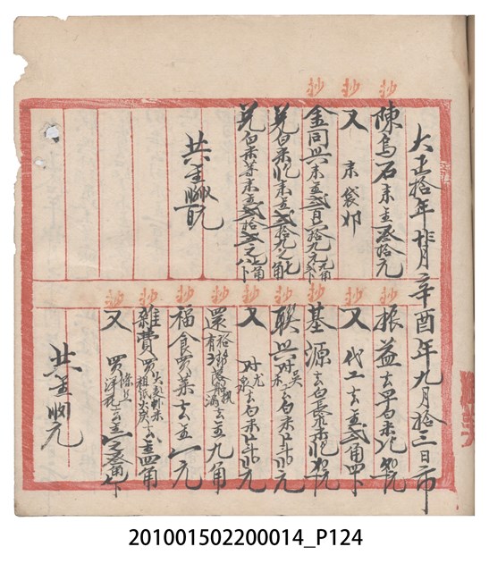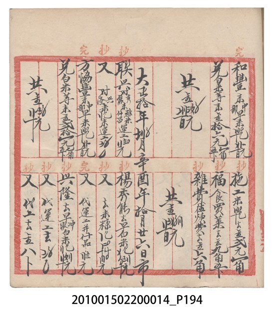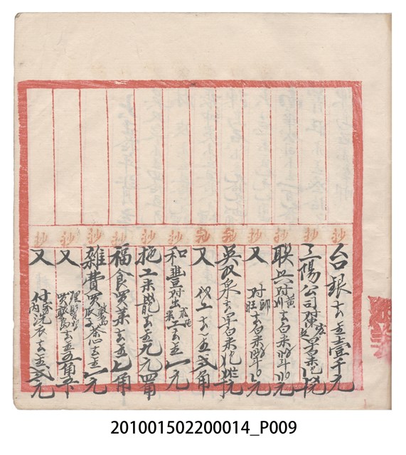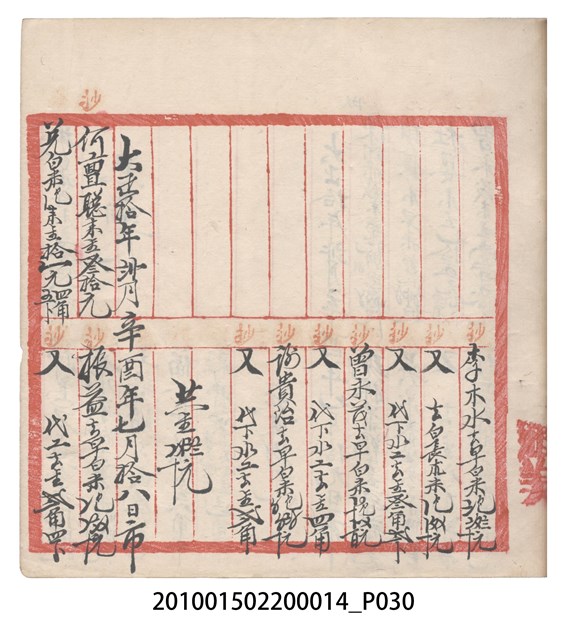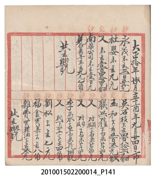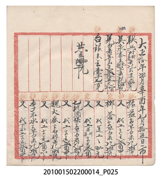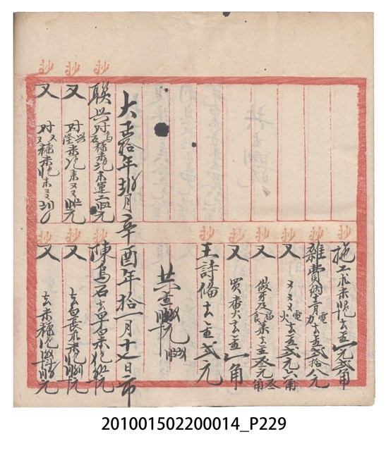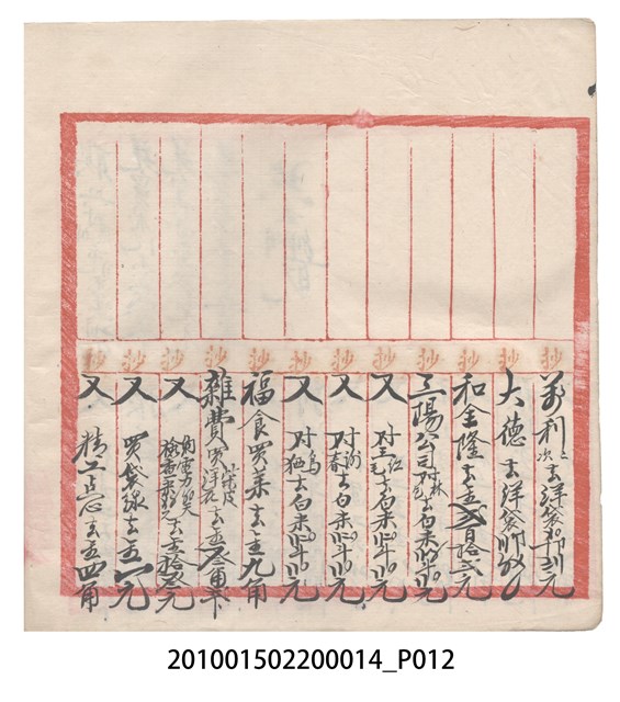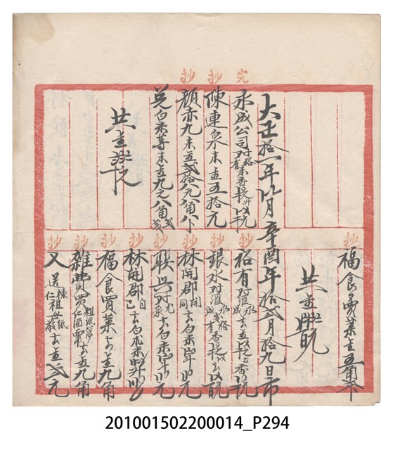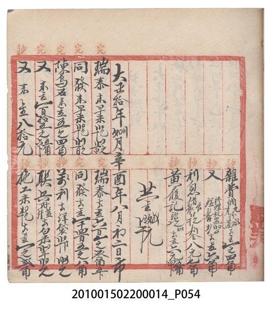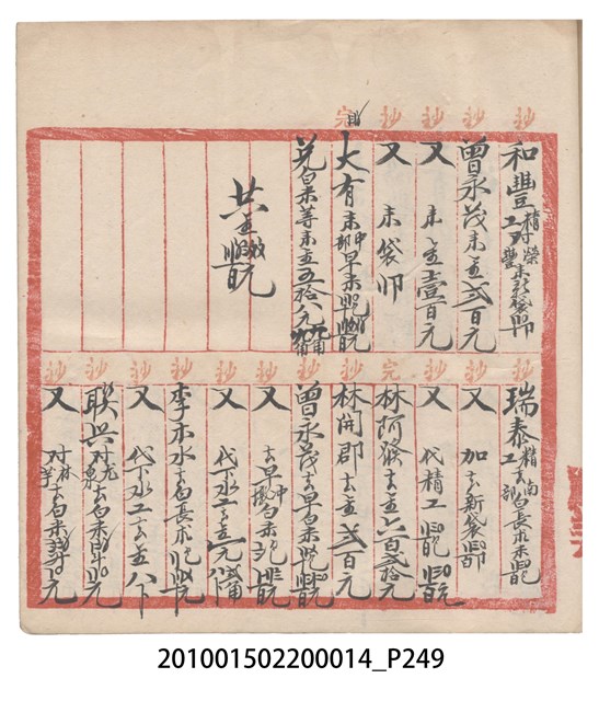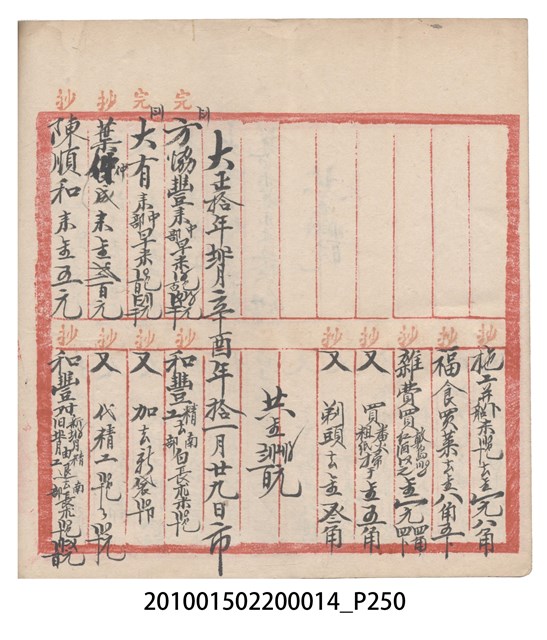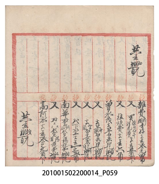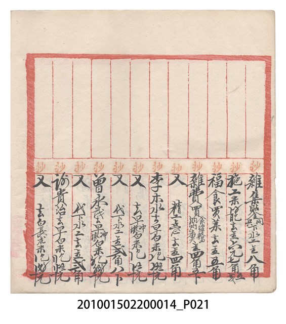 本物件為瑞興大正拾年辛酉苐首部日清,該書以棉線裝訂,封面、封底均藍色,頂邊題有瑞興大正拾年辛酉苐首部日清字樣,內容涵蓋首行瑞興號大正拾年歲次辛酉年孟秋月立苐弍部日清 承首部日清尾存金669元●● 大正10年●月辛酉年七月初五日市上欄收入聯興、何亶聰、曾泉等費用;下欄支出振益、何亶聰、彭在等費用。大正10年●月辛酉年七月初六日市。[夾紙] 現日收、出,元侵、收、出、存,現等費用。 上欄收入劉國、豐隆等費用;下欄支出賞家內、買柑仔等費用。