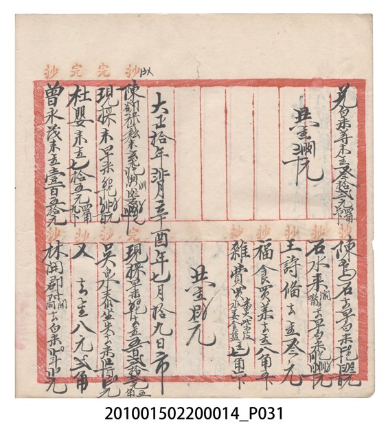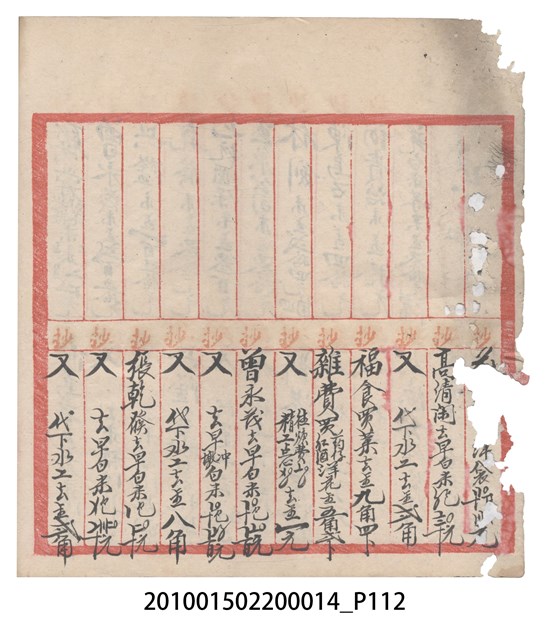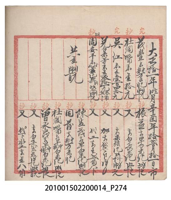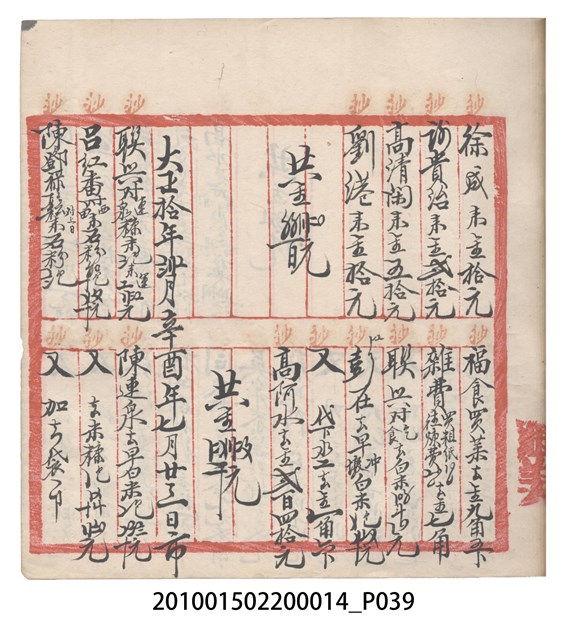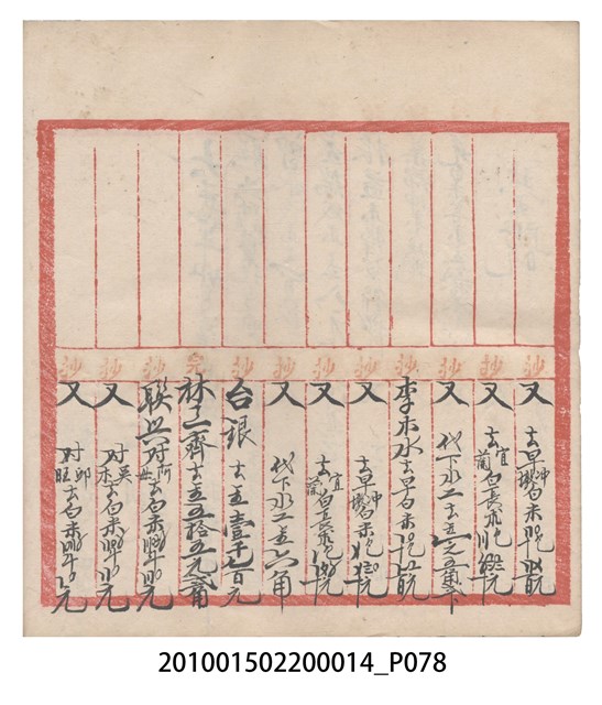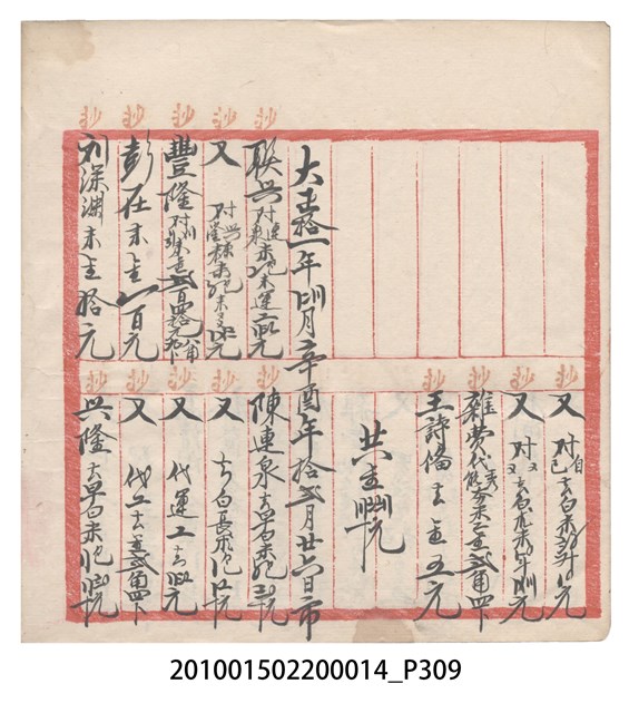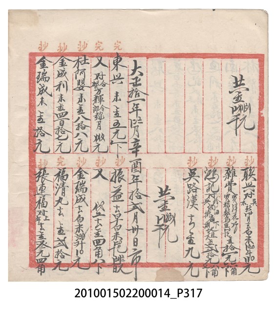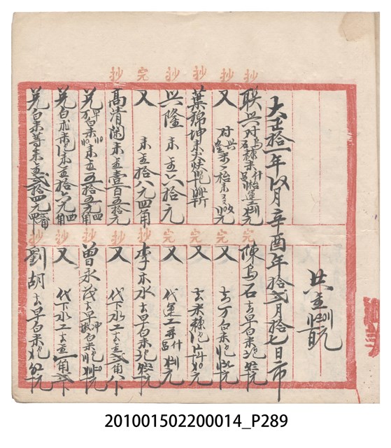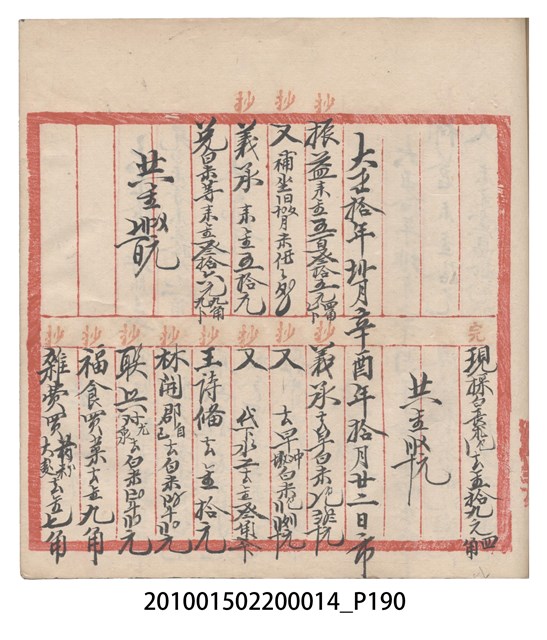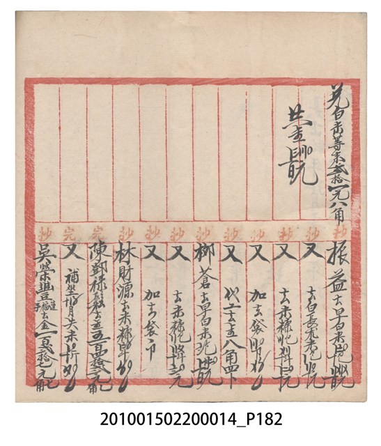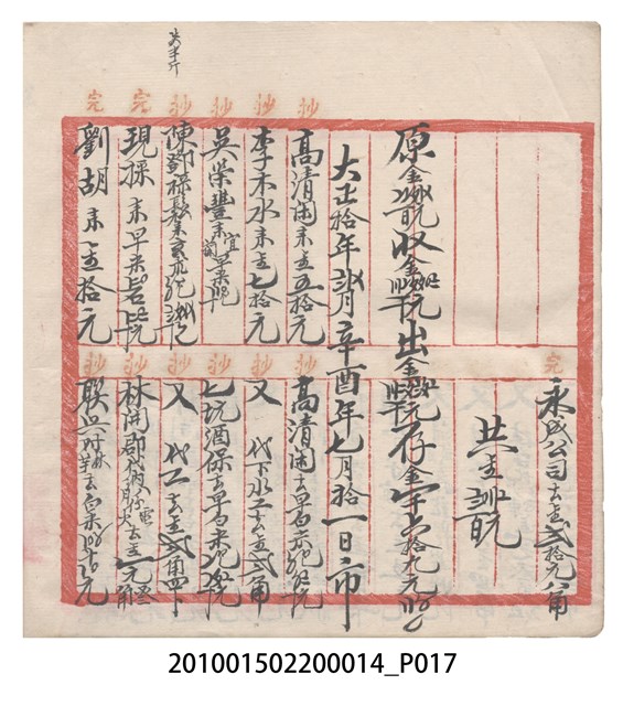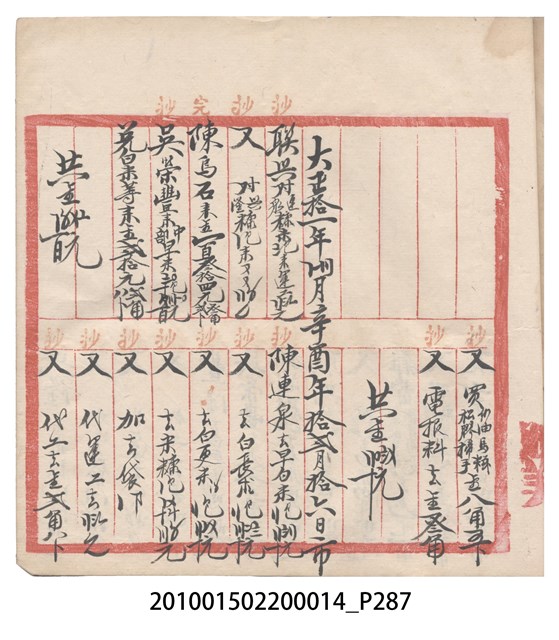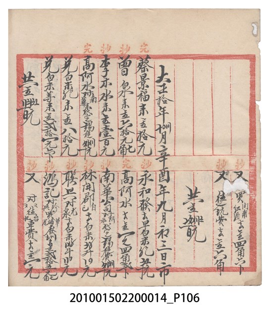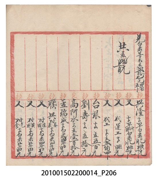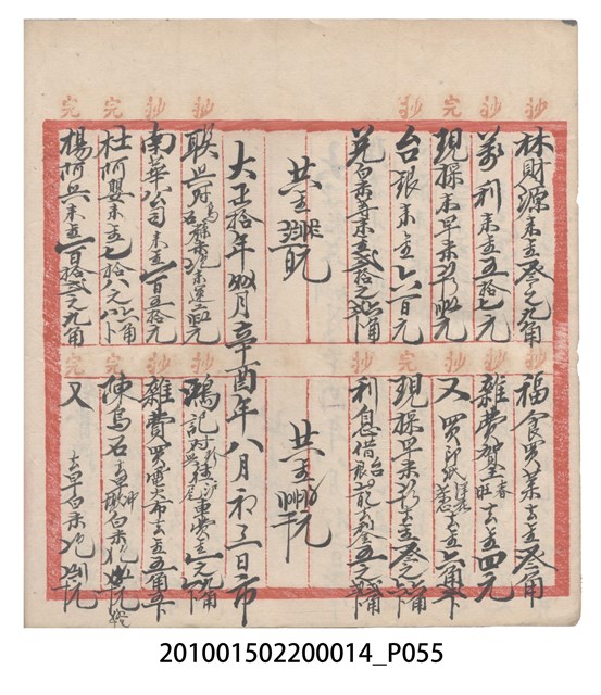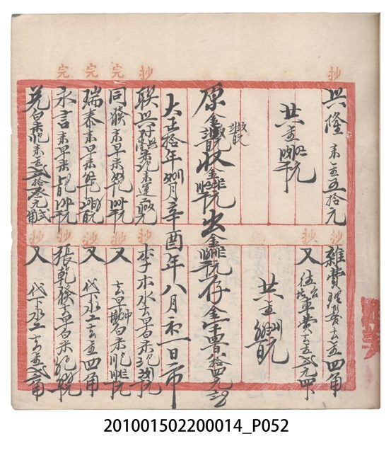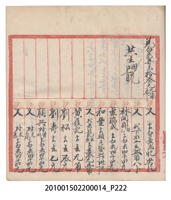 本物件為瑞興大正拾年辛酉苐首部日清,該書以棉線裝訂,封面、封底均藍色,頂邊題有瑞興大正拾年辛酉苐首部日清字樣,內容涵蓋首行瑞興號大正拾年歲次辛酉年孟秋月立苐弍部日清 承首部日清尾存金669元●● 大正10年●月辛酉年七月初五日市上欄收入聯興、何亶聰、曾泉等費用;下欄支出振益、何亶聰、彭在等費用。大正10年●月辛酉年七月初六日市。[夾紙] 現日收、出,元侵、收、出、存,現等費用。 上欄收入劉國、豐隆等費用;下欄支出賞家內、買柑仔等費用。