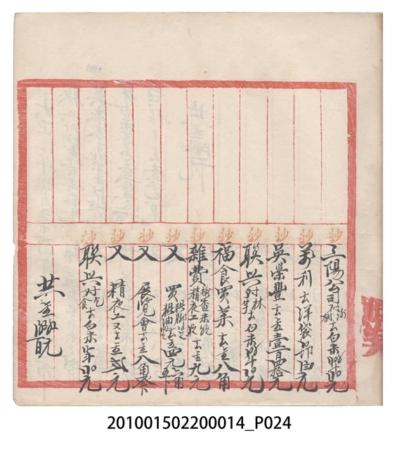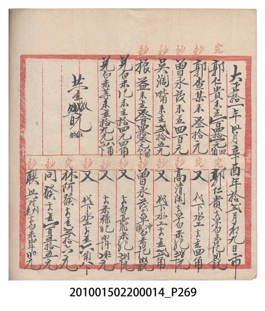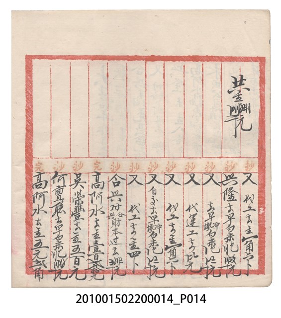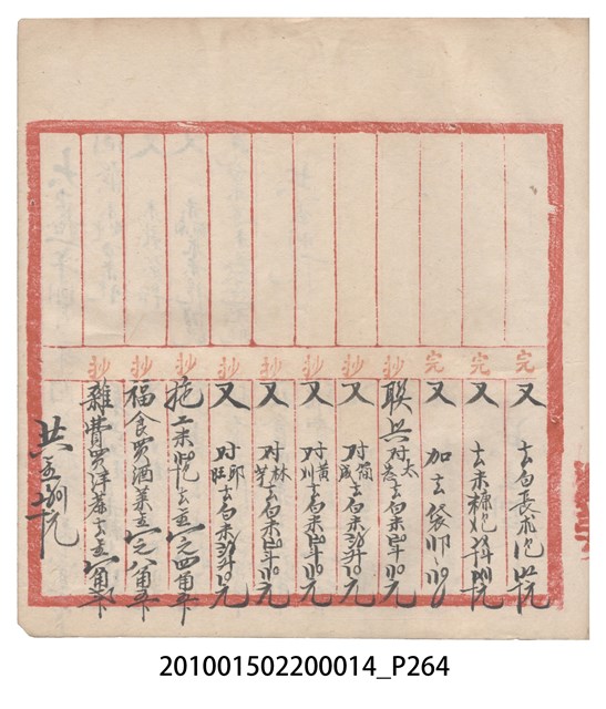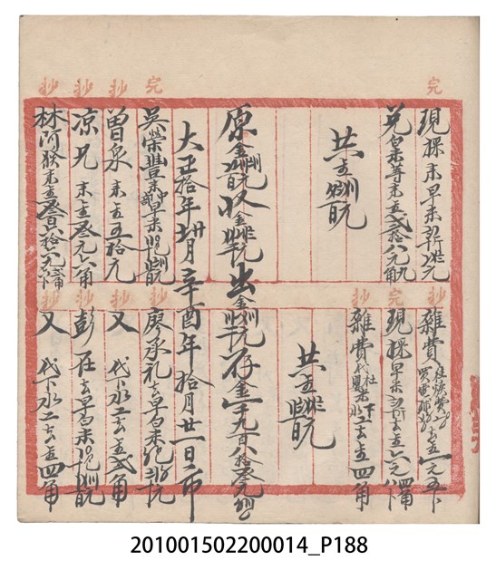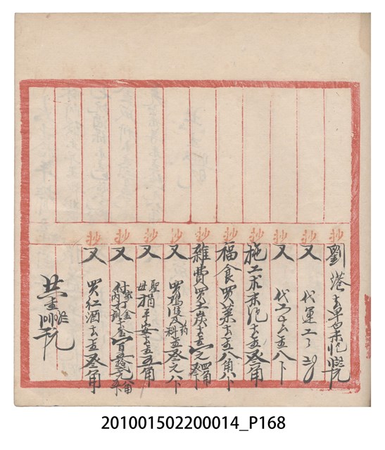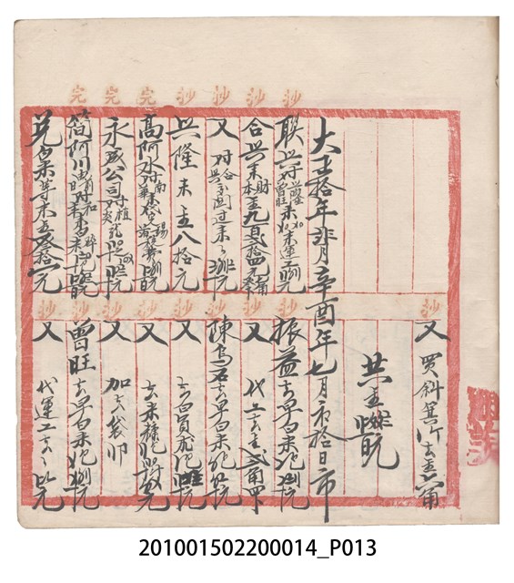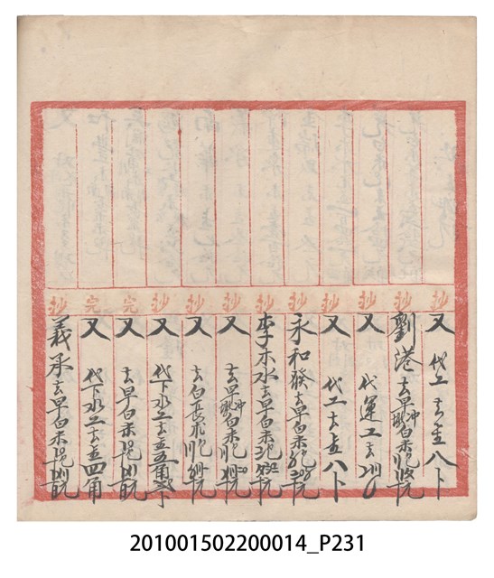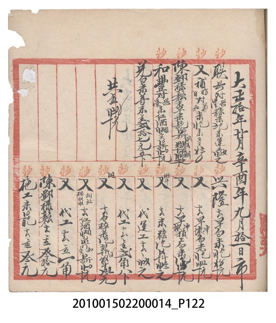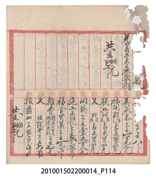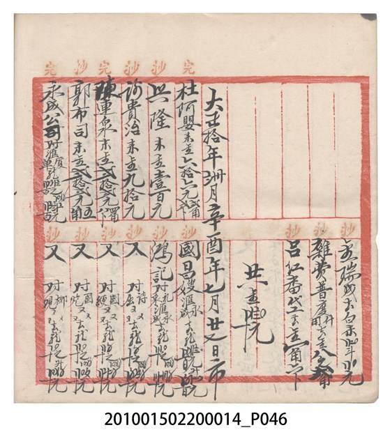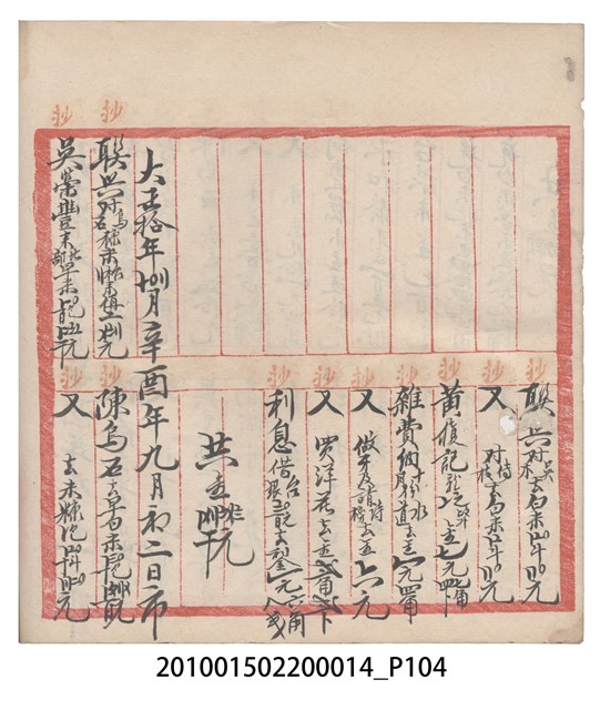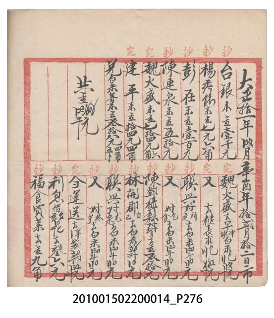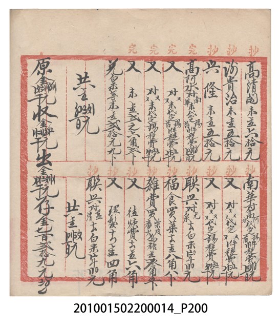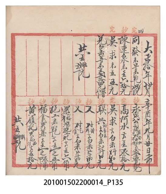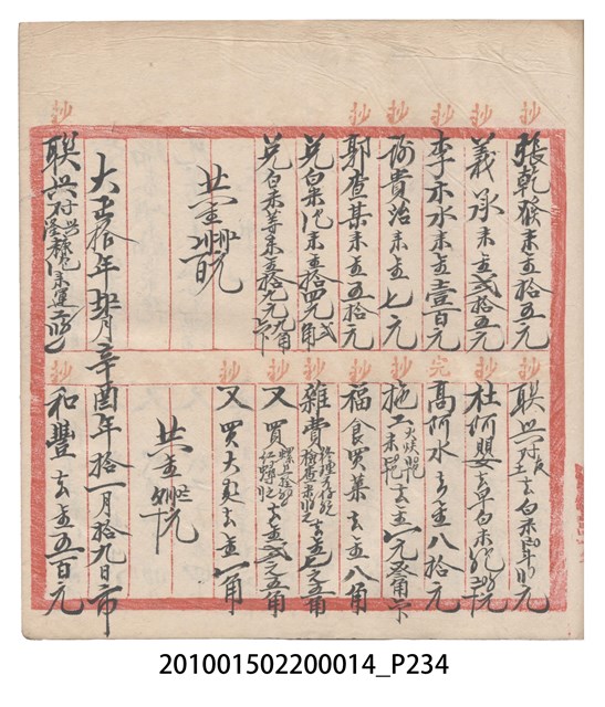 本物件為瑞興大正拾年辛酉苐首部日清,該書以棉線裝訂,封面、封底均藍色,頂邊題有瑞興大正拾年辛酉苐首部日清字樣,內容涵蓋首行瑞興號大正拾年歲次辛酉年孟秋月立苐弍部日清 承首部日清尾存金669元●● 大正10年●月辛酉年七月初五日市上欄收入聯興、何亶聰、曾泉等費用;下欄支出振益、何亶聰、彭在等費用。大正10年●月辛酉年七月初六日市。[夾紙] 現日收、出,元侵、收、出、存,現等費用。 上欄收入劉國、豐隆等費用;下欄支出賞家內、買柑仔等費用。
