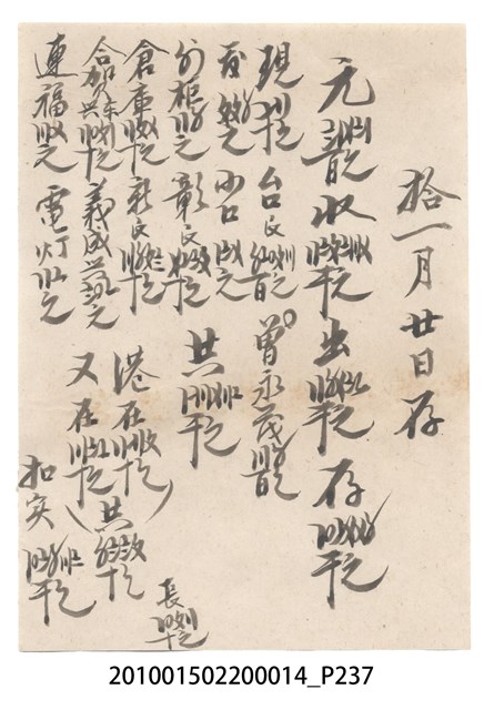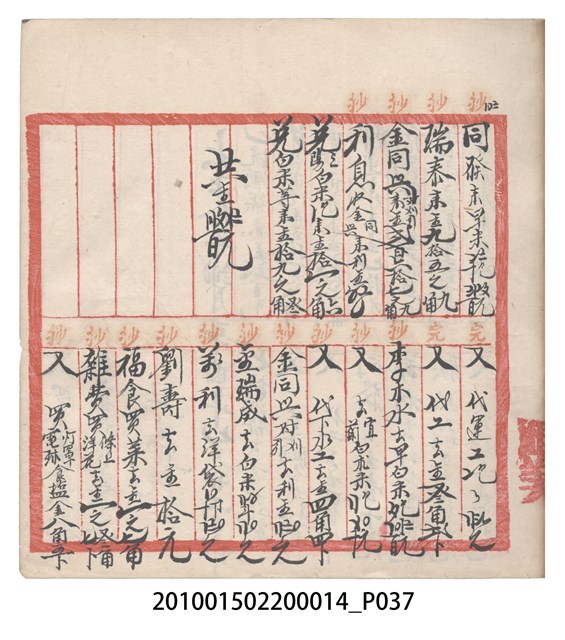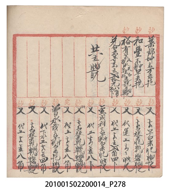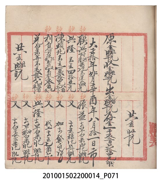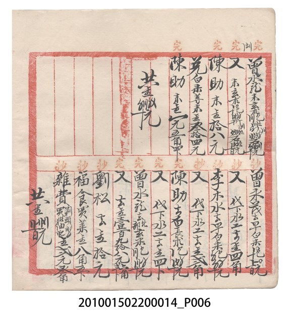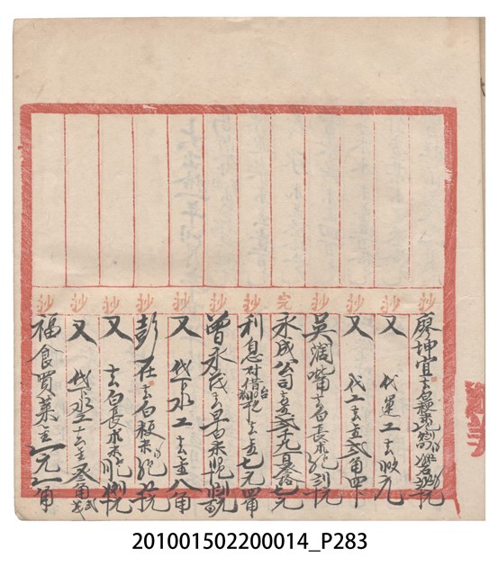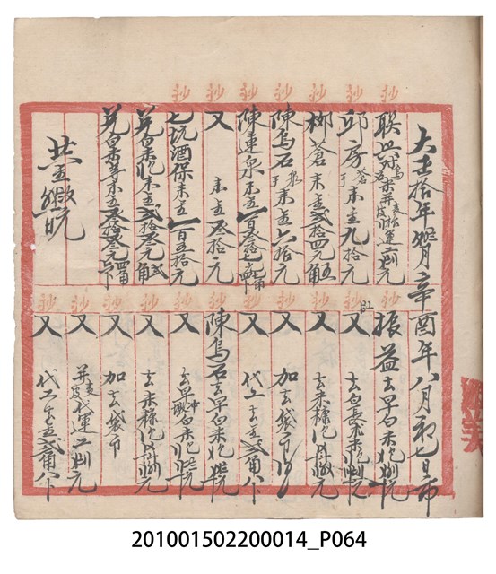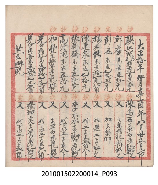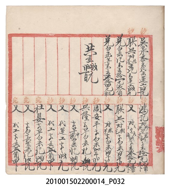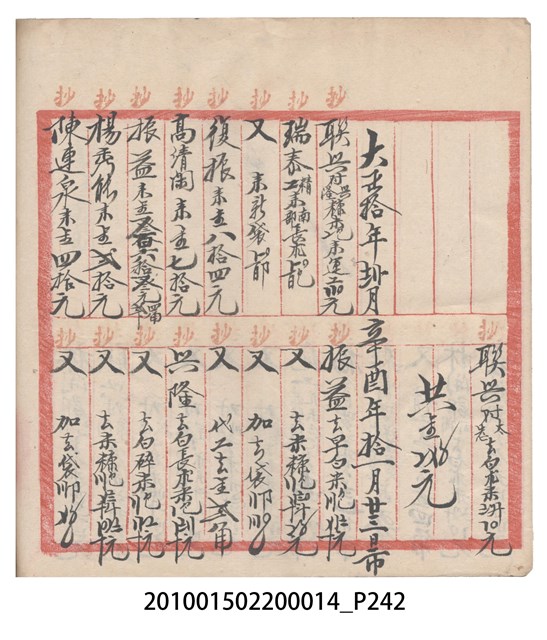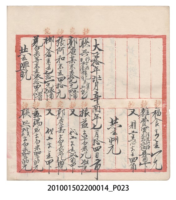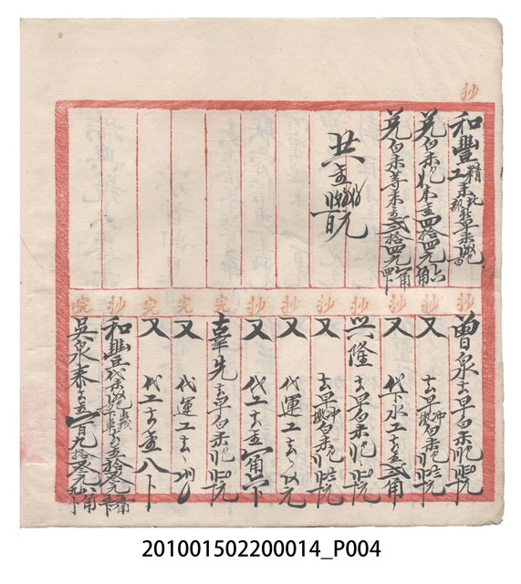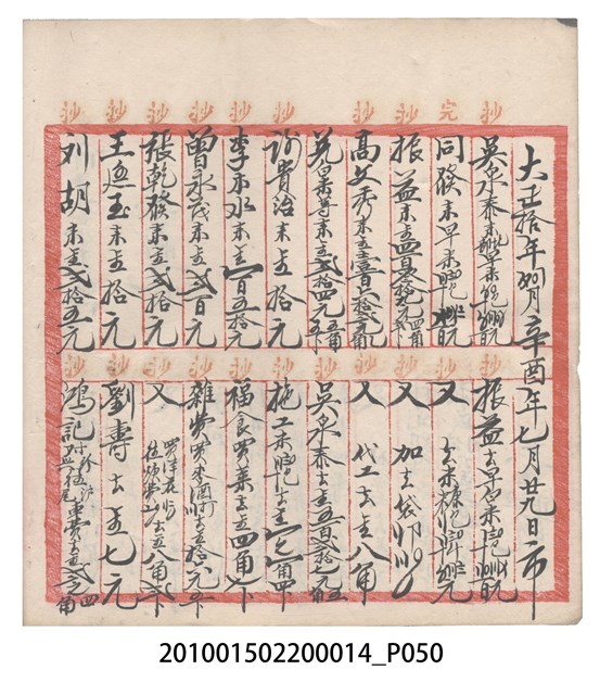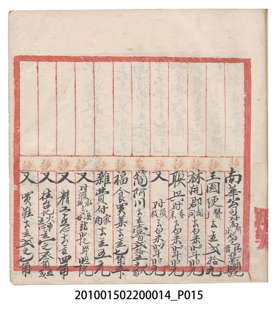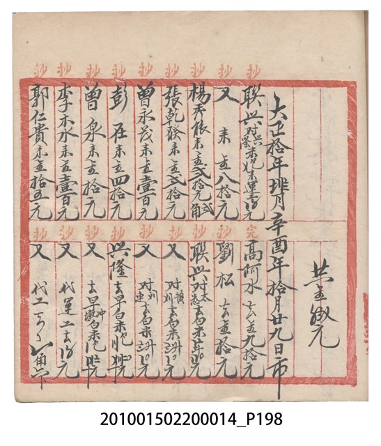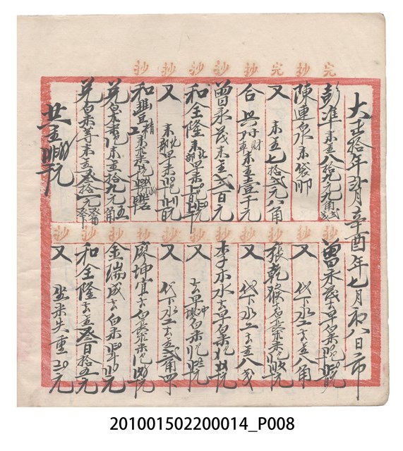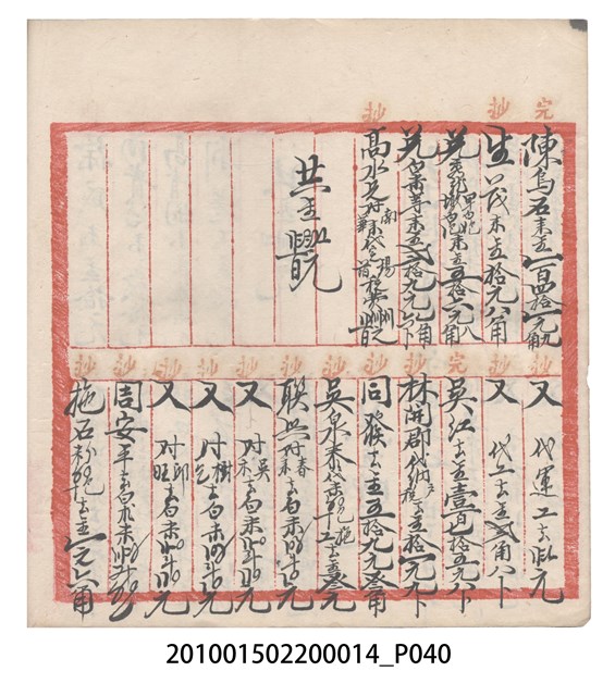 本物件為瑞興大正拾年辛酉苐首部日清,該書以棉線裝訂,封面、封底均藍色,頂邊題有瑞興大正拾年辛酉苐首部日清字樣,內容涵蓋首行瑞興號大正拾年歲次辛酉年孟秋月立苐弍部日清 承首部日清尾存金669元●● 大正10年●月辛酉年七月初五日市上欄收入聯興、何亶聰、曾泉等費用;下欄支出振益、何亶聰、彭在等費用。大正10年●月辛酉年七月初六日市。[夾紙] 現日收、出,元侵、收、出、存,現等費用。 上欄收入劉國、豐隆等費用;下欄支出賞家內、買柑仔等費用。