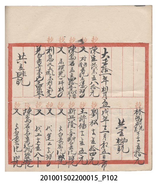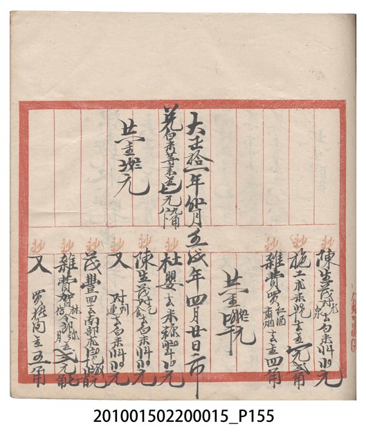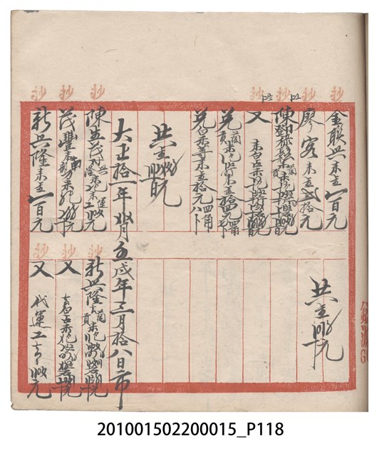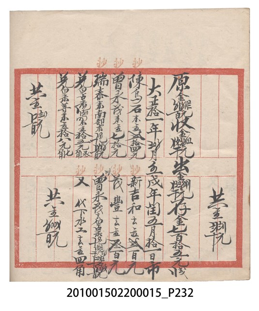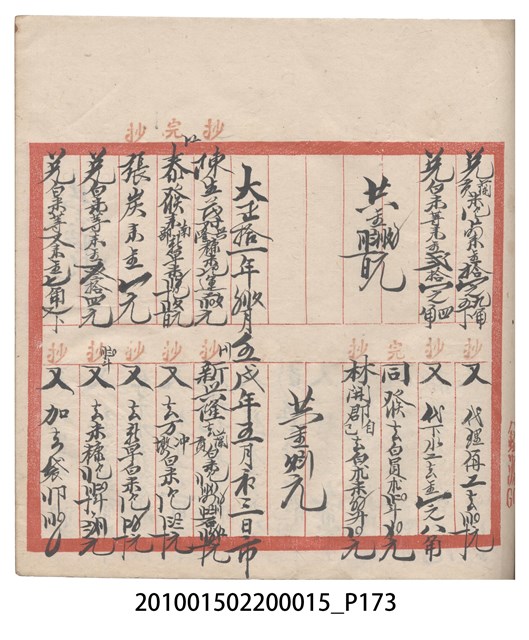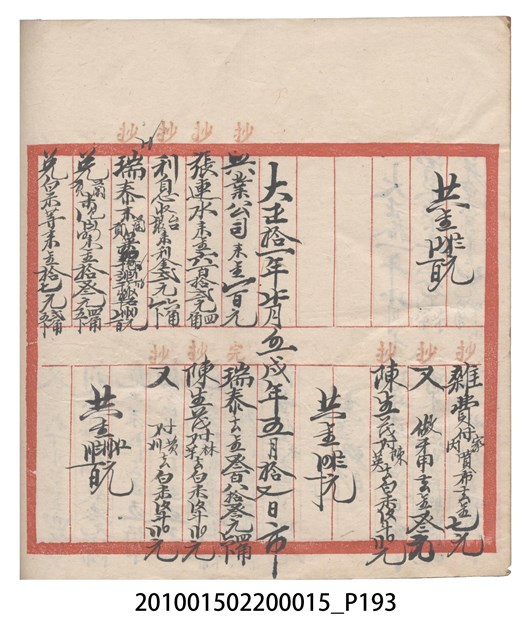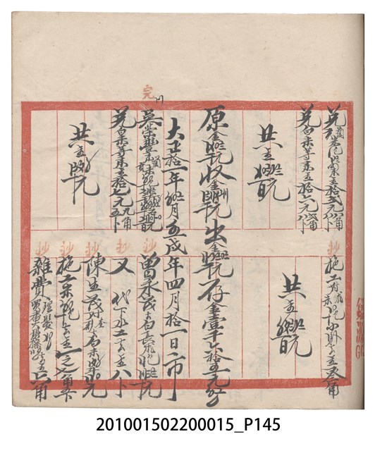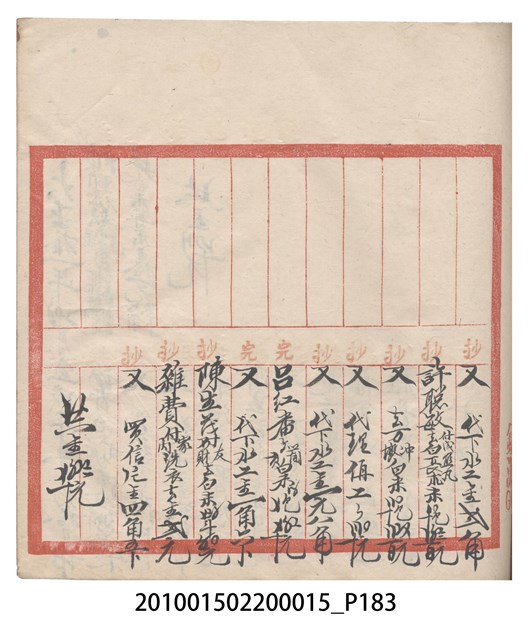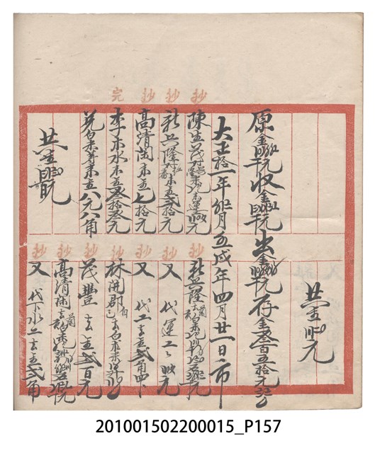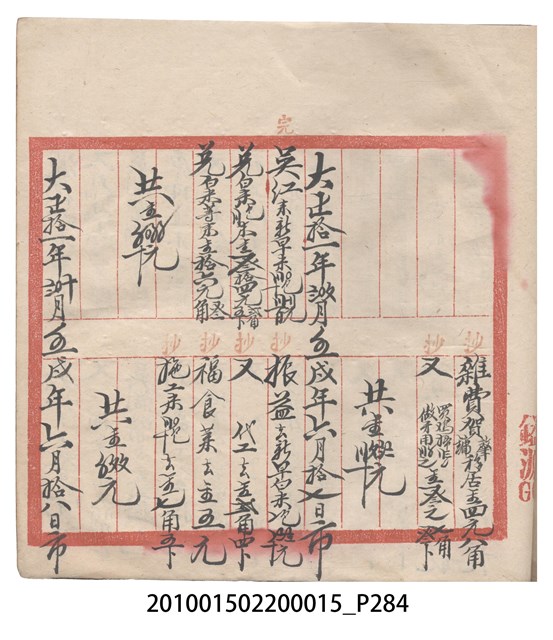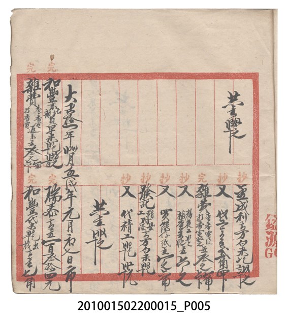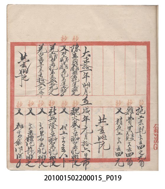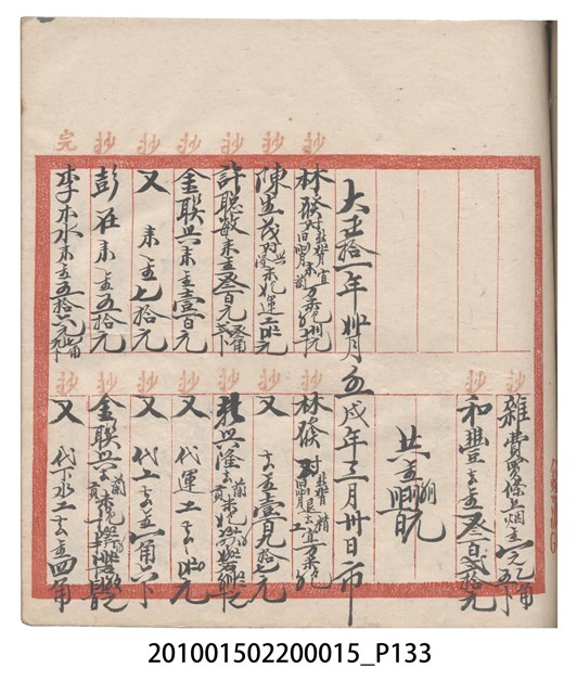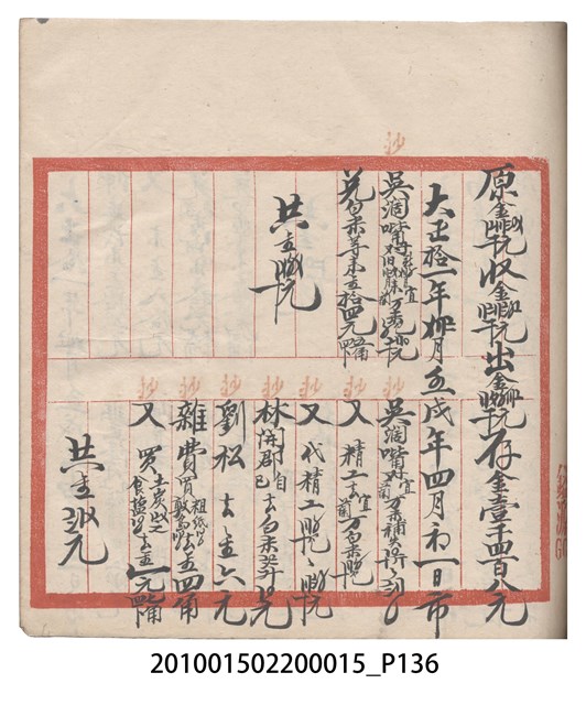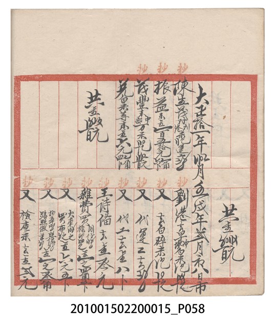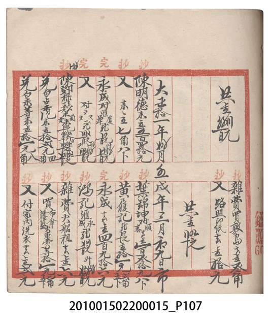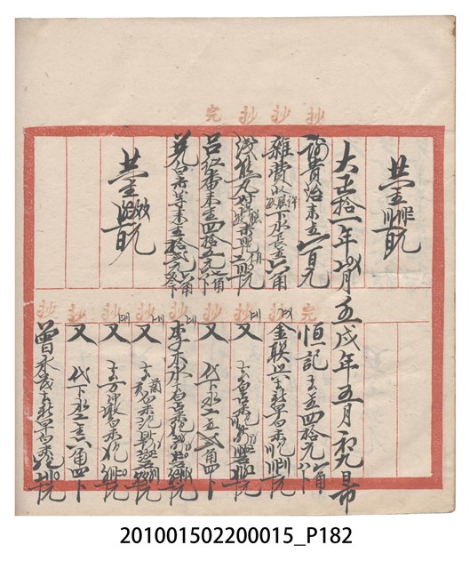 本物件為瑞興大正拾弍年癸亥苐首部日清,該書以棉線裝訂,封面、封底藍色,頂邊題有瑞興大正拾弍年癸亥苐首部日清字樣,內容涵蓋首行瑞興號大正拾弍年癸亥年孟春立首部日清 承壬戌年苐叁部日清 大正12年2月17日癸亥年元月初弍日大吉利市上欄收入彭在等費用;下欄支出林細、呂江番等費用。大正12年2月19日癸亥年元月初四日市上欄收入馥裕、陳烏石、呂阿慶等費用;下欄支出瑞泰、四元篤、拖工等費用。大正12年2月25日癸亥年元月初拾日市上欄收入黃氏粉、兑百米等費用;下欄支出呂江番、雜費等費用。大正12年2月26日癸亥年元月十一日上欄收入瑞泰、兑百米等費用;下欄支出郭查某、新興隆、曾泉、呂江番、拖工等費用。總計原、收金、出金、存 承過苐弍部日清簿。