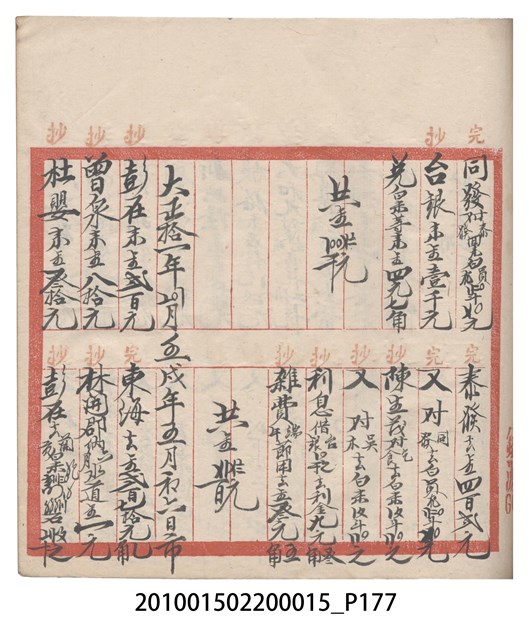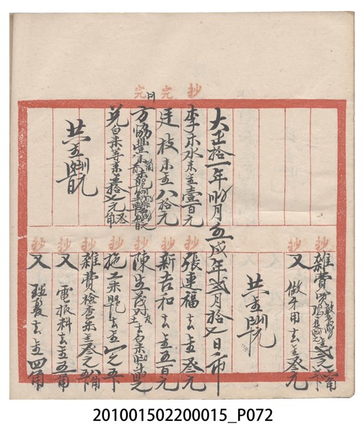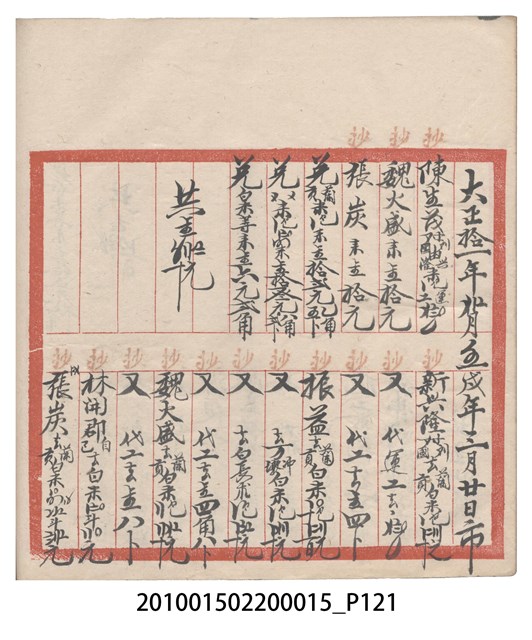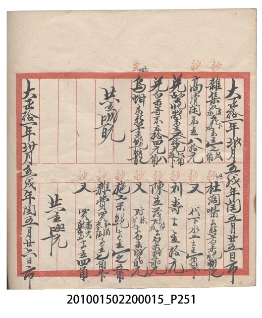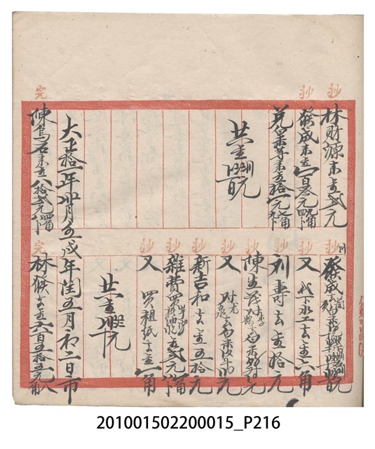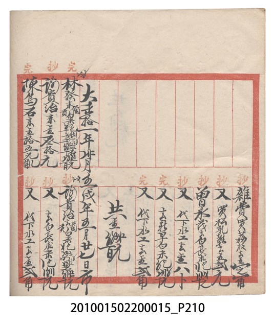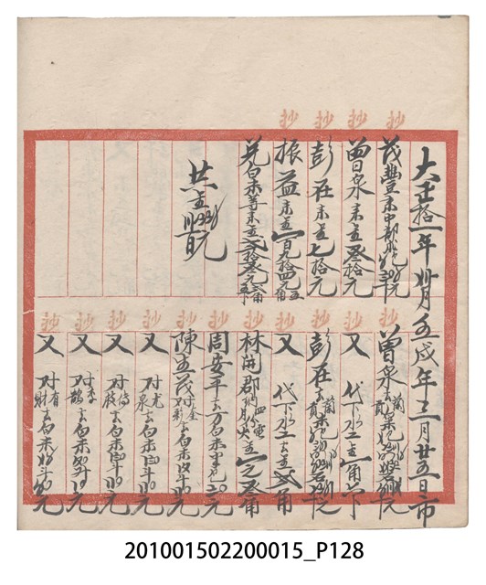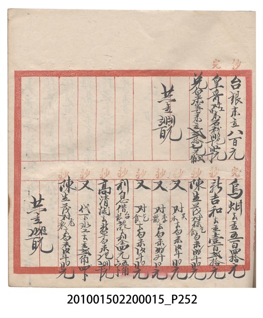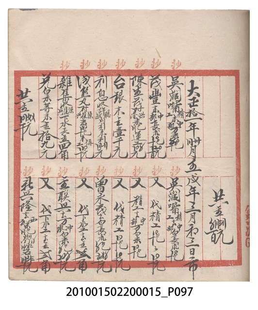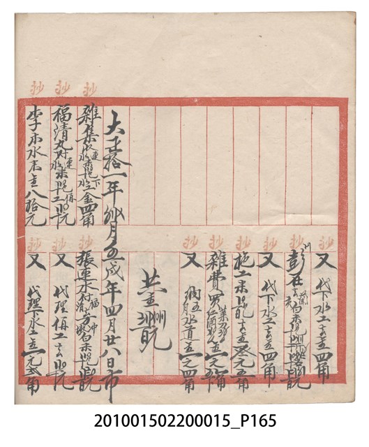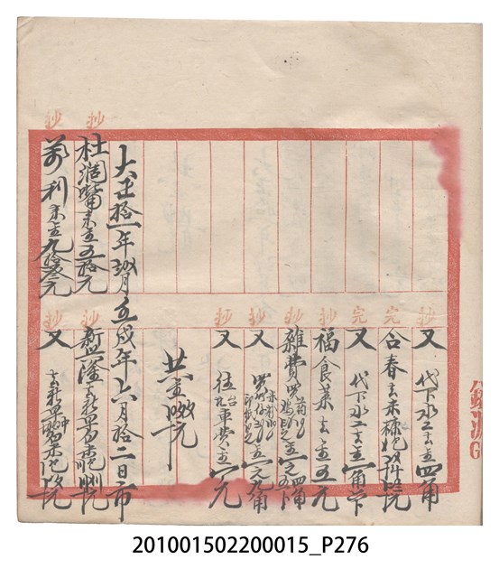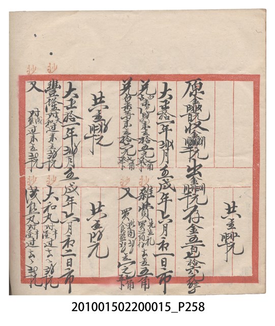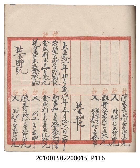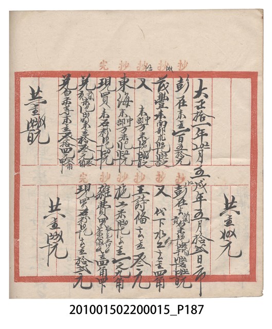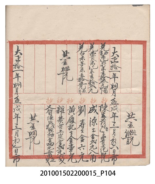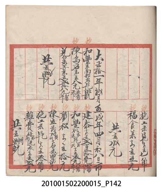 本物件為瑞興大正拾弍年癸亥苐首部日清,該書以棉線裝訂,封面、封底藍色,頂邊題有瑞興大正拾弍年癸亥苐首部日清字樣,內容涵蓋首行瑞興號大正拾弍年癸亥年孟春立首部日清 承壬戌年苐叁部日清 大正12年2月17日癸亥年元月初弍日大吉利市上欄收入彭在等費用;下欄支出林細、呂江番等費用。大正12年2月19日癸亥年元月初四日市上欄收入馥裕、陳烏石、呂阿慶等費用;下欄支出瑞泰、四元篤、拖工等費用。大正12年2月25日癸亥年元月初拾日市上欄收入黃氏粉、兑百米等費用;下欄支出呂江番、雜費等費用。大正12年2月26日癸亥年元月十一日上欄收入瑞泰、兑百米等費用;下欄支出郭查某、新興隆、曾泉、呂江番、拖工等費用。總計原、收金、出金、存 承過苐弍部日清簿。