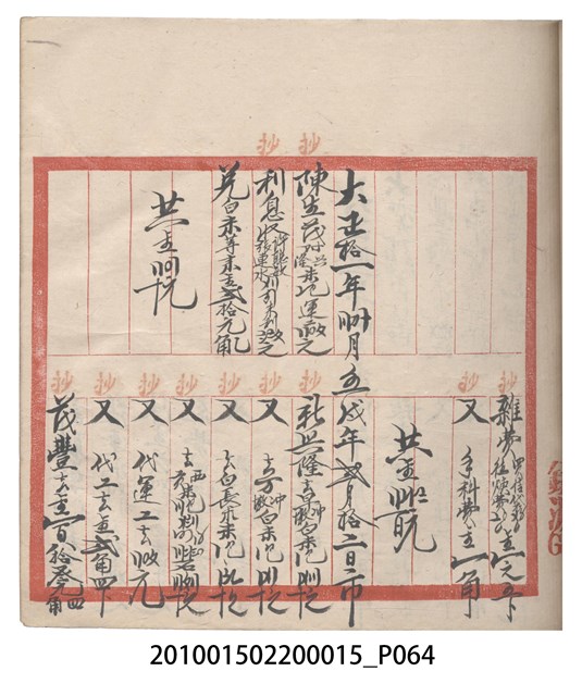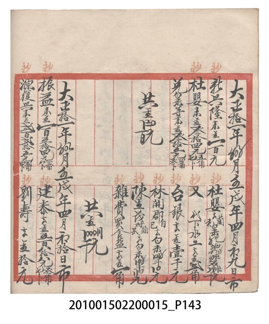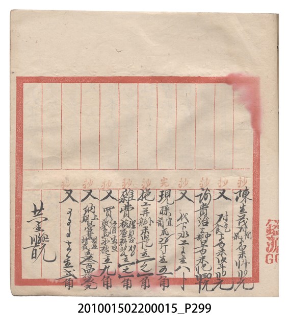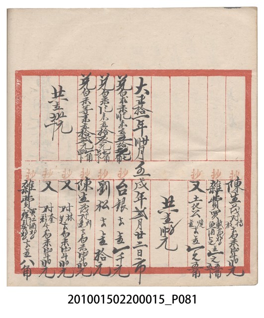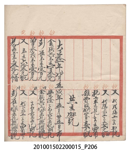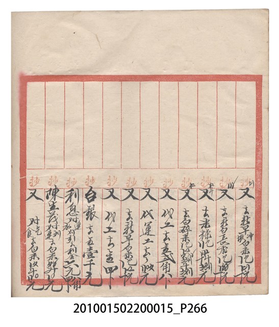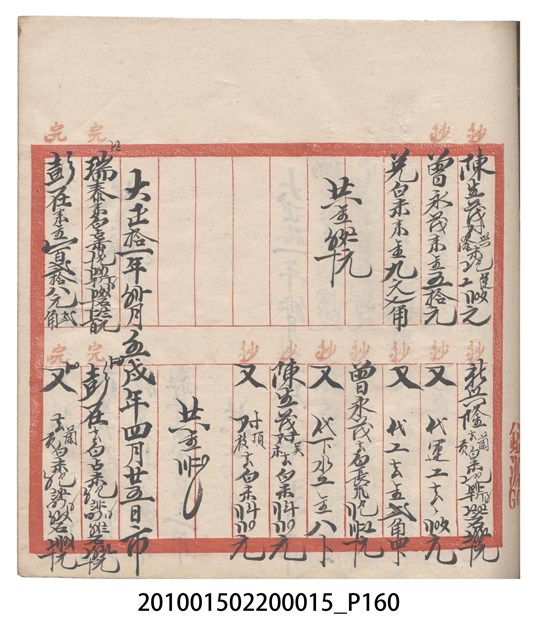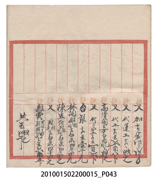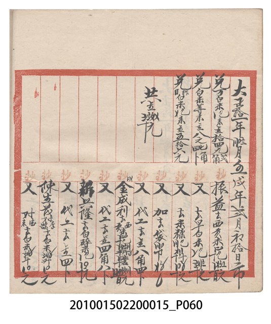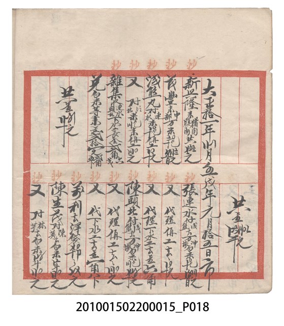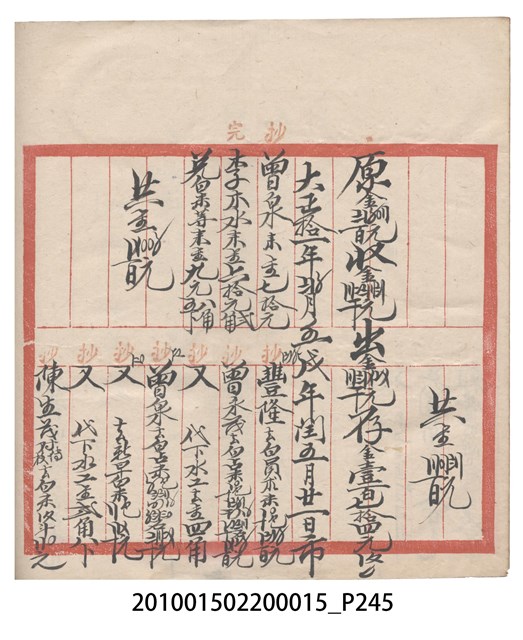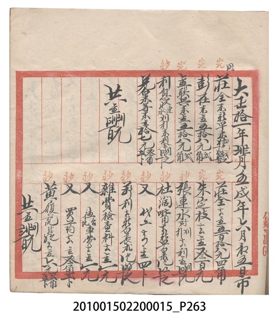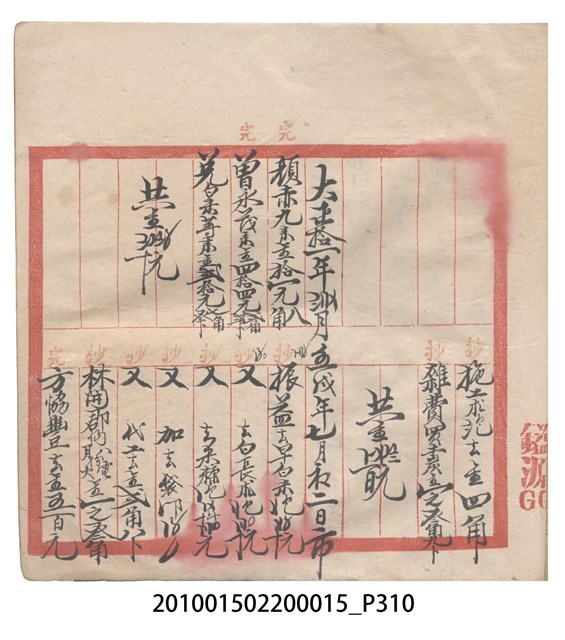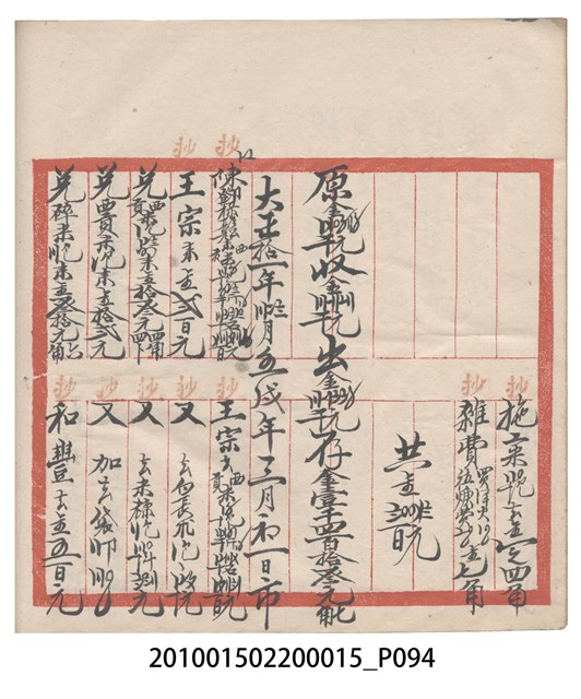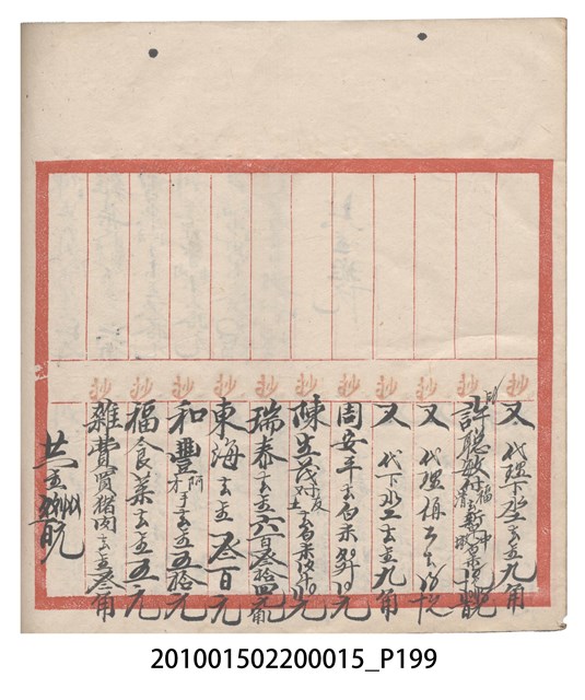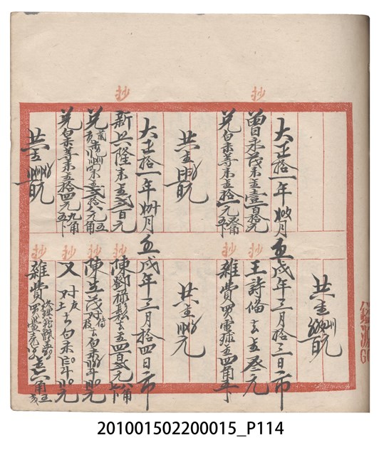 本物件為瑞興大正拾弍年癸亥苐首部日清,該書以棉線裝訂,封面、封底藍色,頂邊題有瑞興大正拾弍年癸亥苐首部日清字樣,內容涵蓋首行瑞興號大正拾弍年癸亥年孟春立首部日清 承壬戌年苐叁部日清 大正12年2月17日癸亥年元月初弍日大吉利市上欄收入彭在等費用;下欄支出林細、呂江番等費用。大正12年2月19日癸亥年元月初四日市上欄收入馥裕、陳烏石、呂阿慶等費用;下欄支出瑞泰、四元篤、拖工等費用。大正12年2月25日癸亥年元月初拾日市上欄收入黃氏粉、兑百米等費用;下欄支出呂江番、雜費等費用。大正12年2月26日癸亥年元月十一日上欄收入瑞泰、兑百米等費用;下欄支出郭查某、新興隆、曾泉、呂江番、拖工等費用。總計原、收金、出金、存 承過苐弍部日清簿。