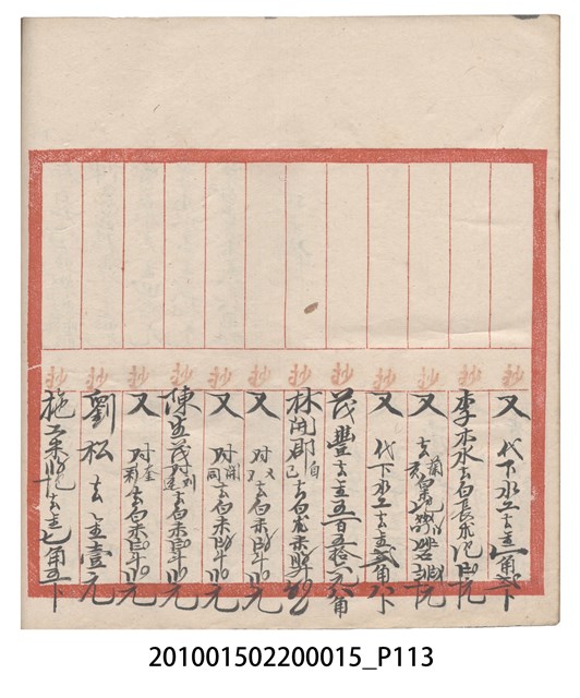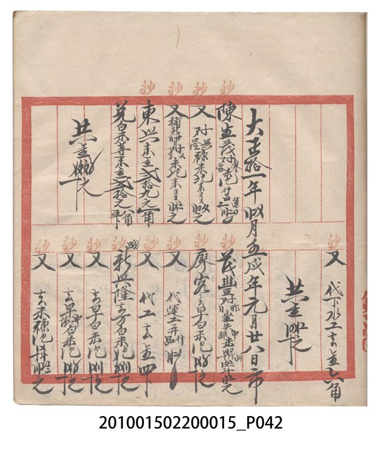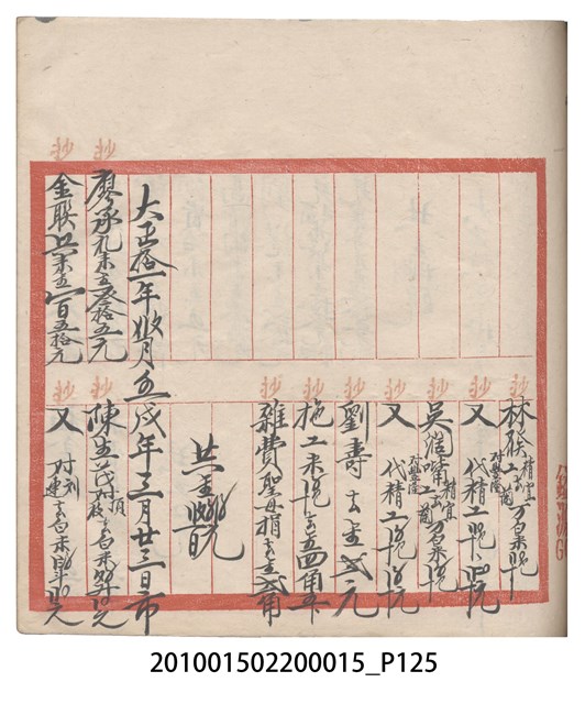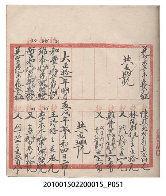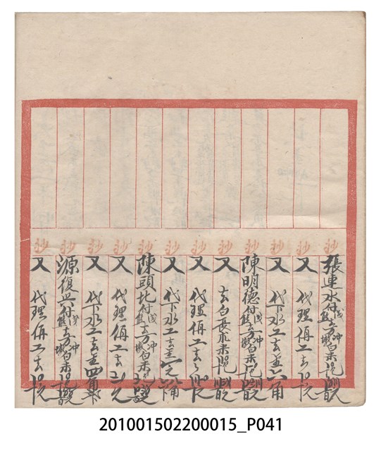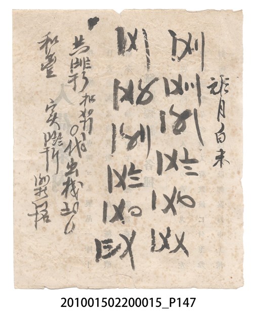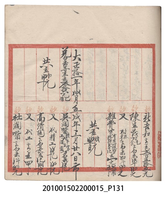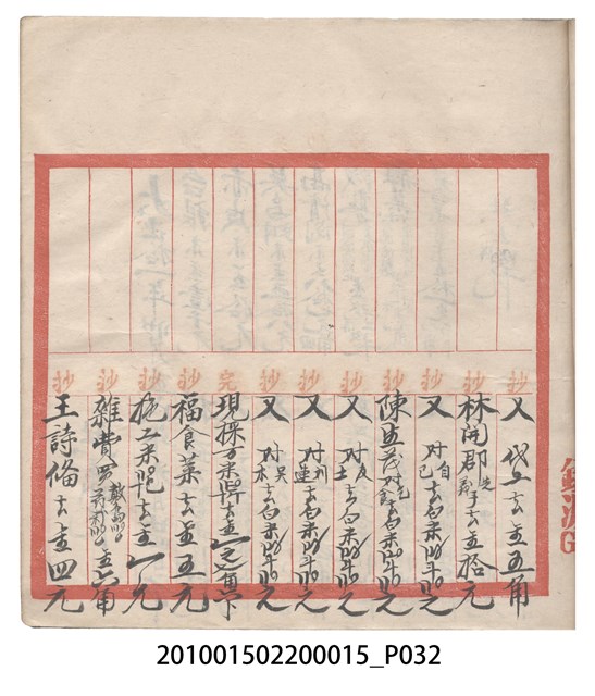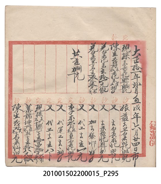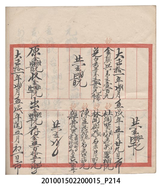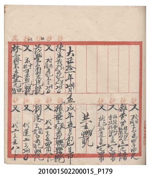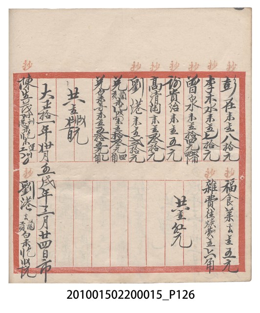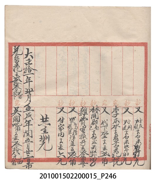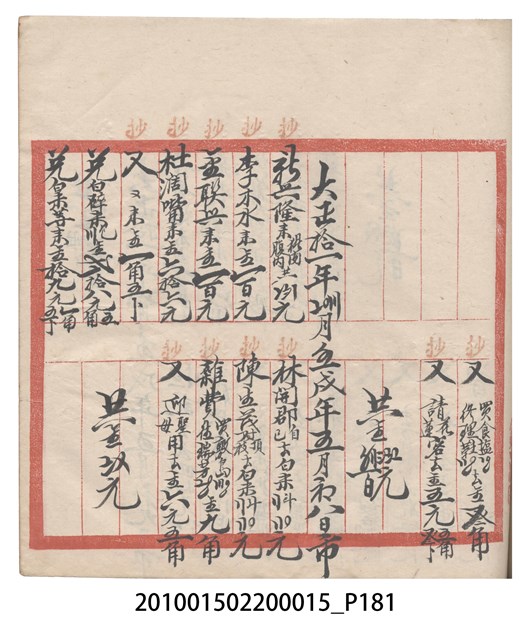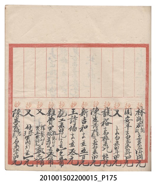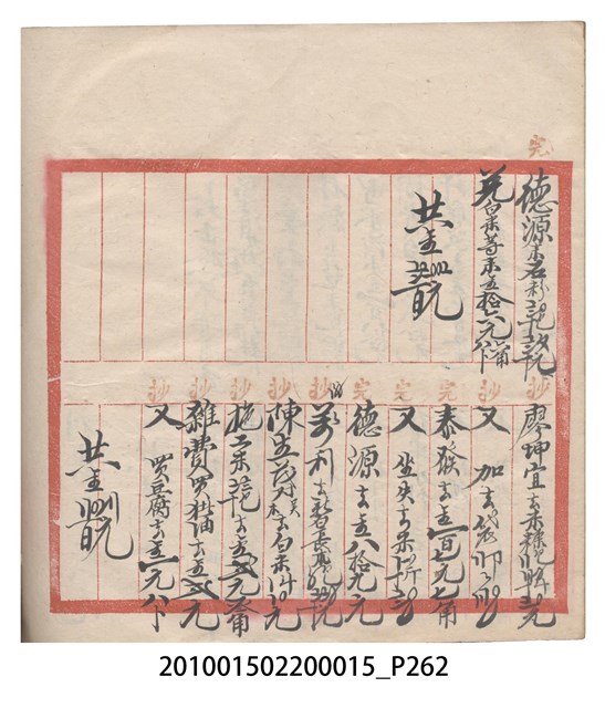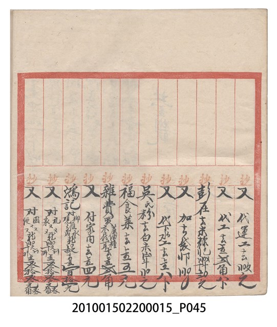 本物件為瑞興大正拾弍年癸亥苐首部日清,該書以棉線裝訂,封面、封底藍色,頂邊題有瑞興大正拾弍年癸亥苐首部日清字樣,內容涵蓋首行瑞興號大正拾弍年癸亥年孟春立首部日清 承壬戌年苐叁部日清 大正12年2月17日癸亥年元月初弍日大吉利市上欄收入彭在等費用;下欄支出林細、呂江番等費用。大正12年2月19日癸亥年元月初四日市上欄收入馥裕、陳烏石、呂阿慶等費用;下欄支出瑞泰、四元篤、拖工等費用。大正12年2月25日癸亥年元月初拾日市上欄收入黃氏粉、兑百米等費用;下欄支出呂江番、雜費等費用。大正12年2月26日癸亥年元月十一日上欄收入瑞泰、兑百米等費用;下欄支出郭查某、新興隆、曾泉、呂江番、拖工等費用。總計原、收金、出金、存 承過苐弍部日清簿。