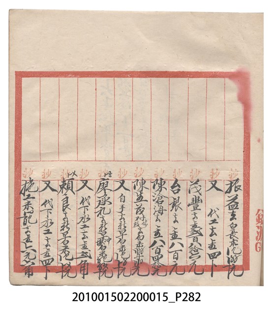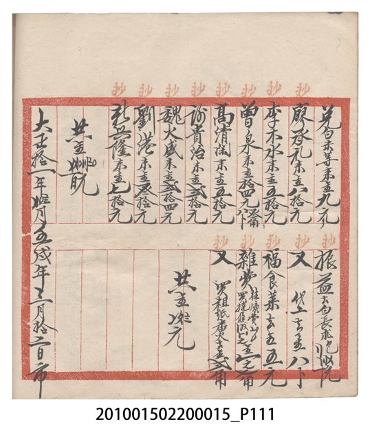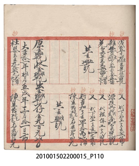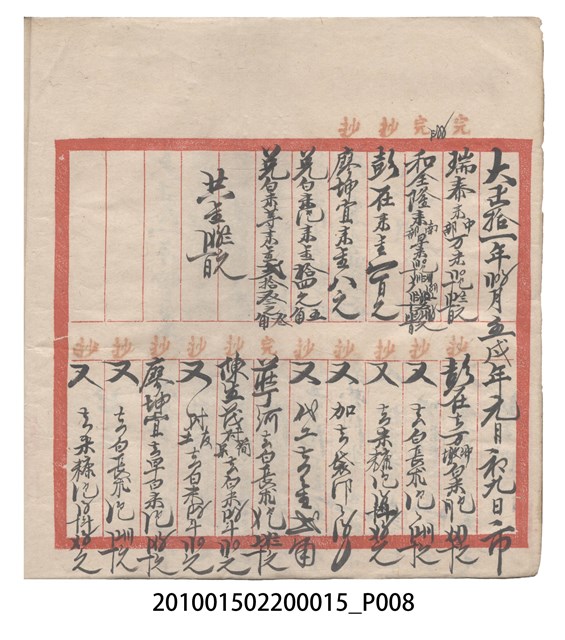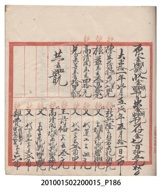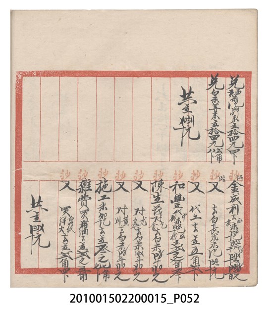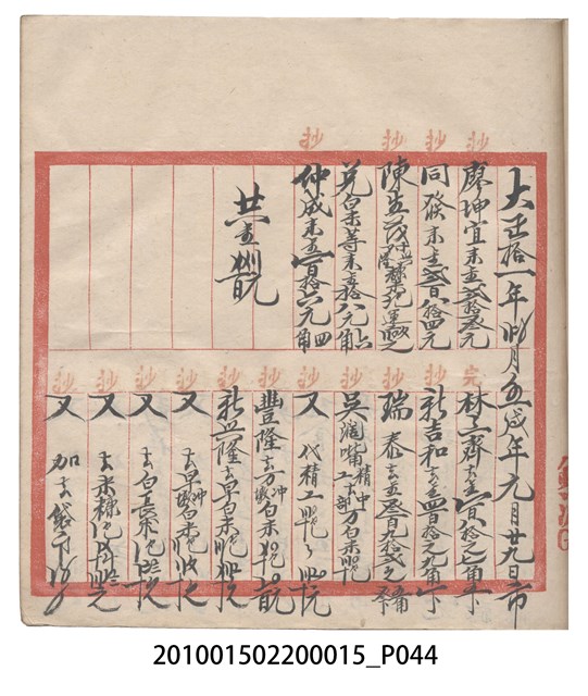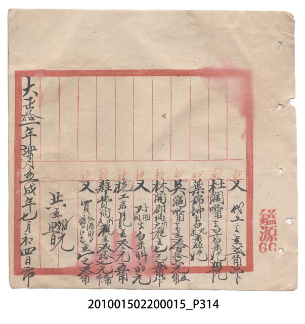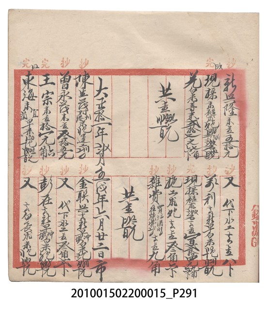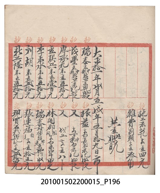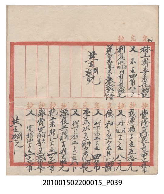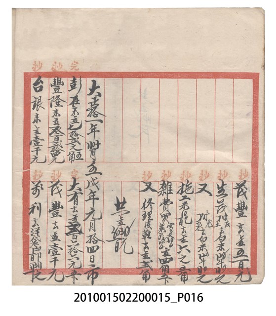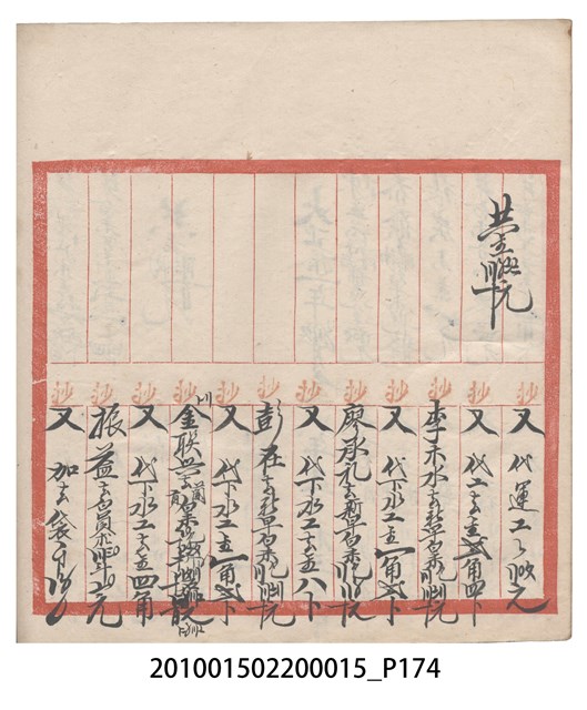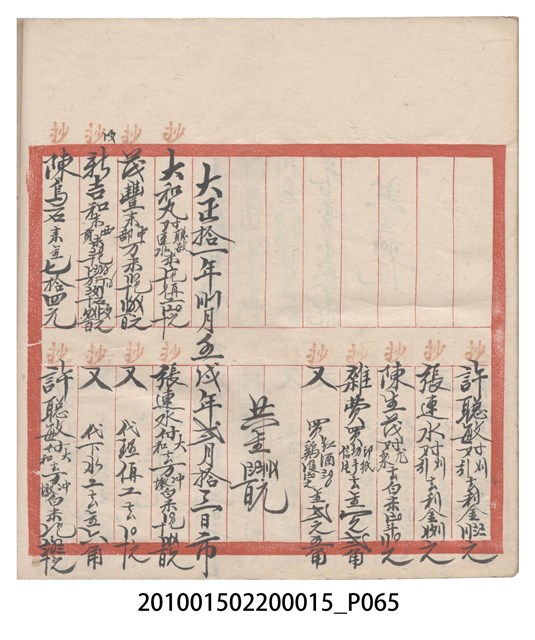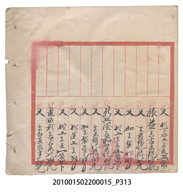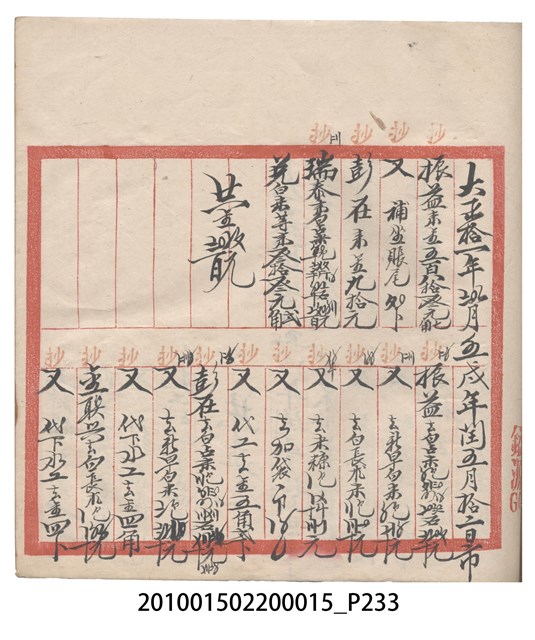 本物件為瑞興大正拾弍年癸亥苐首部日清,該書以棉線裝訂,封面、封底藍色,頂邊題有瑞興大正拾弍年癸亥苐首部日清字樣,內容涵蓋首行瑞興號大正拾弍年癸亥年孟春立首部日清 承壬戌年苐叁部日清 大正12年2月17日癸亥年元月初弍日大吉利市上欄收入彭在等費用;下欄支出林細、呂江番等費用。大正12年2月19日癸亥年元月初四日市上欄收入馥裕、陳烏石、呂阿慶等費用;下欄支出瑞泰、四元篤、拖工等費用。大正12年2月25日癸亥年元月初拾日市上欄收入黃氏粉、兑百米等費用;下欄支出呂江番、雜費等費用。大正12年2月26日癸亥年元月十一日上欄收入瑞泰、兑百米等費用;下欄支出郭查某、新興隆、曾泉、呂江番、拖工等費用。總計原、收金、出金、存 承過苐弍部日清簿。