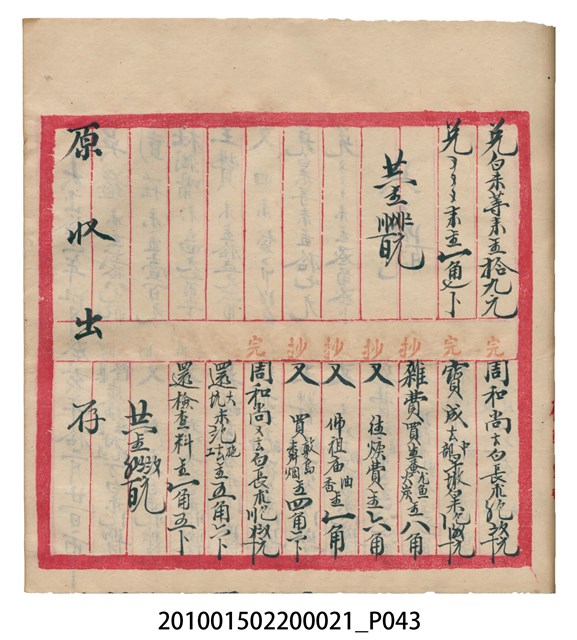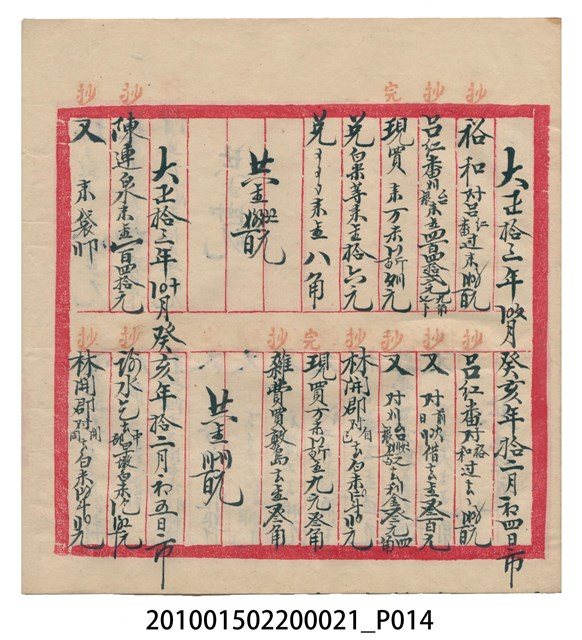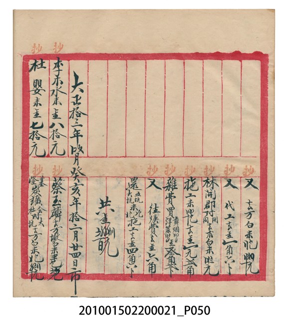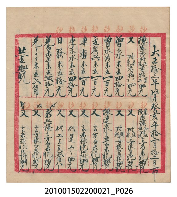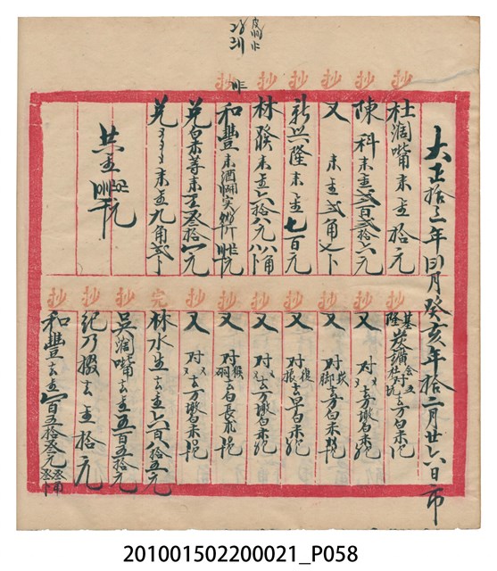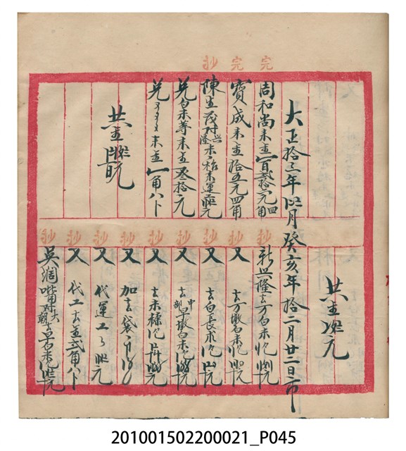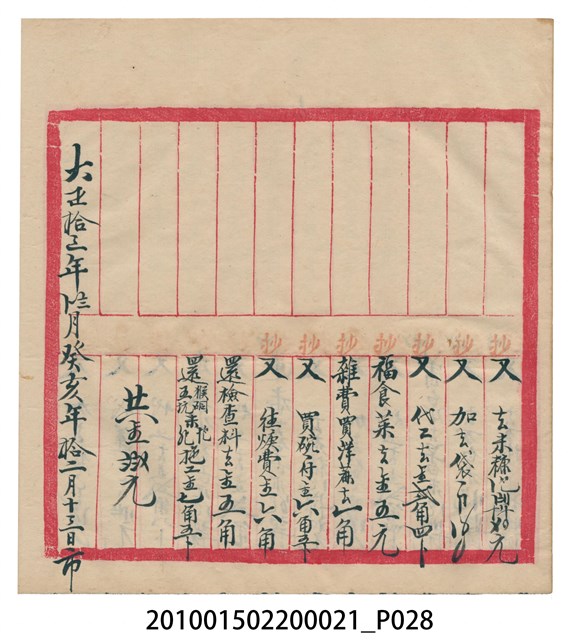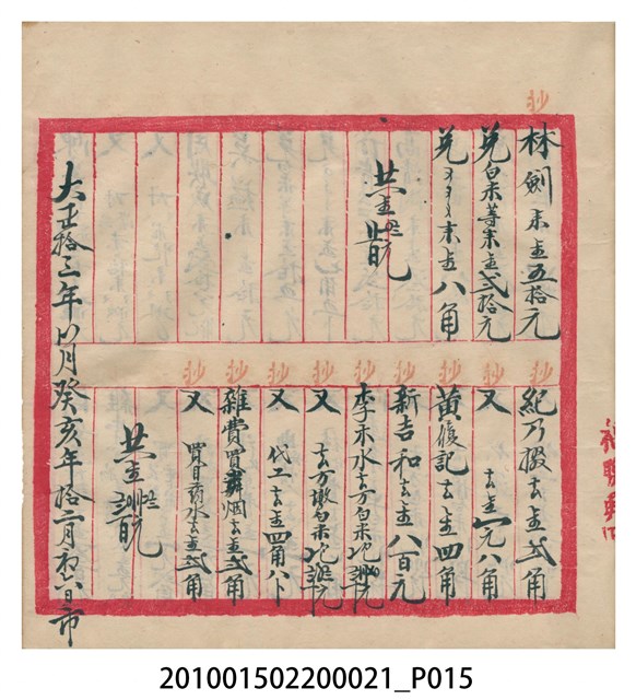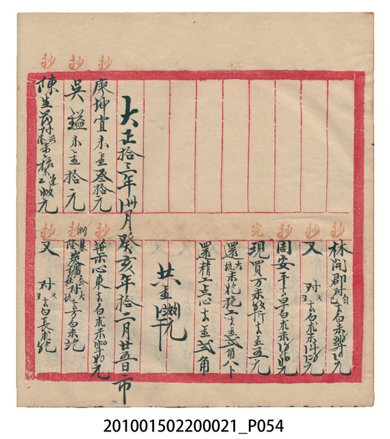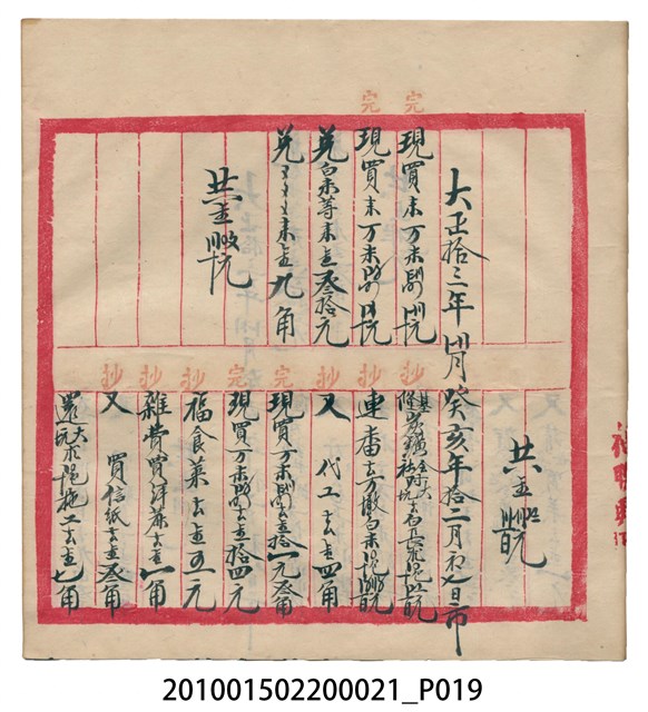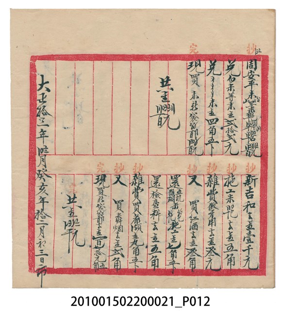 本物件為瑞興大正拾弍年癸亥苐叁部日清,該書以棉線裝訂,封面、封底藍色,書背四處破損,頂邊題有瑞興大正拾弍年癸亥苐叁部日清字樣,內容涵蓋首行瑞興號大正拾三年歲次癸亥年仲冬立苐叁部日清 承苐弍部日清尾存 大正13年●月癸亥年拾一月廿七日市上欄收入陳生茂、陳科、曾永茂等費用;下欄支出陳連泉等費用。大正13年●月癸亥年拾一月廿八日市上欄收入兑白米等費用;下欄支出基隆炭鑛會社、拖工、雜費等費用。大正13年●月癸亥年拾二月卅日市上欄收入金聯興、連番、曾泉等費用;下欄支出現買、吳濶嘴、周安平、拖工、雜費等費用。