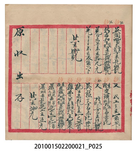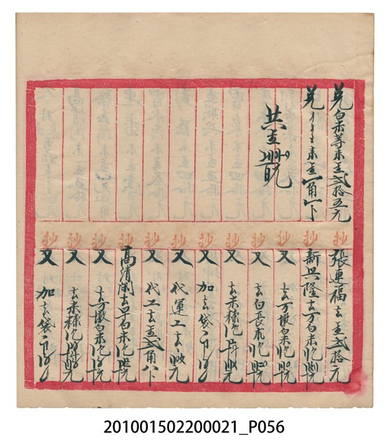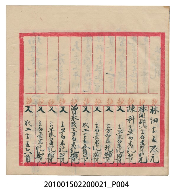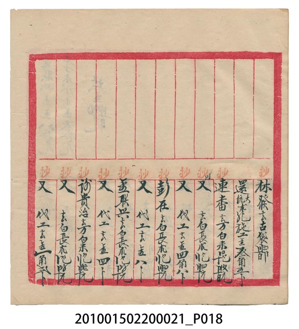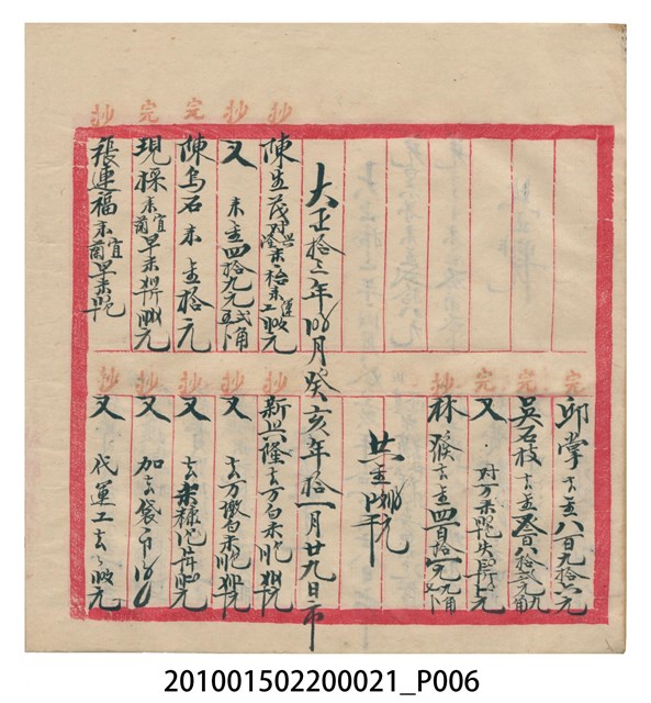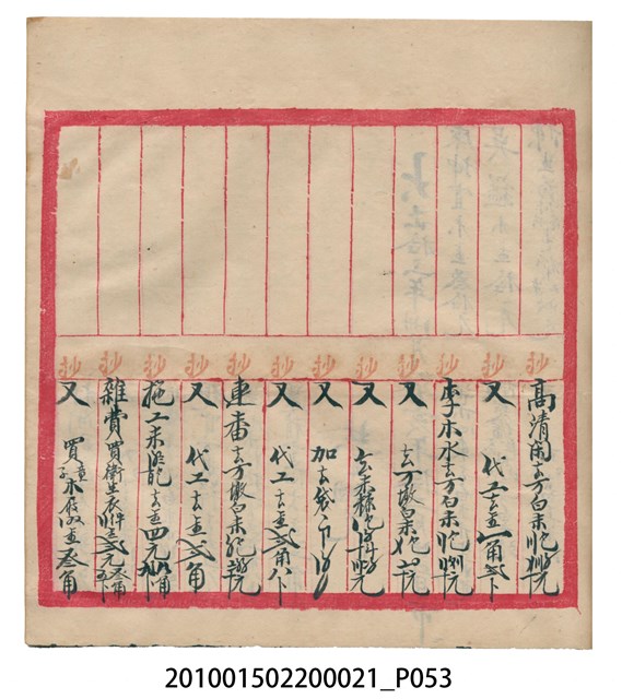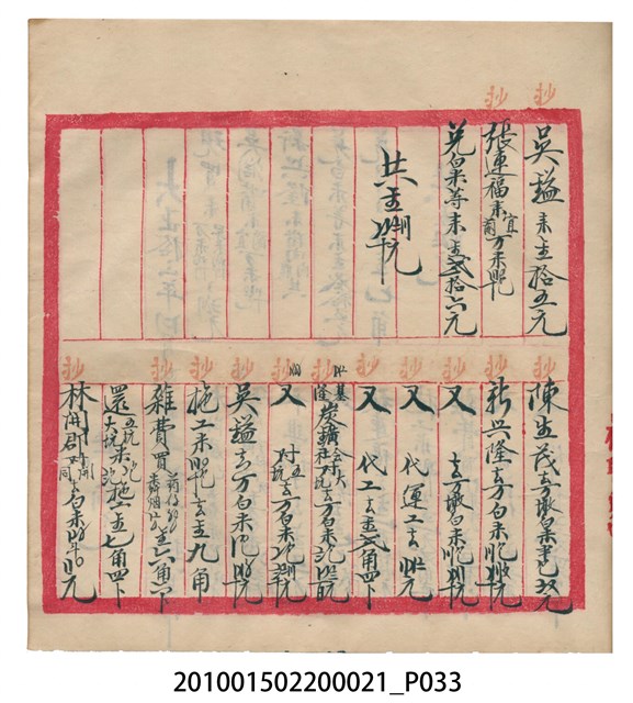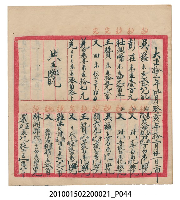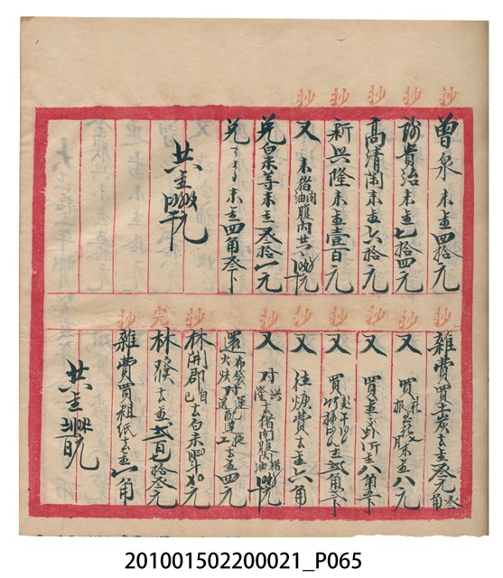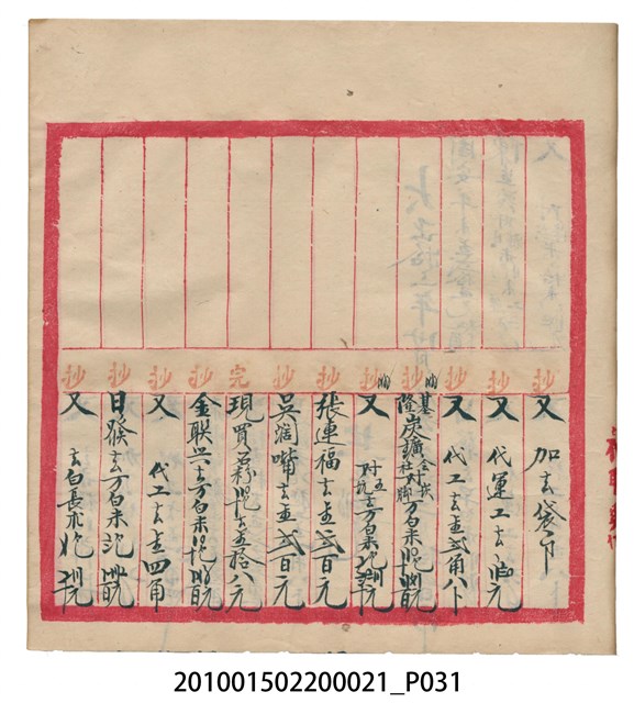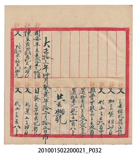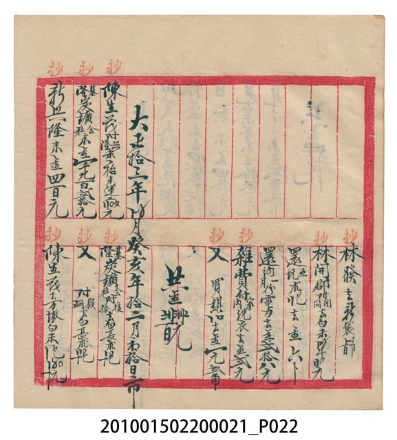 本物件為瑞興大正拾弍年癸亥苐叁部日清,該書以棉線裝訂,封面、封底藍色,書背四處破損,頂邊題有瑞興大正拾弍年癸亥苐叁部日清字樣,內容涵蓋首行瑞興號大正拾三年歲次癸亥年仲冬立苐叁部日清 承苐弍部日清尾存 大正13年●月癸亥年拾一月廿七日市上欄收入陳生茂、陳科、曾永茂等費用;下欄支出陳連泉等費用。大正13年●月癸亥年拾一月廿八日市上欄收入兑白米等費用;下欄支出基隆炭鑛會社、拖工、雜費等費用。大正13年●月癸亥年拾二月卅日市上欄收入金聯興、連番、曾泉等費用;下欄支出現買、吳濶嘴、周安平、拖工、雜費等費用。
