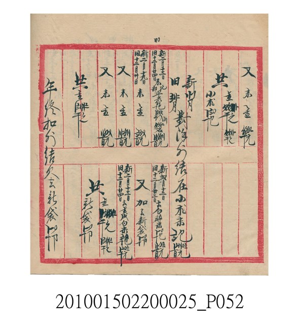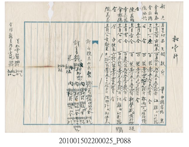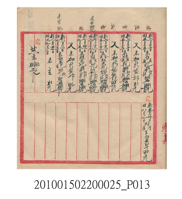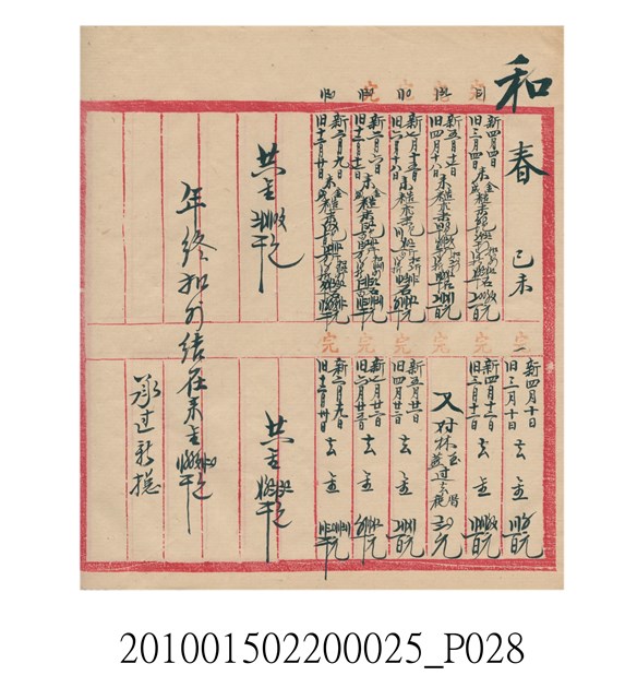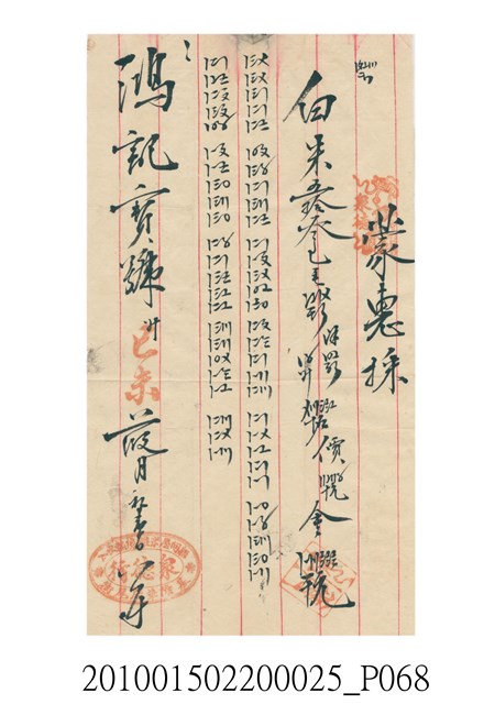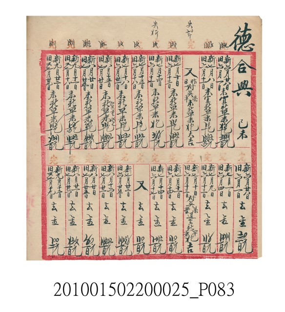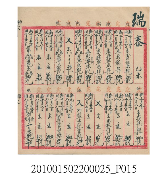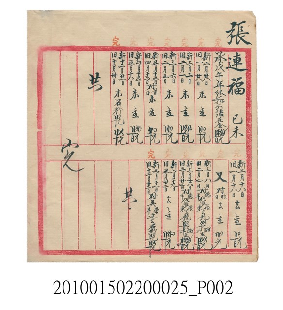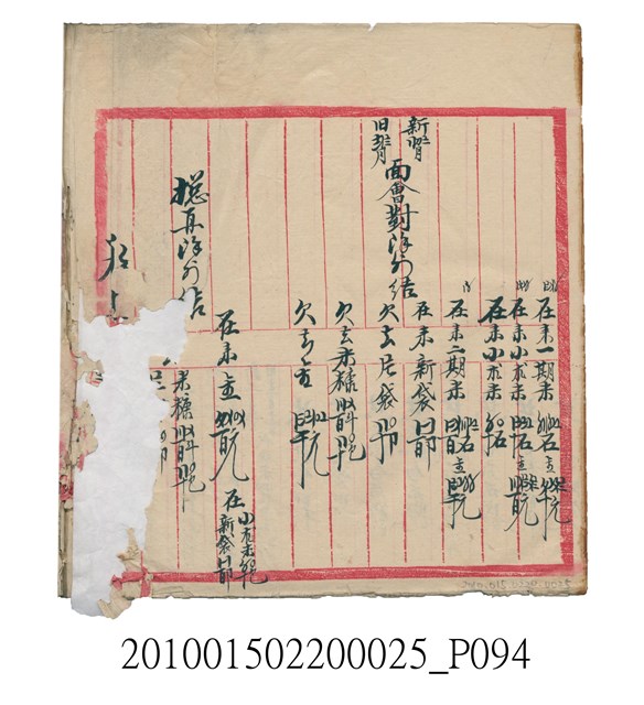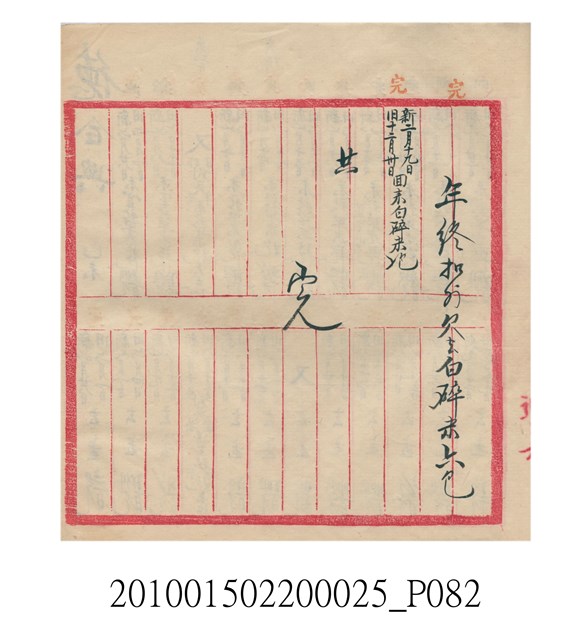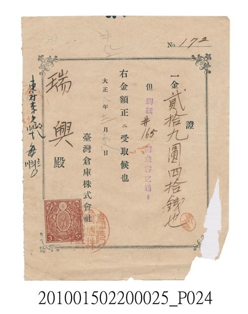 本物件為瑞興大正八年己未行戶交關總簿,該書以棉線裝訂,封面、封底藍色,頂邊題有瑞興大正八年己未行戶交關總簿字樣,內容涵蓋張連福己未 承戊午年●●●結在金並交易收支費用。[夾紙] 本物件為大正8年12月28日瑞興 殿納請求書估算費用,臺灣倉庫株式會社開立收費證明。[夾紙] 本物件為蘇州碼並字跡難辨。[夾紙] 本物件為大正8年11月21日對彰銀信滙及其他借貸費用之清償與積欠紀錄。[夾紙] 本物件為大正8年12月2日瑞興商行對新銀電當座、彰銀信滙等費用紀錄。[夾紙] 本物件為11月15日彰化周秋淋等致瑞興寶號請求書運送麻袋、米數量的交易紀錄。 原簿,其他支出費用。