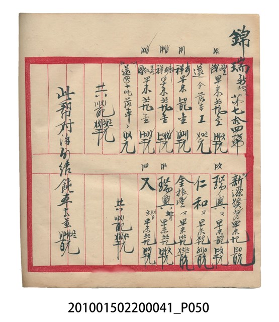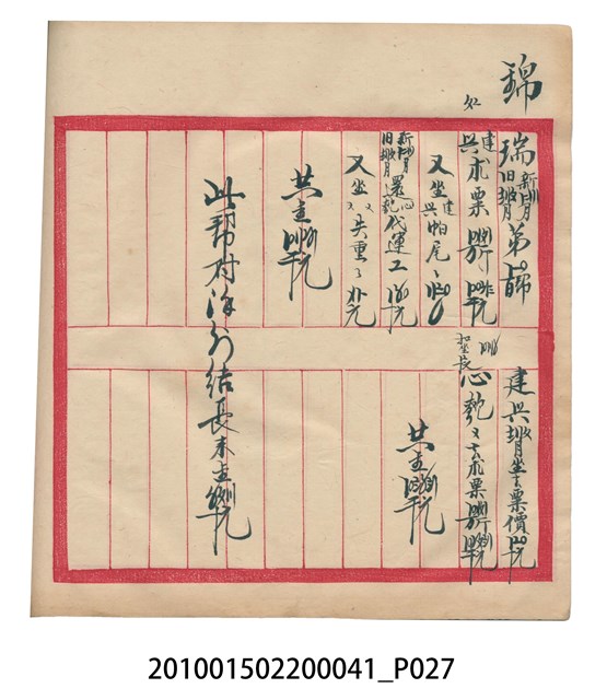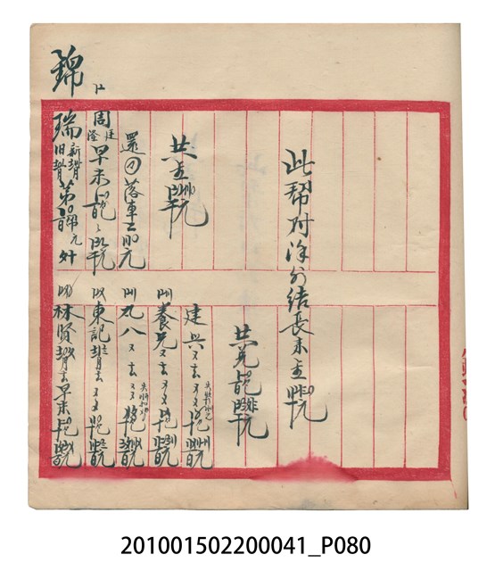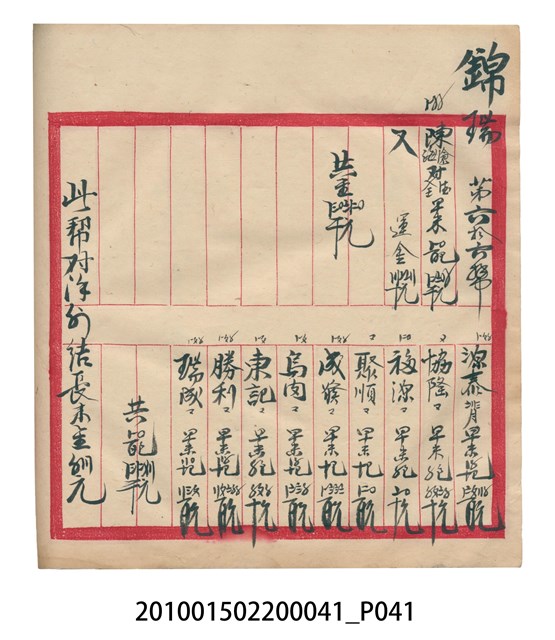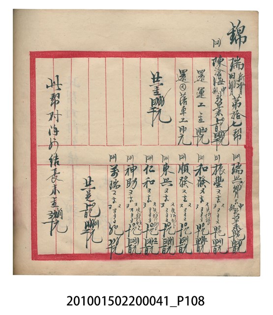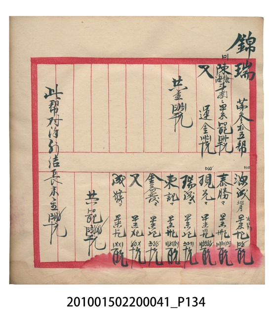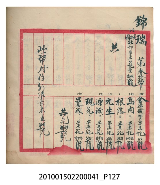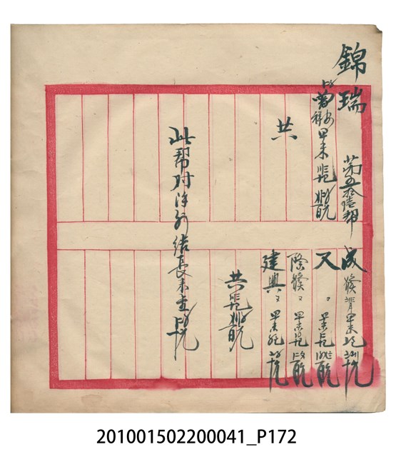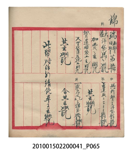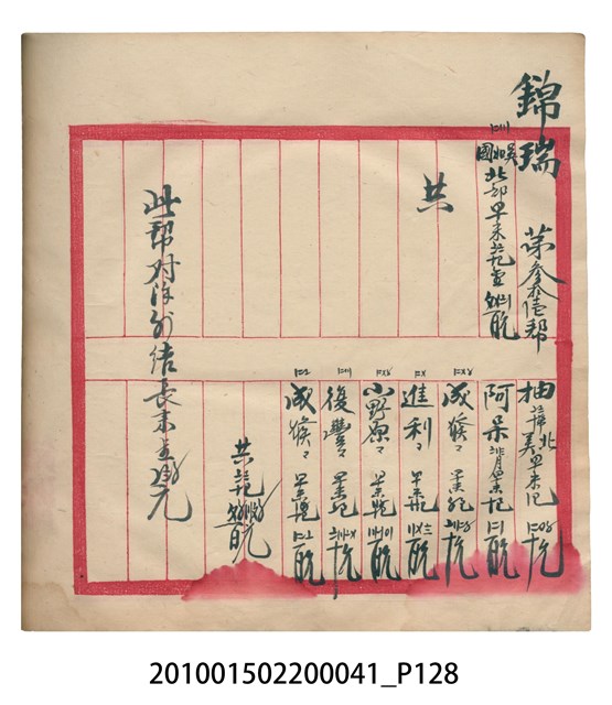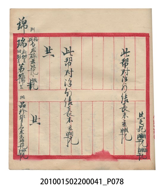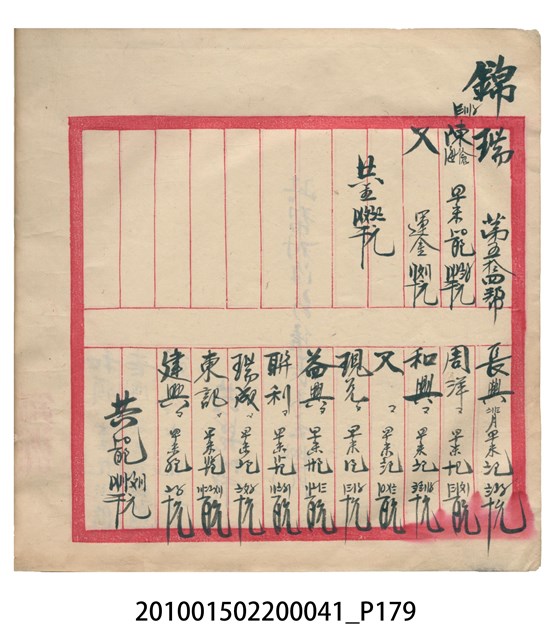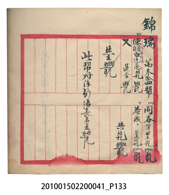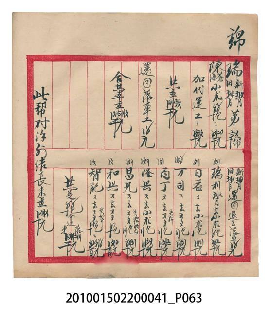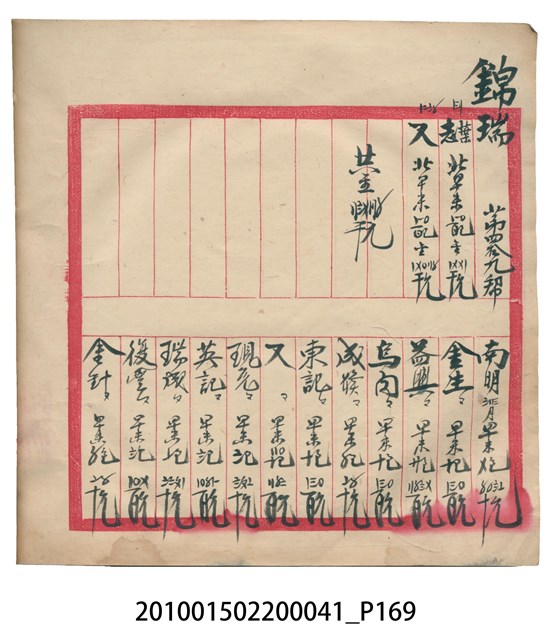 本物件為錦瑞號大正拾叁年甲子立號頭簿,該書以棉線裝訂,封面、封底藍色,書背、封底有破損,頂邊題有錦瑞號大正拾叁年甲子立號頭簿字樣,內容涵蓋錦瑞號與裕有、錦瑒商品交易收支紀錄。[夾紙]本物件為隨手筆記磅工、出棧、手數料、稅金費用。[夾紙]本物件為大正13年3月6日高水生納關稅領收證書。大正13年3月6日高水生納關稅,由臺灣總督府稅關收入官吏臺灣總督府稅關屬田ノ上家光開立領收證書。該筆金額納為大正12年度臺灣總督府特別會計歲入。[夾紙] 本物件為大正13年3月11日托運者裕有、瑞興號運米船隻亞米利加丸、大華丸費用之估算書,由大阪商船株式會社專屬朱祿海陸運送部 艀船部開立計算價格。[夾紙] 本物件為大正13年3月11日瑞興號運米船隻亞米利加丸、大華丸稅關上水苦力、上家倉庫上水苦力費用之估算書,由大阪商船株式會社專屬朱祿海陸運送部 艀船部開立計算價格。[夾紙]本物件為大正13年3月9日大森運送店開立予瑞興商行之估算書,計算海陸運送費用。