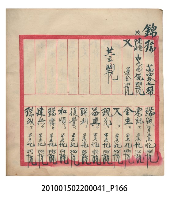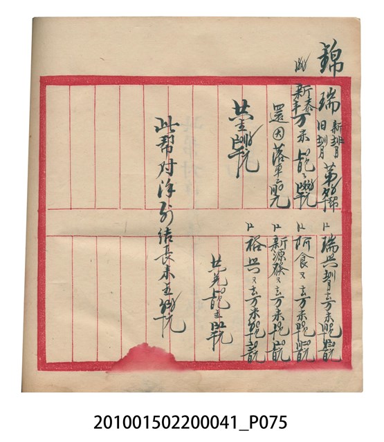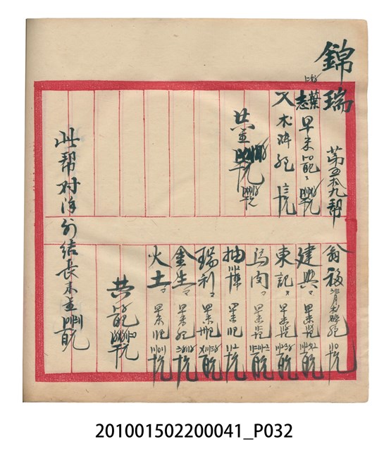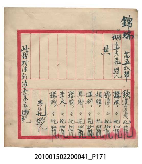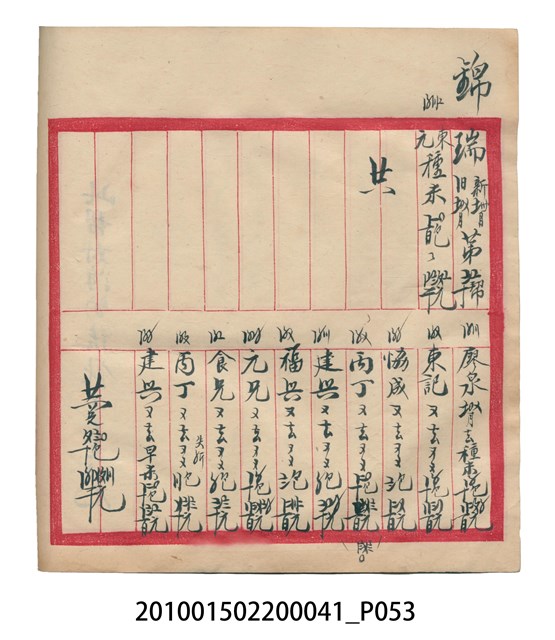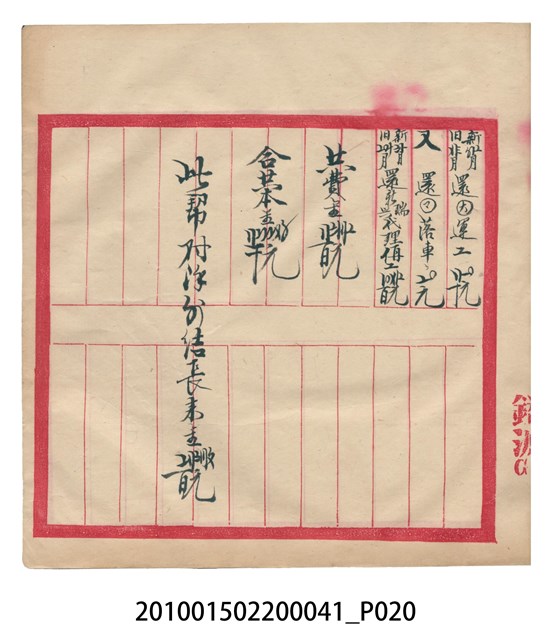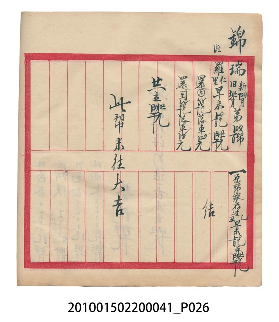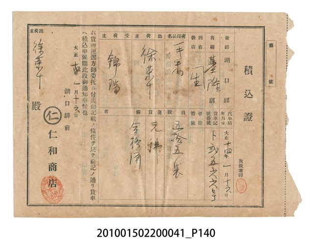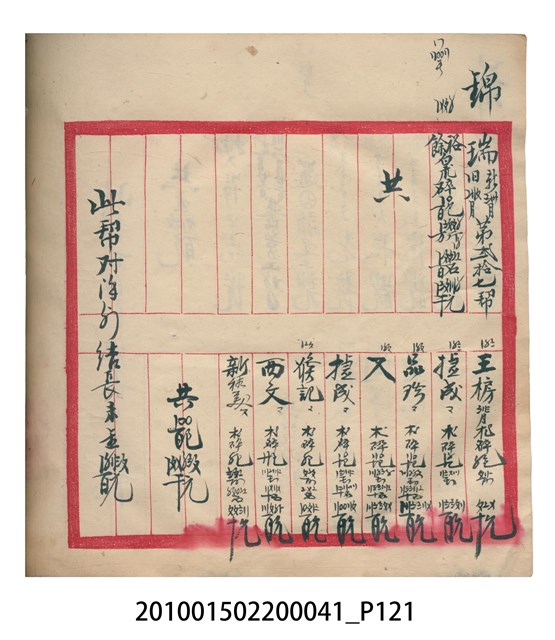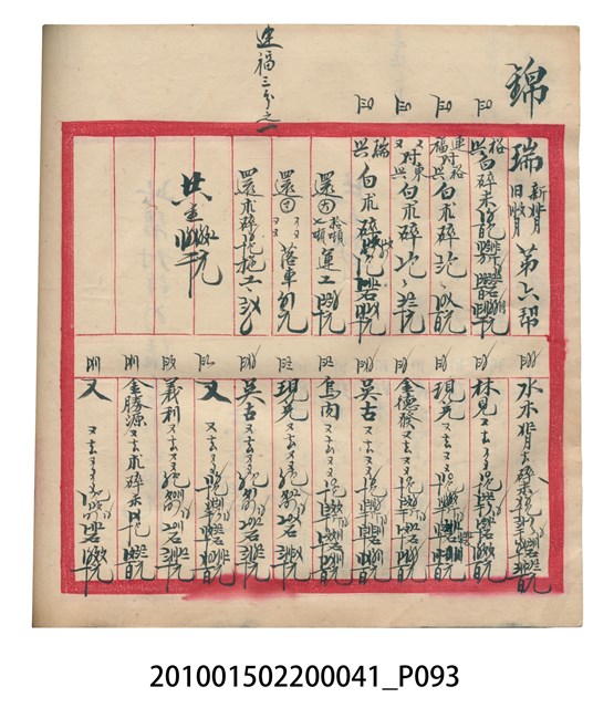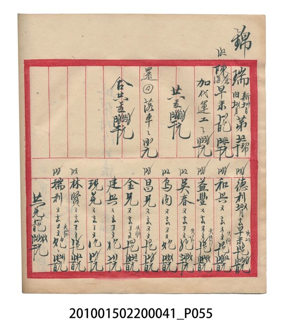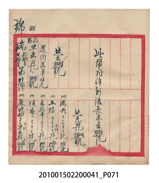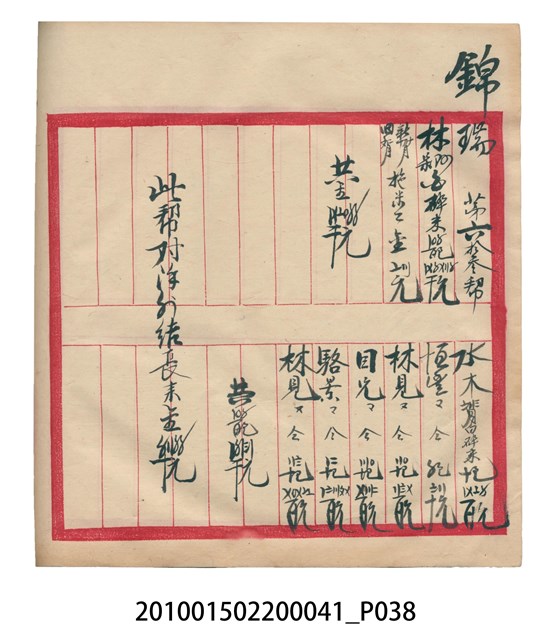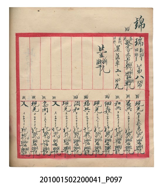 本物件為錦瑞號大正拾叁年甲子立號頭簿,該書以棉線裝訂,封面、封底藍色,書背、封底有破損,頂邊題有錦瑞號大正拾叁年甲子立號頭簿字樣,內容涵蓋錦瑞號與裕有、錦瑒商品交易收支紀錄。[夾紙]本物件為隨手筆記磅工、出棧、手數料、稅金費用。[夾紙]本物件為大正13年3月6日高水生納關稅領收證書。大正13年3月6日高水生納關稅,由臺灣總督府稅關收入官吏臺灣總督府稅關屬田ノ上家光開立領收證書。該筆金額納為大正12年度臺灣總督府特別會計歲入。[夾紙] 本物件為大正13年3月11日托運者裕有、瑞興號運米船隻亞米利加丸、大華丸費用之估算書,由大阪商船株式會社專屬朱祿海陸運送部 艀船部開立計算價格。[夾紙] 本物件為大正13年3月11日瑞興號運米船隻亞米利加丸、大華丸稅關上水苦力、上家倉庫上水苦力費用之估算書,由大阪商船株式會社專屬朱祿海陸運送部 艀船部開立計算價格。[夾紙]本物件為大正13年3月9日大森運送店開立予瑞興商行之估算書,計算海陸運送費用。