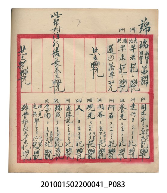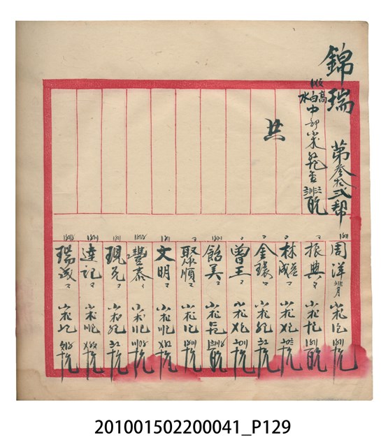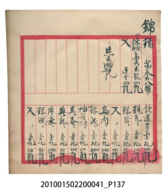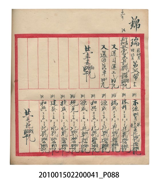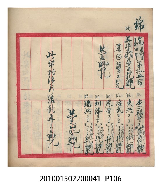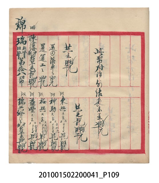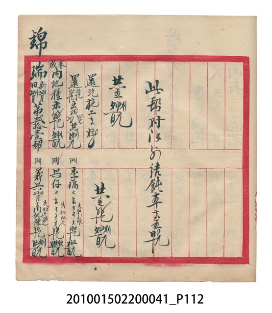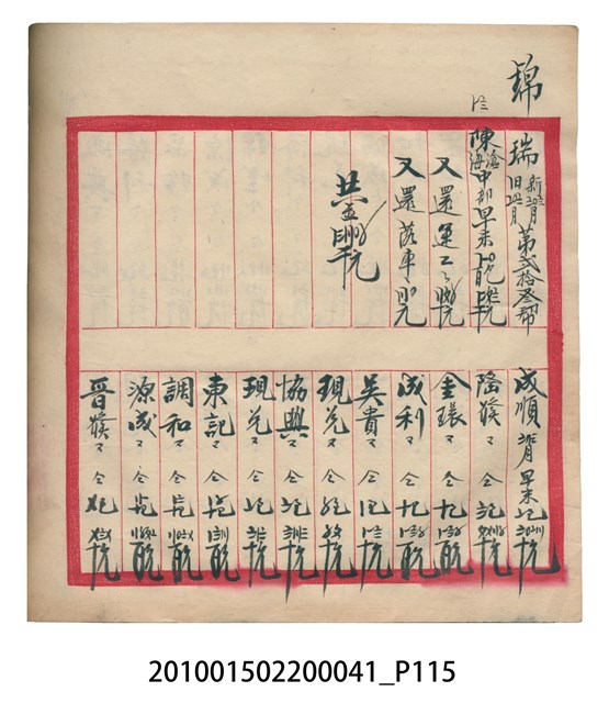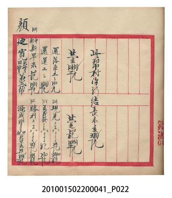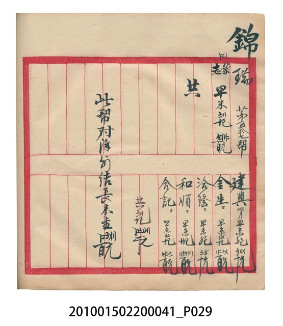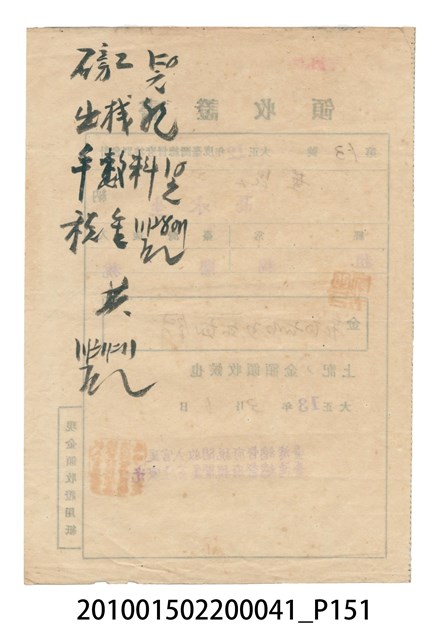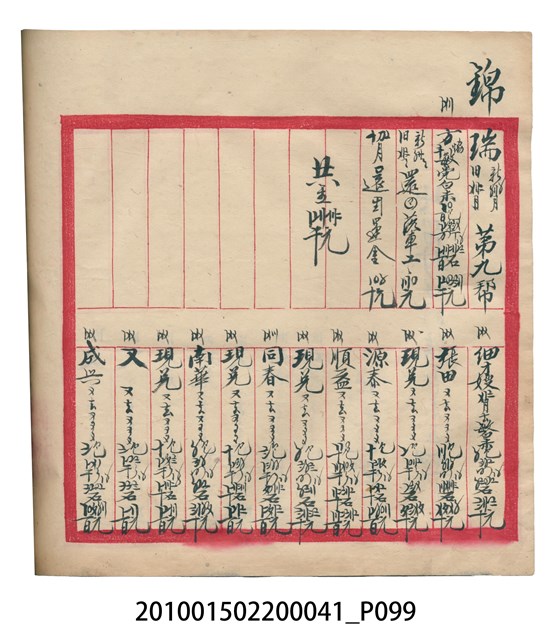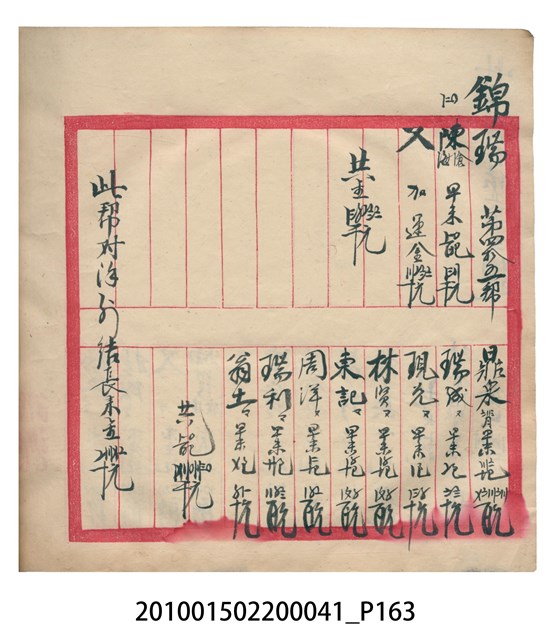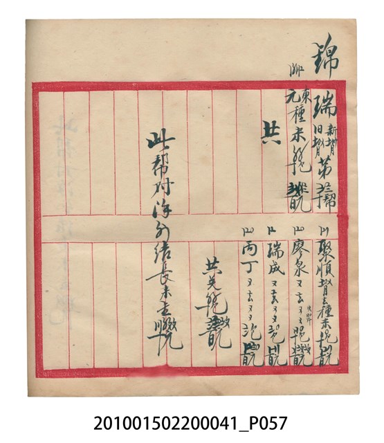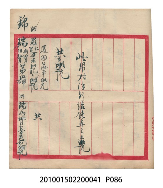 本物件為錦瑞號大正拾叁年甲子立號頭簿,該書以棉線裝訂,封面、封底藍色,書背、封底有破損,頂邊題有錦瑞號大正拾叁年甲子立號頭簿字樣,內容涵蓋錦瑞號與裕有、錦瑒商品交易收支紀錄。[夾紙]本物件為隨手筆記磅工、出棧、手數料、稅金費用。[夾紙]本物件為大正13年3月6日高水生納關稅領收證書。大正13年3月6日高水生納關稅,由臺灣總督府稅關收入官吏臺灣總督府稅關屬田ノ上家光開立領收證書。該筆金額納為大正12年度臺灣總督府特別會計歲入。[夾紙] 本物件為大正13年3月11日托運者裕有、瑞興號運米船隻亞米利加丸、大華丸費用之估算書,由大阪商船株式會社專屬朱祿海陸運送部 艀船部開立計算價格。[夾紙] 本物件為大正13年3月11日瑞興號運米船隻亞米利加丸、大華丸稅關上水苦力、上家倉庫上水苦力費用之估算書,由大阪商船株式會社專屬朱祿海陸運送部 艀船部開立計算價格。[夾紙]本物件為大正13年3月9日大森運送店開立予瑞興商行之估算書,計算海陸運送費用。