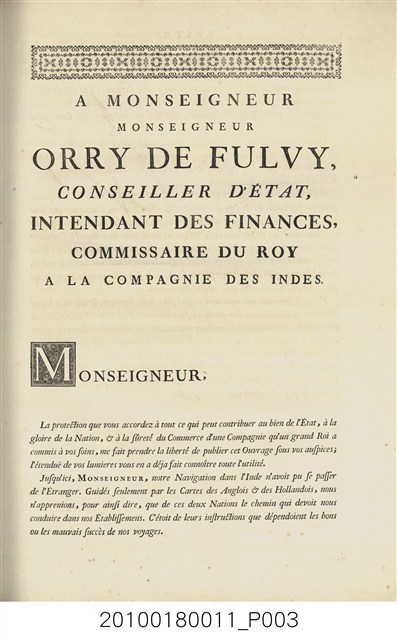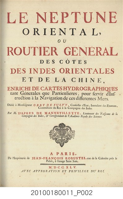 本書為1745年出版之地圖集,作者為十八世紀法國製圖師Jean-Baptiste d'Après de Mannevillette。此圖集收有25張東印度地區海圖。D'Après de Mannevillette(1707-1780)是法國知名的水手和水道學家。1728年航行到中國,他成功地使用了新儀器而糾正了許多地方的緯度。當他返回法國時,他提出了一個計劃:糾正和公佈到中國航道相關的現有的所有地圖,包括:紅海、印度沿海、馬來亞、印度尼西亞北部、印度支那和中國。第一版有25張地圖,第二版於1775年出版,附有59張圖。