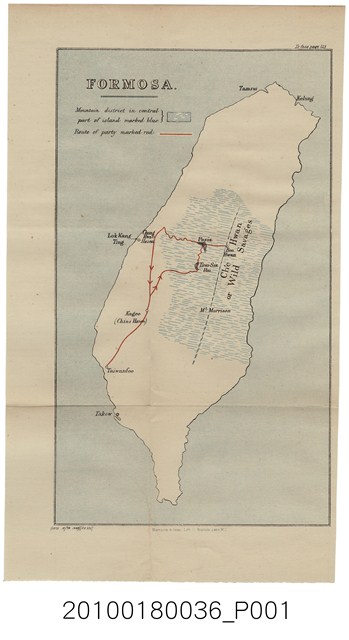 〈福爾摩沙地圖〉,此圖描繪1873年英國駐淡水領事人員T.L. Bullock與美籍學者J. B. Steere、甘為霖牧師(William Campbell)前往中部山區的探險之旅的路線。由Harrison & Sons 出版社出版,1874年10月印行。