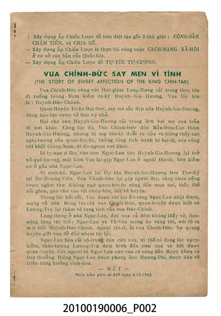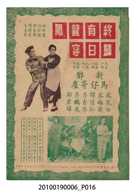 1. 香港電影《正德皇海角尋香》於越南的戲院上映時的電影本事小冊。本事封面印有「全部歌唱」、「宮闈香豔 輕鬆諧趣 武俠奇情 歌唱名片」廣告文字。本事封底為下期上映影片廣告,介紹粵語片《終歸有日龍穿鳳》,標明「幽默透頂妙趣橫生歌唱時裝大喜劇」、主角「新馬仔」與「鄧寄塵」,並列出其他主演演員名單。本事內頁則收錄《正德皇海角尋香》的電影故事、曲詞與工尺譜。2. 香港電影《正德皇海角尋香》由玉聯影業公司於1959年出品。該片由龍圖執導,任劍輝、羅艷卿、梁醒波、譚倩紅、鄭君綿、馮峰等領銜主演。玉聯影業為活躍於1950至60年代的香港電影公司,曾出品80餘部香港電影,主要拍製類型為武俠、歌唱與戲曲電影。
