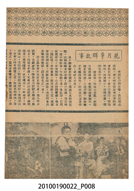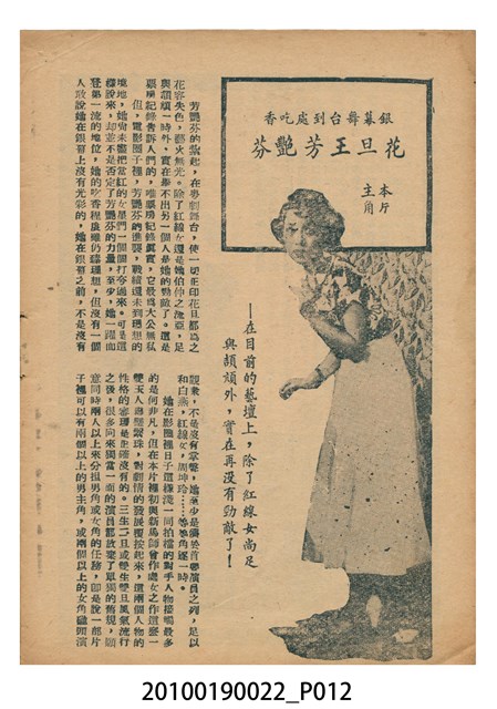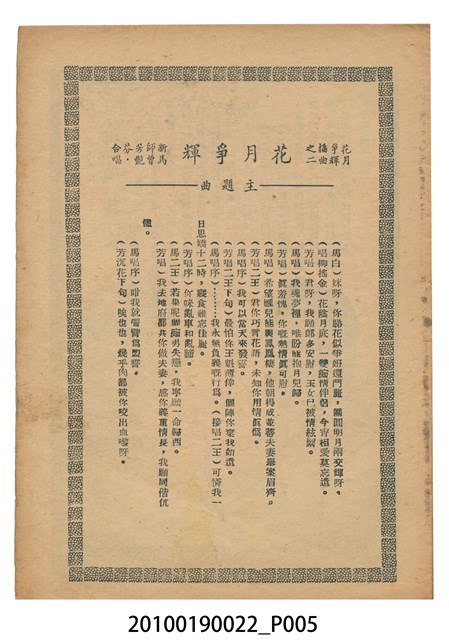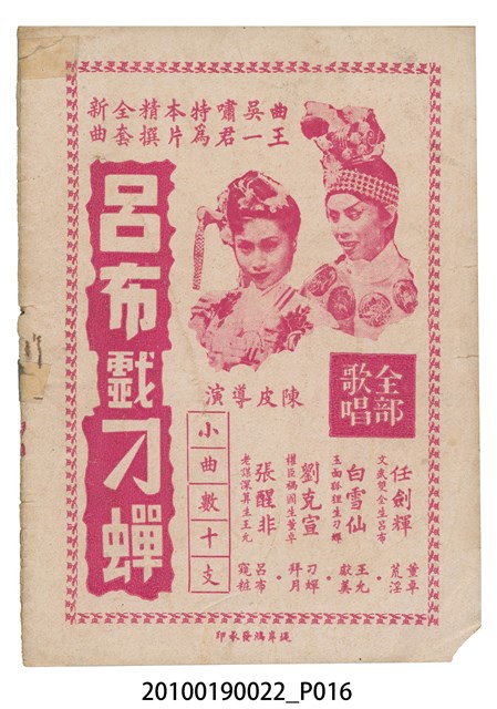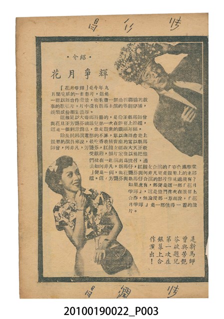 1. 香港電影《花月爭輝》於越南的戲院上映時的電影本事小冊。本事封面印有「花月爭輝」片名。本事封底為下期上映影片廣告,介紹粵語歌唱片《呂布戲貂蟬》,標明「曲王吳一嘯君特為本片經撰全套新曲」、「全部歌唱」與「陳皮導演」等廣告字樣,並於下方列出其他主演演員名單。本事內頁則有《花月爭輝》的電影介紹、電影故事、劇照、主演演員的介紹、精彩曲詞,以及即將上映的電影《孤鳳啼痕》、《糊塗外父》、《呂布戲貂蟬》的電影廣告。2. 《花月爭輝》是由大聯影業公司於1952年出品的粵語喜劇片。該片由珠璣執導,新馬師曾、芳豔芬參與演出。大聯影業由陳焯生於1950年代初創辦,陳焯生畢生製作及發行影片逾二百部,五十年代主要製作歌唱片,六十年代中開始監製、導演寫實喜劇,以及武俠、文藝、驚慄等多類型電影。