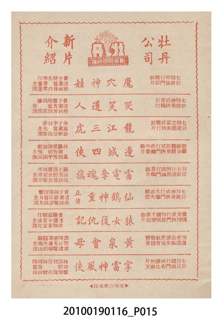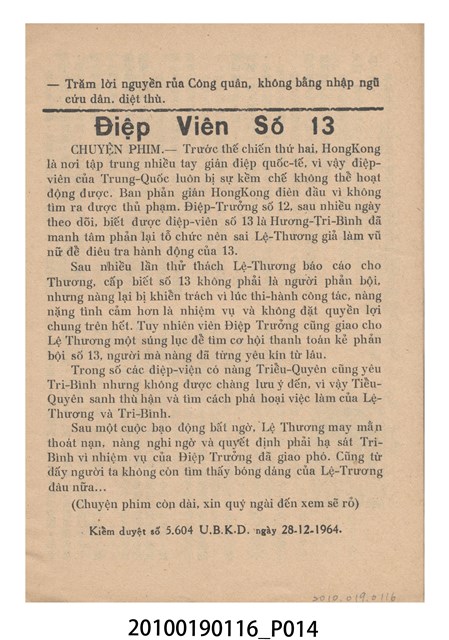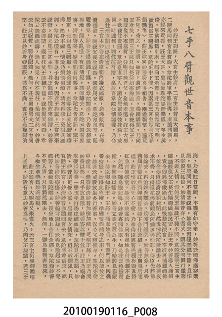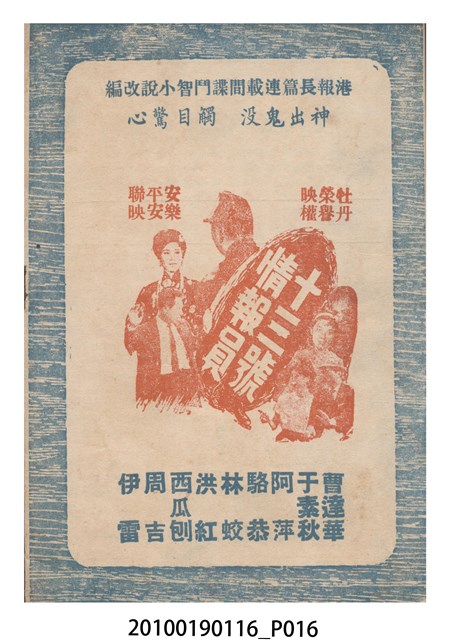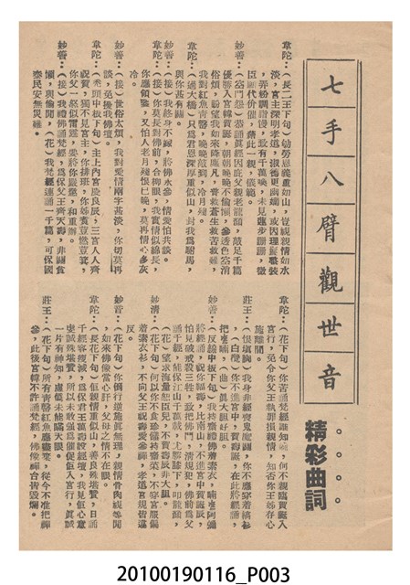 1. 香港電影《七手八臂觀世音》於越南上映時的雙色印刷電影本事小冊。正面上有片名「七手八臂觀世音」,標明「社會倫理奇情警世教忠教孝有益人心歌唱新片」、「闡揚佛法偉大 闡揚佛教光榮」」「安樂 平安 聯映」廣告文字,並列出主演演員名單。版面左下處劇中角色的人形圖。本事封底為影片廣告,介紹《十三號情報員》,標明「港報長篇連載間諜鬥智小說改編」、「牡丹榮譽映權」、「安樂 平安 聯映」等廣告文字。本事內頁則收錄《一對好冤家》、《新夜吊秋喜》、《老婆萬歲》、《濟公傳》、《痴男怨女》、《大家姐》、《魔穴神娃》、《哭笑道人》、《龍江三虎》、《邊城四俠》、《雷電奪魂旗》、《仙鶴神童正傳》、《猿女復仇記》、《黃泉會母》和《掌雷神風俠》的電影宣傳。2. 《七手八臂觀世音》為麗士影業公司1963年出品的粵語古裝奇幻片。影片由黃鶴聲導演、李少芸編劇,任劍輝、余麗珍、靚次伯主演。麗士影業公司為香港著名粵劇及電影演員余麗珍與其夫婿粵劇編劇家李少芸於1959年自資創立,以攝製粵語戲曲片為主,並使用新的攝影鏡頭、剪接與特技,出品不少融合神怪、奇幻元素的粵劇戲曲片。