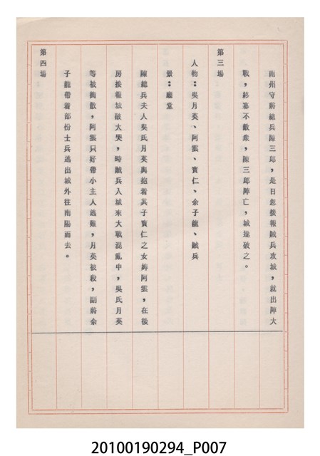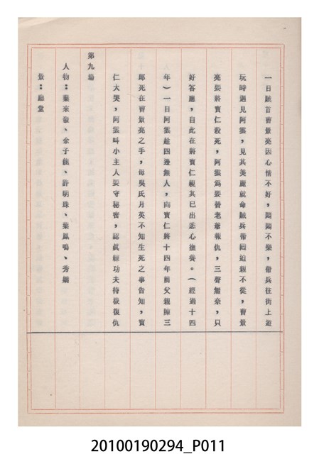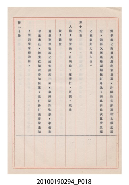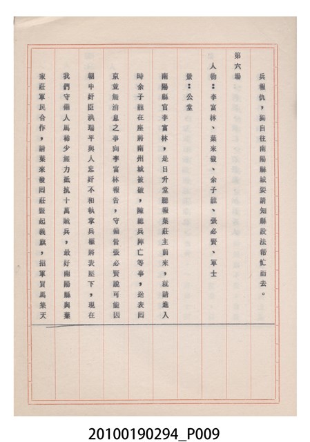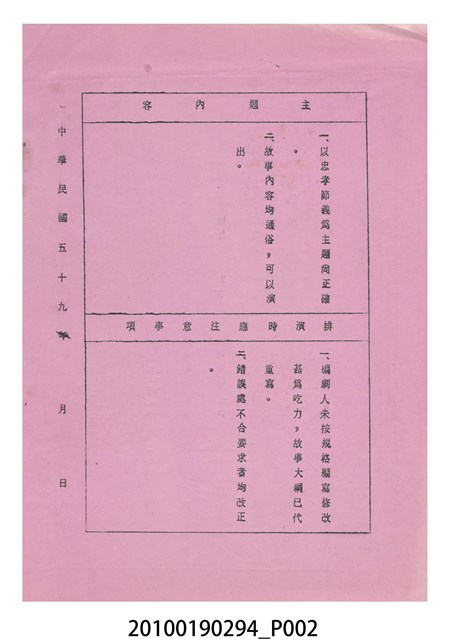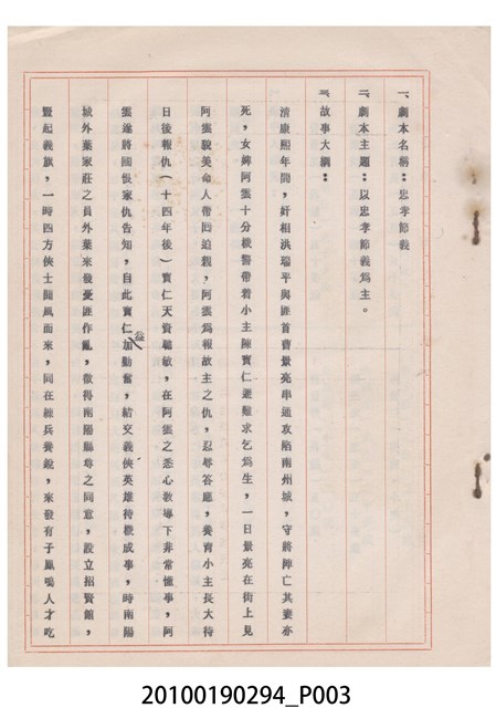 1.本件為南清閣劇團送審掌中劇故事《忠孝節義》,由南清閣劇團撰寫演出1天用的故事,呈送予臺灣省地方戲劇協進會審查,經審審查後以(59)修總字第139號發回。2.臺灣省地方戲劇協進會於民國41年成立,推動歌仔戲、布袋戲等戲劇遵照「反共抗俄」的國家政策,改良戲劇符合社會教育目標。協進會的任務之一為劇本提供及改良,民國59年成立編劇委員會並設置劇本編修小組,修改各劇團送審的劇本。