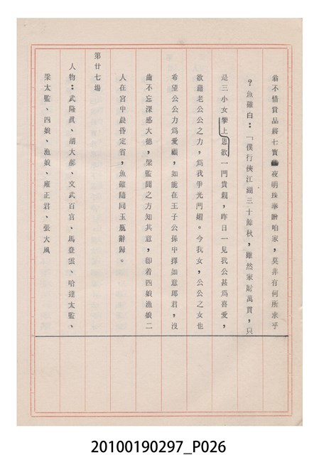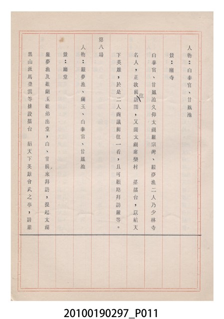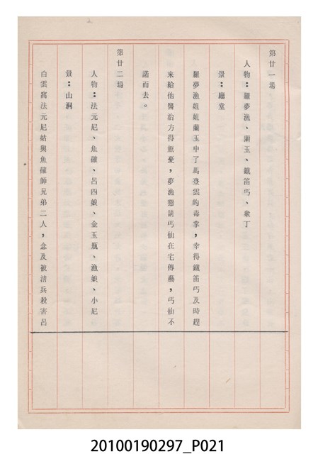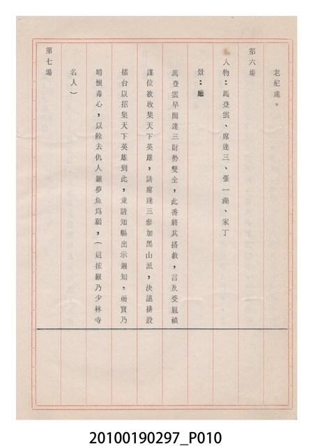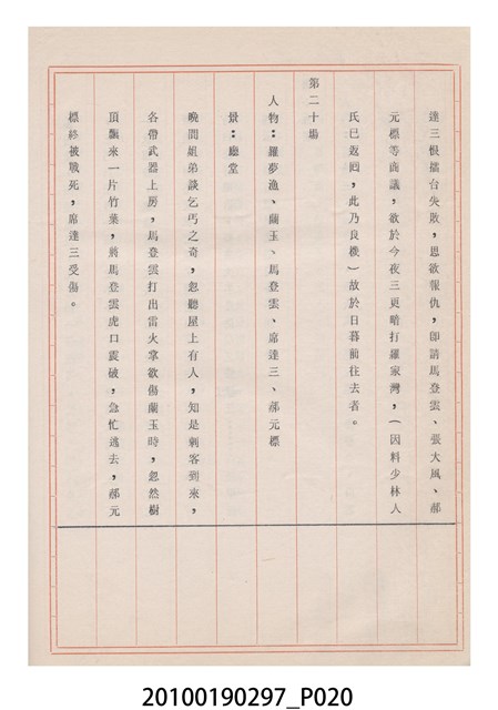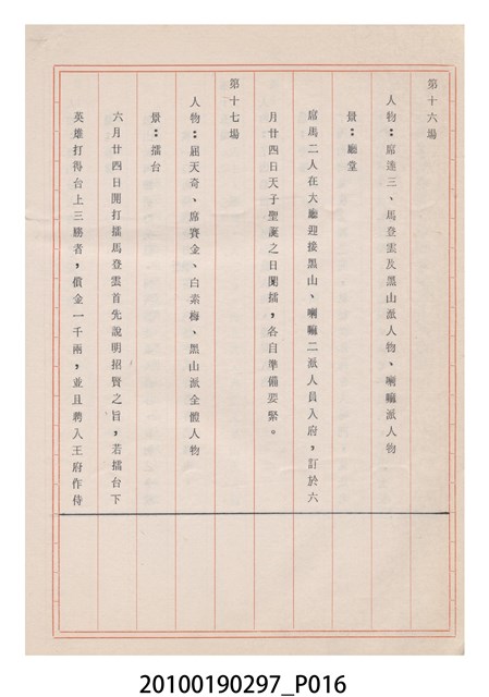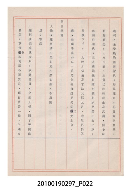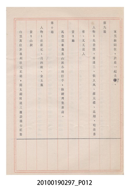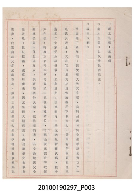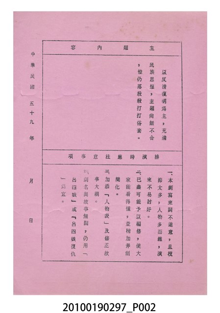 1.本件為雲南閣掌中劇團送審掌中劇故事《風雨劍》,由雲南閣掌中劇團撰寫演出1天用的故事,呈送予臺灣省地方戲劇協進會審查,經審審查後以(59)修總字第104號發回。2.臺灣省地方戲劇協進會於民國41年成立,推動歌仔戲、布袋戲等戲劇遵照「反共抗俄」的國家政策,改良戲劇符合社會教育目標。協進會的任務之一為劇本提供及改良,民國59年成立編劇委員會並設置劇本編修小組,修改各劇團送審的劇本。