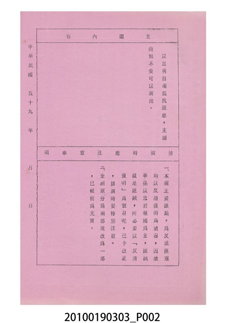 1.本件為全樂閣掌中劇團送審掌中劇故事《馬文炳剿匪記》,由全樂閣掌中劇團撰寫演出1天用的故事,呈送予臺灣省地方戲劇協進會審查,經審審查後以(59)修總字第250號發回。2.臺灣省地方戲劇協進會於民國41年成立,推動歌仔戲、布袋戲等戲劇遵照「反共抗俄」的國家政策,改良戲劇符合社會教育目標。協進會的任務之一為劇本提供及改良,民國59年成立編劇委員會並設置劇本編修小組,修改各劇團送審的劇本。