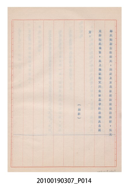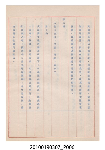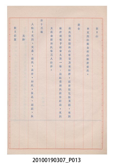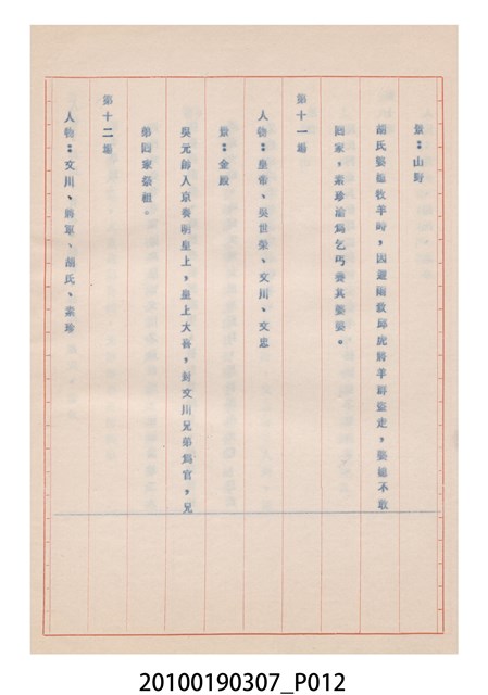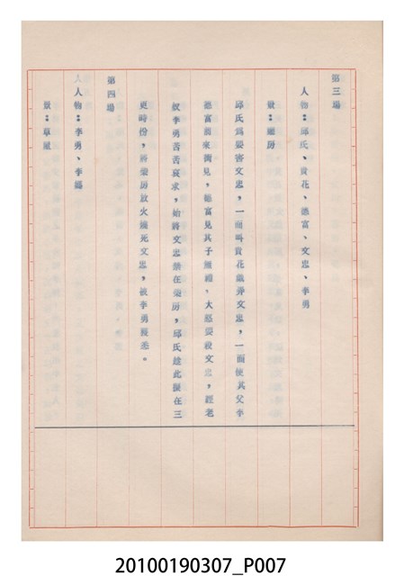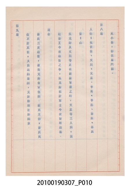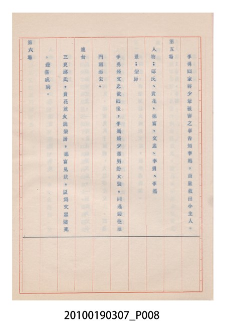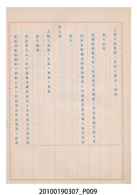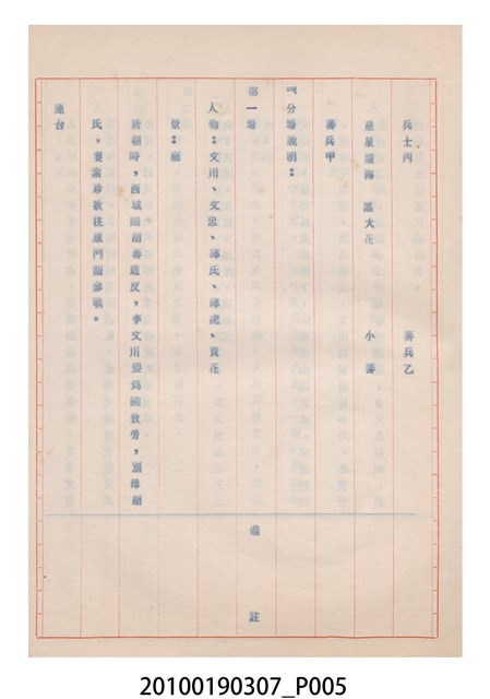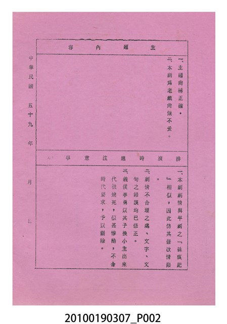 1.本件送審劇本《忠孝雙全》是大甲響五洲劇團送審的「(59)修總字第98號」劇本,內容與平劇的「朱痕記」相似。2.民國41年(1952),國民政府高舉反共抗俄的年代,由黨政機關主導成立的臺灣省地方戲劇協進會,一方面為貫徹政府意志,輔導民間劇團演出方向的工作,一方面匯集民間劇團與演藝人員的力量,共謀生存、福利與發展的平臺,實際上具有同業公會的性質與功能。
