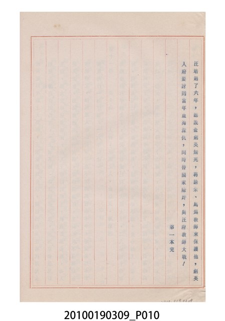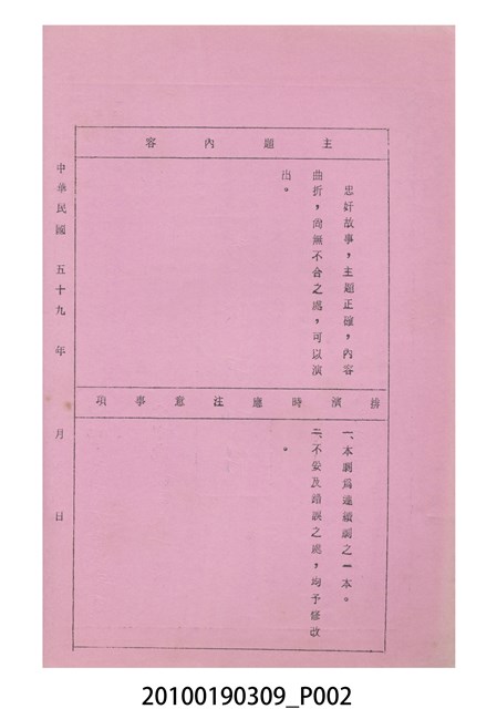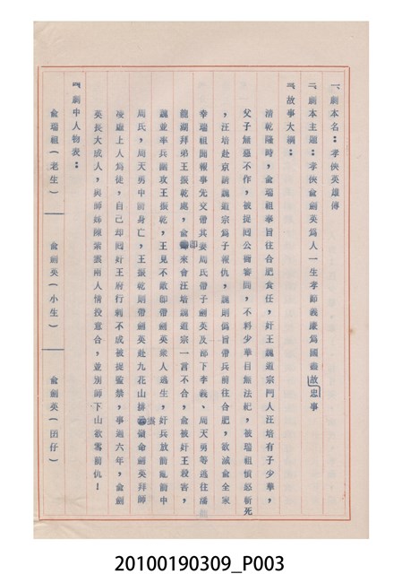 1.本件送審劇本《孝俠英雄傳》是天天興掌中劇團送審的「(59)修總字第259號」劇本,內容描寫清代乾隆時期孝俠俞劍英為人一生孝節義廉、為國盡忠的故事。2.民國41年(1952),國民政府高舉反共抗俄的年代,由黨政機關主導成立的臺灣省地方戲劇協進會,一方面為貫徹政府意志,輔導民間劇團演出方向的工作,一方面匯集民間劇團與演藝人員的力量,共謀生存、福利與發展的平臺,實際上具有同業公會的性質與功能。
