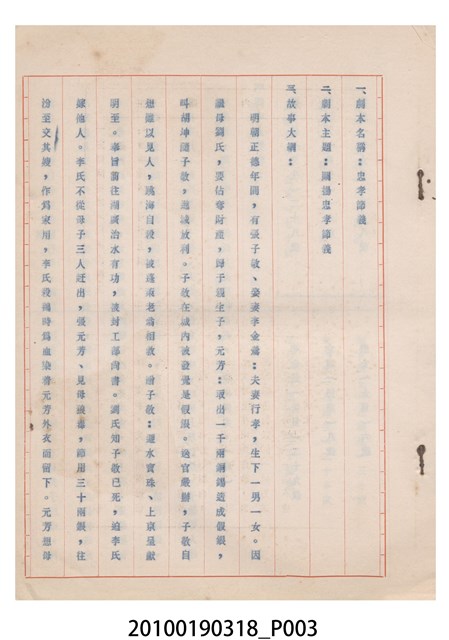 1.本件送審劇本《忠孝節義》是亞洲掌中劇團送審的「(59)修總字第64號」劇本,內容描寫明朝正德年間張子敬娶妻李金鶯,夫妻行孝等忠義事蹟。2.民國41年(1952),國民政府高舉反共抗俄的年代,由黨政機關主導成立的臺灣省地方戲劇協進會,一方面為貫徹政府意志,輔導民間劇團演出方向的工作,一方面匯集民間劇團與演藝人員的力量,共謀生存、福利與發展的平臺,實際上具有同業公會的性質與功能。