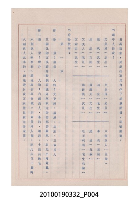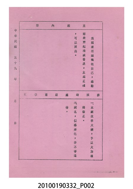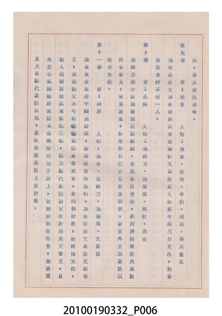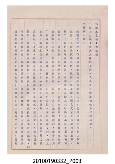 本件為金龍閣掌中劇團送審劇本《聖血記》,由金龍閣掌中劇團撰寫掌中戲(布袋戲)《聖血記》演出1天的劇本,呈送予臺灣省地方戲劇協進會審查。臺灣省地方戲劇協進會於1952年成立,推動歌仔戲、布袋戲等戲劇遵照「反共抗俄」的國家政策,改良戲劇符合社會教育目標。協進會的任務之一為劇本提供及改良,1970年成立編劇委員會並設置劇本編修小組,修改各劇團送審的劇本。
