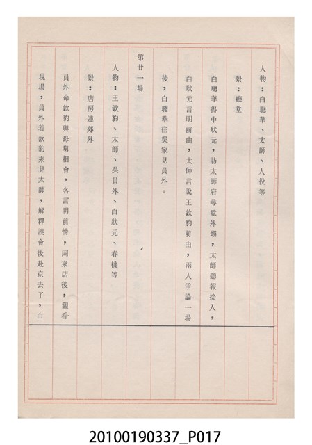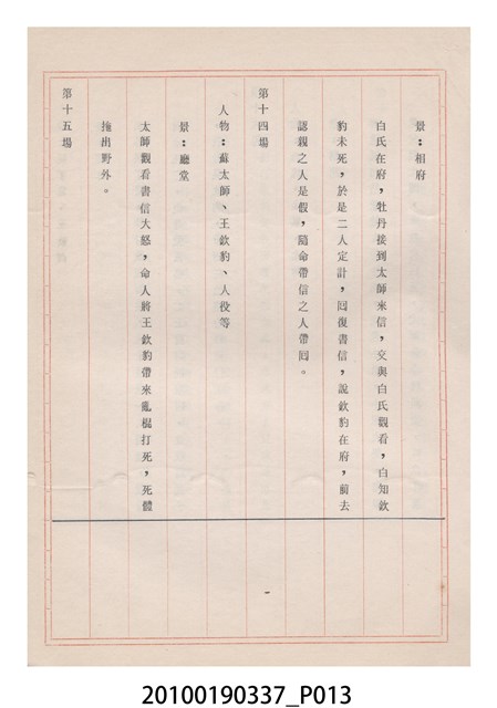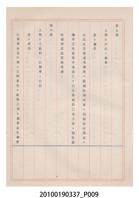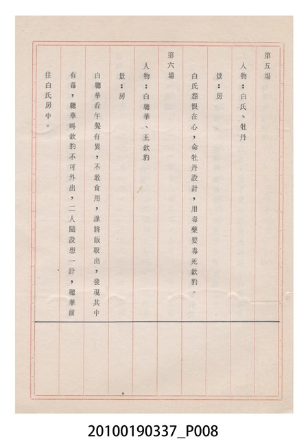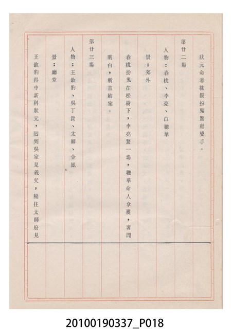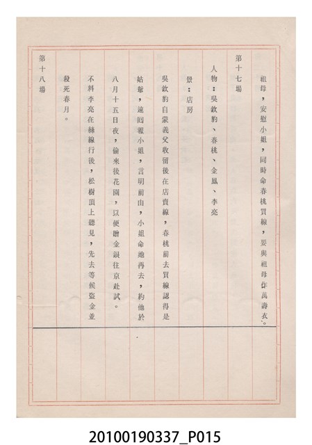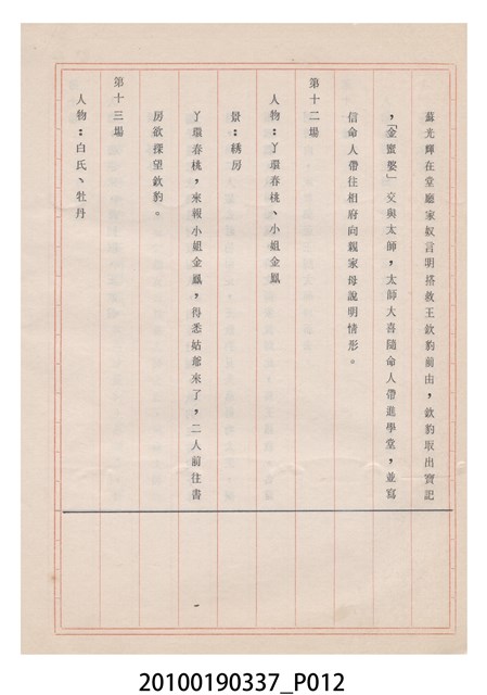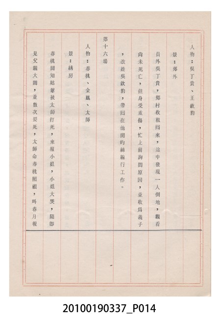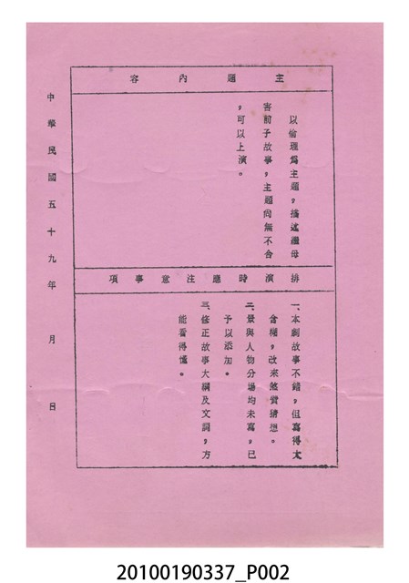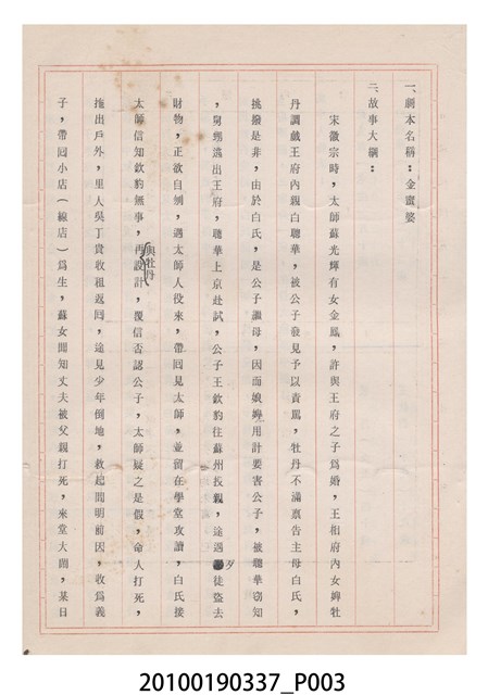 本件為金五洲掌中劇團送審劇本《金蜜婆》,由金五洲掌中劇團撰寫掌中戲(布袋戲)《金蜜婆》演出1天的劇本,呈送予臺灣省地方戲劇協進會審查。臺灣省地方戲劇協進會於1952年成立,推動歌仔戲、布袋戲等戲劇遵照「反共抗俄」的國家政策,改良戲劇符合社會教育目標。協進會的任務之一為劇本提供及改良,1970年成立編劇委員會並設置劇本編修小組,修改各劇團送審的劇本。