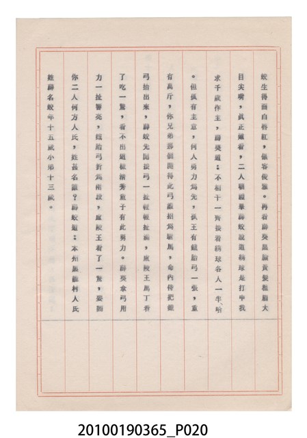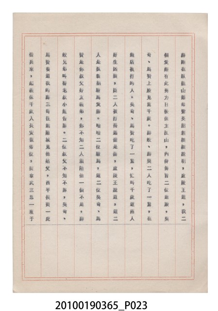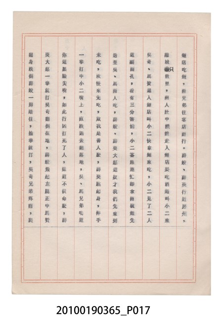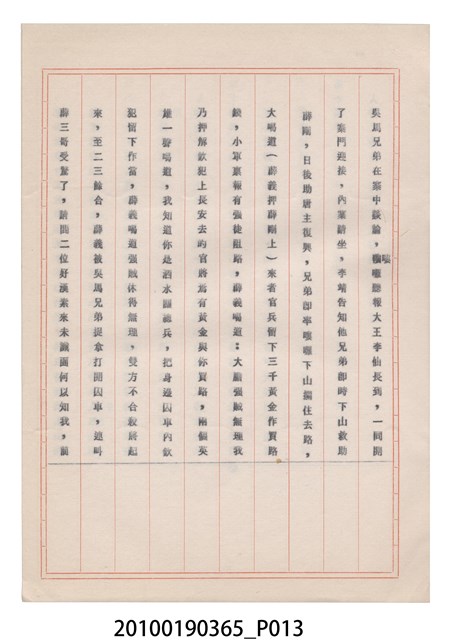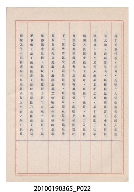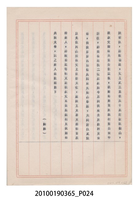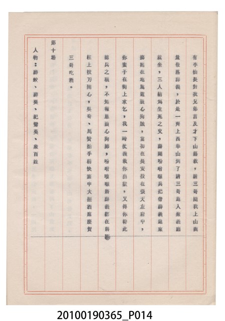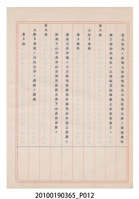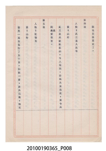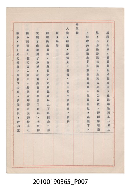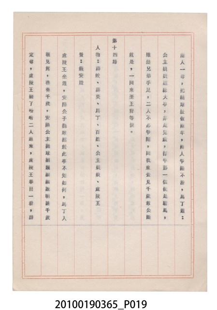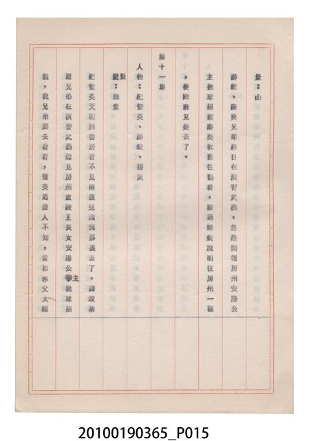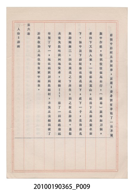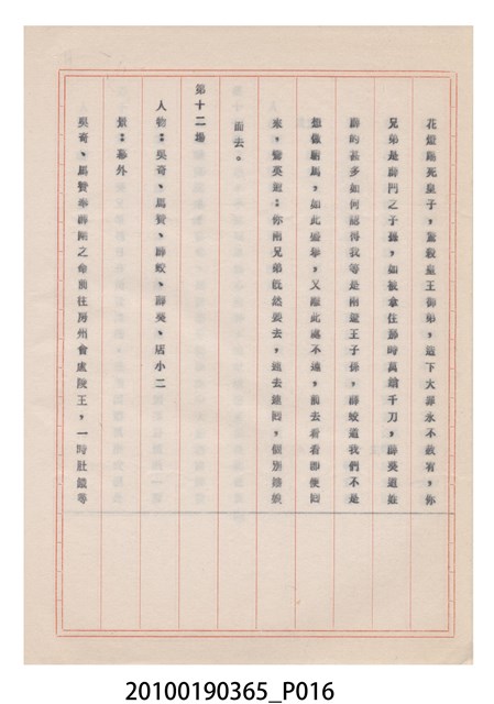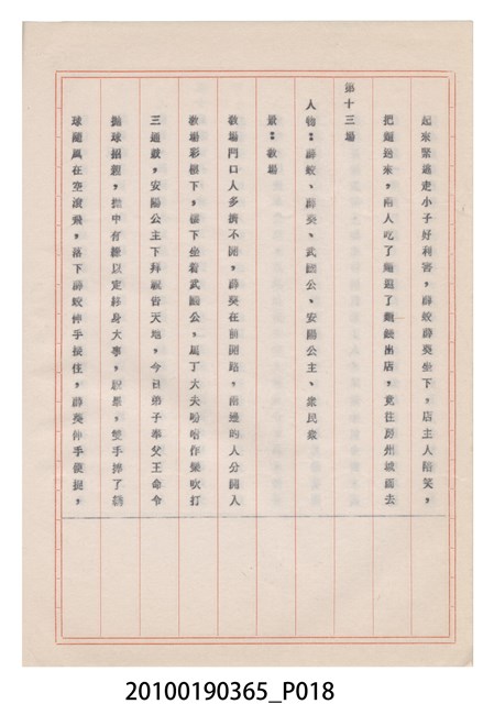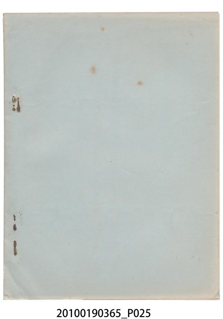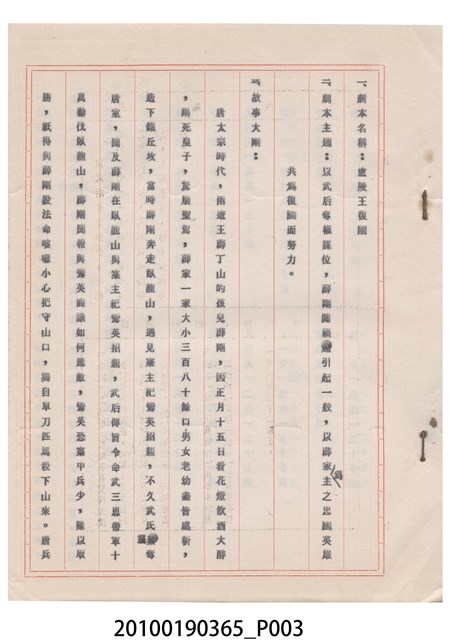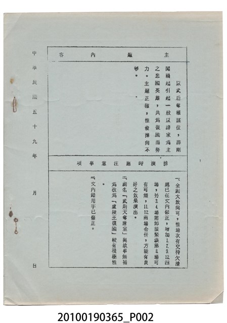 臺灣省地方戲劇協進會為1952年3月6日正式成立,協進會宗旨為「團結全省地方戲劇工作者遵照反共抗俄國策,從事改良地方戲劇、發揚民族意識、促進社會教育。」本物件為新藝華歌劇團所提之《盧陵王復國》歌仔戲劇本。右上角載有修正時之編號,依其判斷時間點應為民國59年(1970)。本物件為訂書針裝訂劇本,書籍保存狀況有褪色及釘書針因其氧化後造成周邊紙材變色,其鐵鏽產生影響到周邊紙張,有鏽蝕情形出現。