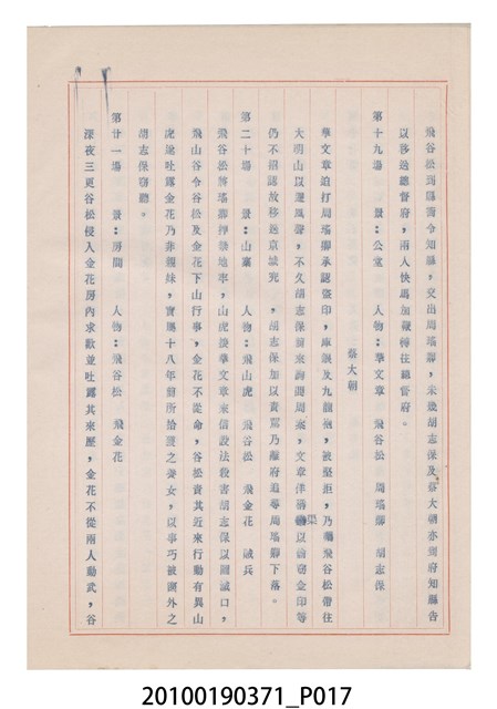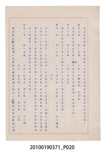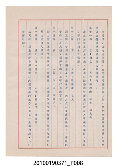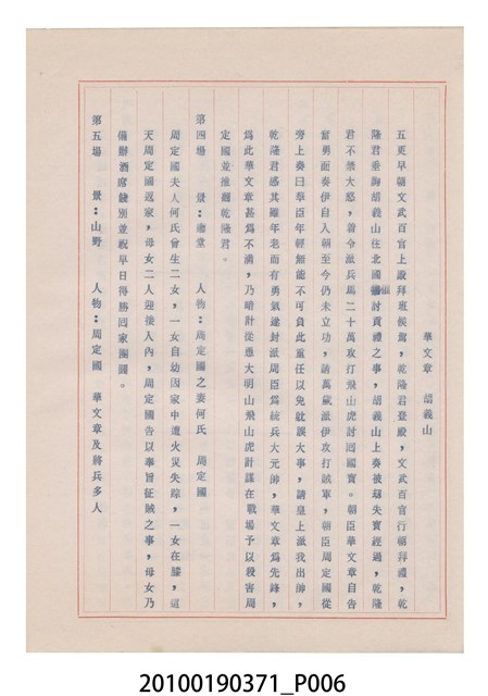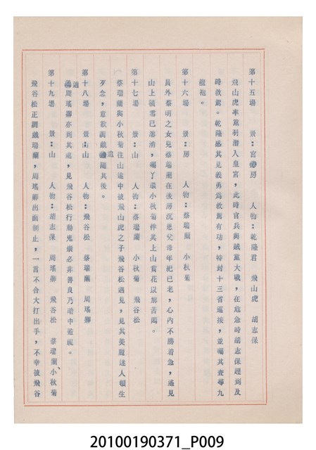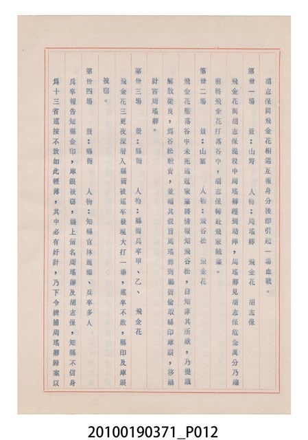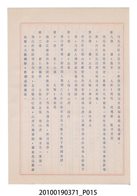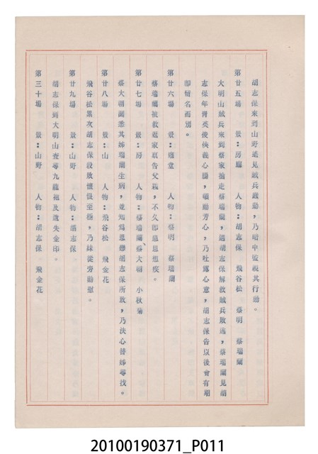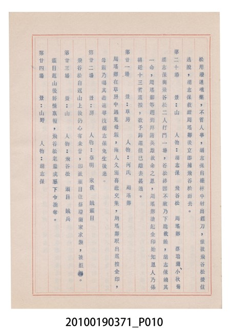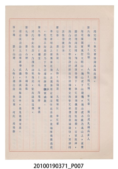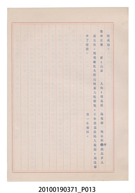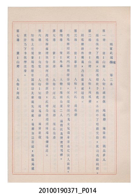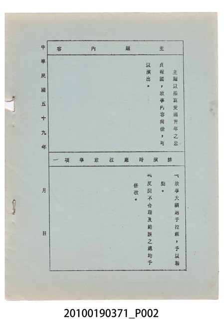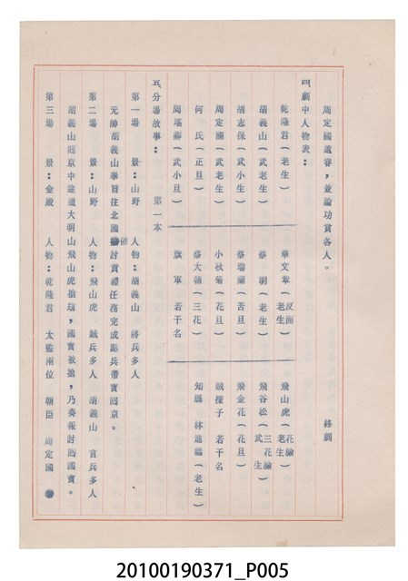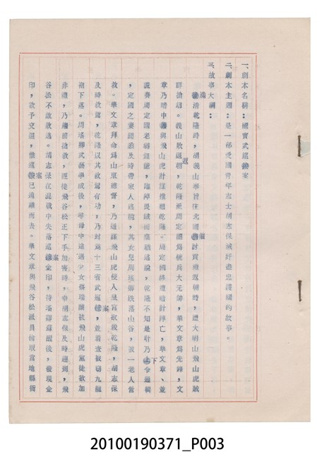 臺灣省地方戲劇協進會為1952年3月6日正式成立,協進會宗旨為「團結全省地方戲劇工作者遵照反共抗俄國策,從事改良地方戲劇、發揚民族意識、促進社會教育。」本物件為和靜歌劇團所提之《國寶武巡案》歌仔戲劇本。右上角載有修正時之編號,依其判斷時間點應為民國59年(1970)。本物件為訂書針裝訂劇本,書籍保存狀況有釘書針因其氧化後造成周邊紙材變色,其鐵鏽產生影響到周邊紙張,有鏽蝕情形出現。