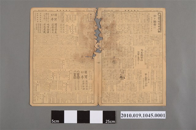 1.本文物為《小學生新聞週刊》昭和11年(1936)6月21日第257號之一,正面為報紙第1版與第10版,第1版左上角為報紙名稱,該報由日本前文部大臣鳩山一郎(1883-1959)以及前政務次官東鄉實(1881-1959)贊助,第一面左邊是報紙第1版,右邊為第10版,報導有偉人介紹、時事介紹、偵探小說等類別,內容包含:「島田俊雄閣下の少年時代」(島田俊雄閣下的少年時代)、「祖國のために」(為了祖國)、「読みにくい驛名」(難讀的火車站名)、「珍らしい燕のミイラ」(新奇燕子木乃伊)等。第二面右邊是報紙第2版,左邊為第9版以日常生活趣聞等類別的報導為主,內容包含:「子供の時事解說」(孩子們的時事解說)、「乃木將軍の生家は東京です」(乃木將軍的出生地是東京)、「あとかたの殘らぬ植ゑ疱瘡の方法」(不留痕跡的種痘方法)、「春の夕方」(春之晚)、「夏の夜」(夏之夜)等,同時還有童謠與俳句。該報為小學生新聞社發行,其地址在東京市芝區新橋五丁目十番地之七,該新聞週刊為每週日發行。