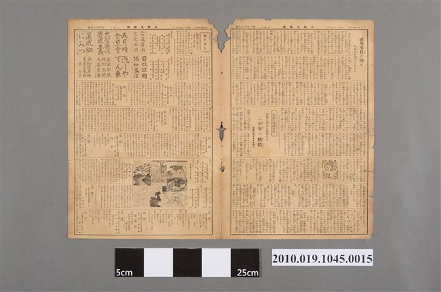 1.本文物為《小學生新聞週刊》昭和11年(1936)9月13日第269號之一,正面為報紙第1版與第10版,第1版左上角為報紙名稱,該報由日本前文部大臣鳩山一郎(1883-1959)以及前政務次官東鄉實(1881-1959)贊助。第一面左邊是報紙第1版,右邊為第10版。報導愛國故事、時事介紹、日常生活趣聞等,內容包含:「深海の底の神秘を探ぐる我國學者か世界的研究」(探究神秘深海底:我國學者出色的研究)、「母子猿」、「子供の兵隊さん」(兒童的軍隊)等。第二面右邊是報紙第2版,左邊為第9版。報導愛國故事、時事介紹等,內容包含:「成都事件の因と日本人の考ふべきこと」(成都事件的原因以及日本人應該考慮的事情)、「北滿の戰士を鼓舞する二少年の純情」(兩位少年的天真鼓舞了北滿州的戰士)、「健康」、「汽車」等,同時還有童謠與和歌。該報為小學生新聞社發行,其地址在東京市芝區新橋五丁目十番地之七,該新聞週刊為每週日發行。