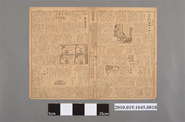 1.本文物為《小學生新聞週刊》昭和11年(1936)9月20日第270號之二,正面為報紙第3版與第6版,該報由日本前文部大臣鳩山一郎(1883-1959)以及前政務次官東鄉實(1881-1959)贊助。第一面左邊是報紙第3版,右邊為第6版。報導愛國故事、時事介紹、日常生活趣聞等,內容包含:「切った竹をさして芽が出た珍らしいこと」(從切過的竹子發芽之珍奇之事)、「馴れた鳩さん」(被馴化的鴿子)、「皆樣の日常の禮儀作法」(各位日常生活的規範)、「勇敢な少女に 怪賊逃走 お婆さん命拾ひ」(勇敢的少女 逃走的怪盜 九死一生的婆婆)等。第二面右邊是報紙第4版,左邊為第5版。報導小說、動物美談等,內容包含:「球界小說熱球一打」、「象の母性愛我か子の危機を救ふ」(大象的母愛拯救我孩子的危機)、「椎の實日記」(椎之實日記)。該報為小學生新聞社發行,其地址在東京市芝區新橋五丁目十番地之七,該新聞週刊為每週日發行。