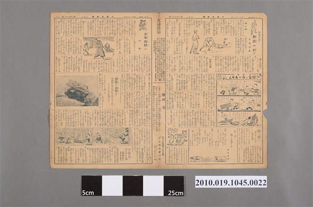 1.本文物為《小學生新聞週刊》昭和11年(1936)10月4日第272號之二,正面為報紙第3版與第6版,該報由日本前文部大臣鳩山一郎(1883-1959)以及前政務次官東鄉實(1881-1959)贊助。第一面左邊是報紙第3版,右邊為第6版。報導時事介紹、日常生活趣聞等,內容包含:「九十六貫の怪魚」(九十六貫長的怪魚)、「一寸した不注意が因で片方の眼を潰す目藥の瓶にアンもニア原液」(因為粗心將裝有氨( ammonia)的眼藥水瓶拿來使用導致一隻眼睛潰爛)、「皆樣の日常の禮儀作法」(各位日常生活的規範)、「着物に火がついに時」(和服著火時)等。第二面右邊是報紙第4版,左邊為第5版。報導小說、漫畫等,內容包含:「球界小說熱球一打」、「少年仇討」。該報為小學生新聞社發行,其地址在東京市芝區新橋五丁目十番地之七,該新聞週刊為每週日發行。