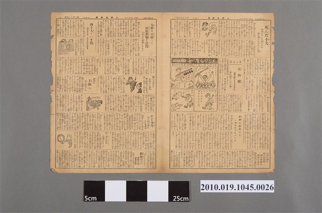 1.本文物為《小學生新聞週刊》昭和11年(1936)10月18日第274號之二,正面為報紙第3版與第6版,該報由日本前文部大臣鳩山一郎(1883-1959)以及前政務次官東鄉實(1881-1959)贊助。第一面左邊是報紙第3版,右邊為第6版。報導動物、日常生活趣事等,內容包含:「人蔘や豆贈づて出征動物を慰問小勇士に感謝しませう」(贈送人參與豆類慰問出征的動物們 對這些小勇士們表達感謝)、「死んだ小犬英治ちやんの悲しみが急に朗らかになつた話」(小狗死了 英治很難過又突然很開朗的故事)、「科學は進步する一本角の牛をつくる」(科學進步 單做一隻牛角)等。第二面右邊是報紙第4版,左邊為第5版。報導小說、時事介紹等,內容包含:「熱球一打」、「椎の實日記」、「發奮成功した記念像各小學校へ贈る」(紀念成功的雕像送給各小學)。該報為小學生新聞社發行,其地址在東京市芝區新橋五丁目十番地之七,該新聞週刊為每週日發行。