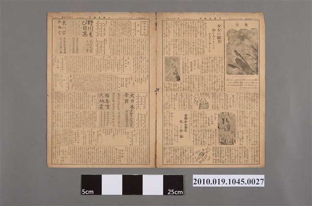 1.本文物為《小學生新聞週刊》昭和11年(1936)10月25日第275號之一,正面為報紙第1版與第10版,第1版左上角為報紙名稱,該報由日本前文部大臣鳩山一郎(1883-1959)以及前政務次官東鄉實(1881-1959)贊助。第一面左邊是報紙第1版,右邊為第10版。報導偉人介紹、時事介紹等,內容包含:「伊藤、大隈、山縣の三人よく勉強した伊藤公」(伊藤、大隈、山縣三人 十分努力的伊藤先生)、「幽靈島」、「茶園を荒す葉卷虫!」(侵害茶園的葉卷蟲)、「卵が卵を產みました噓の様なお話」(蛋生蛋像謊言般的故事)等。第二面右邊是報紙第2版,左邊為第9版。報導日常生活趣事、時事介紹等,內容包含:「少女の眼力恐れ入りました放火犯人か捕りました」(少女厲害的眼力 逮捕縱火犯)、「支那から来た兎より速い亀」(中國來的烏龜跑得比兔子快)、「飛行機」等,同時還有童謠與俳句。該報為小學生新聞社發行,其地址在東京市芝區新橋五丁目十番地之七,該新聞週刊為每週日發行。