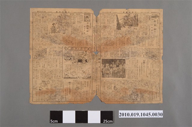 1.本文物為《小學生新聞週刊》昭和11年(1936)11月15日第278號之二,正面為報紙第3版與第6版,該報由日本前文部大臣鳩山一郎(1883-1959)以及前政務次官東鄉實(1881-1959)贊助。第一面左邊是報紙第3版,右邊為第6版。報導時事介紹、日常生活趣聞等,內容包含:「晚秋の夕映え」(晚秋的晚霞)、「放火犯人は何と太陽」(縱火犯怎麼是太陽)、「幕末の頃」(幕末的時候)等。第二面右邊是報紙第4版,左邊為第5版。報導少女小說、冒險小說、日常生活趣聞等,內容包含:「少女地域」、「皆さんの生活をアメリカ少年に知らせる東京市で美しい本を作る」(美國少年將東京的每和生活寫製成一本書)、「幽靈島」。該報為小學生新聞社發行,其地址在東京市芝區新橋五丁目十番地之七,該新聞週刊為每週日發行。