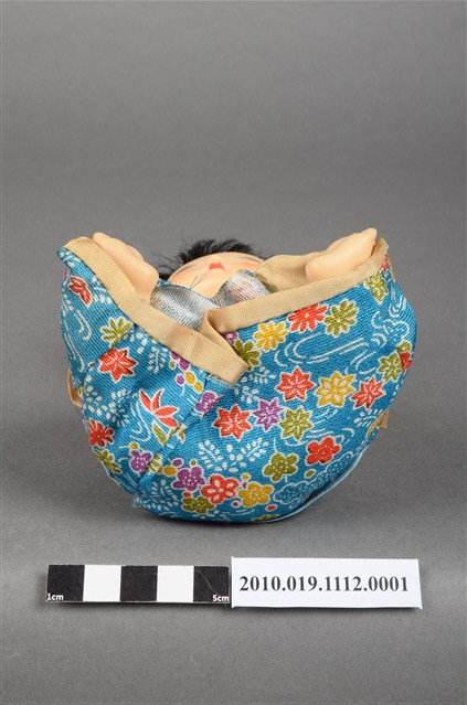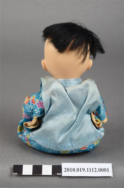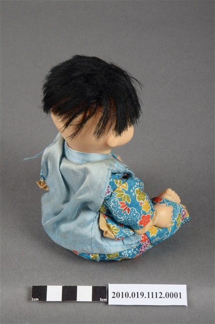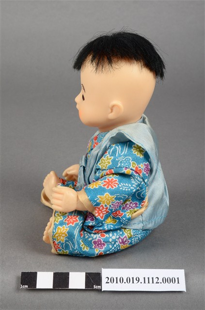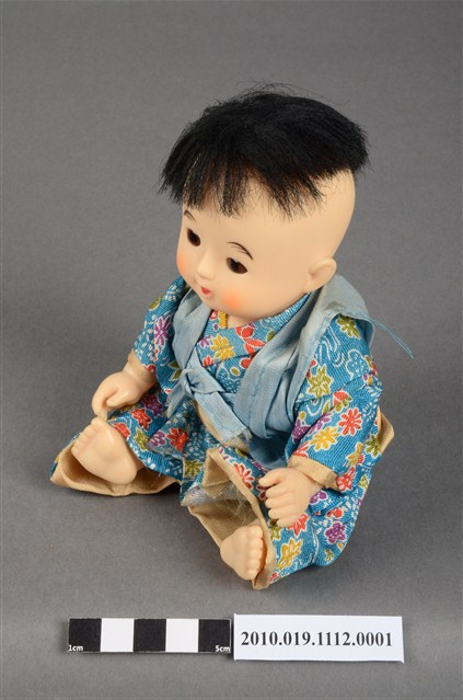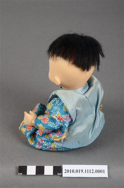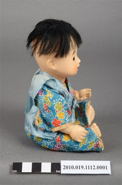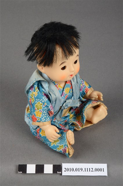 本物件為日本男孩玩偶,呈坐姿,身著藍色甚平,甚平上方印有紅色、橙色、黃色、紫色之花朵,甚平外方套有淺藍色無袖短外罩。