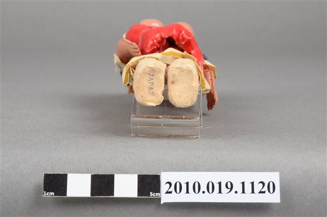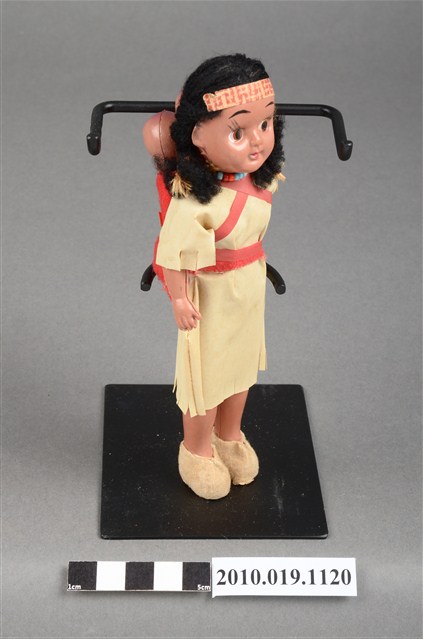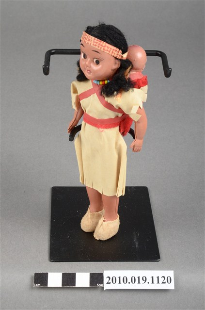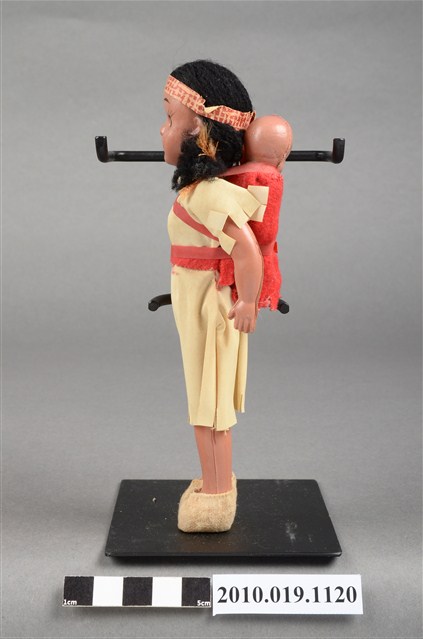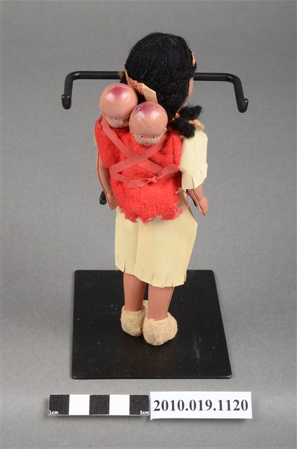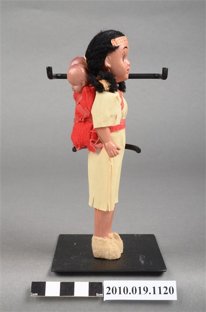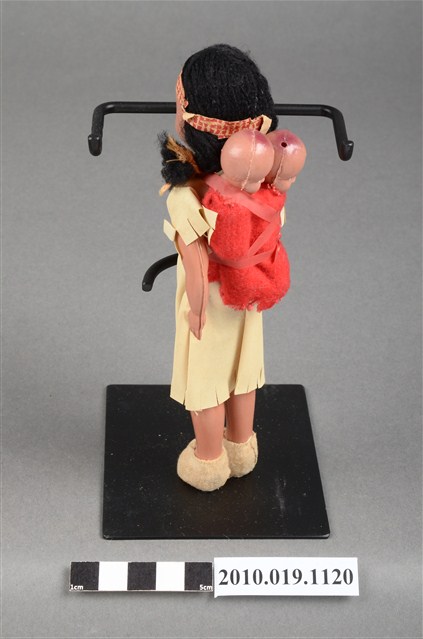 本物件為黃色服飾女孩玩偶,頭戴印花頭巾,脖子戴有彩色串珠,深著米色連身裙,連身裙上方綁有桃紅色綁帶,其作用為嬰兒背巾用來背後方2個嬰兒,腳穿米色布套。腳底印有「JAPAN」字樣。