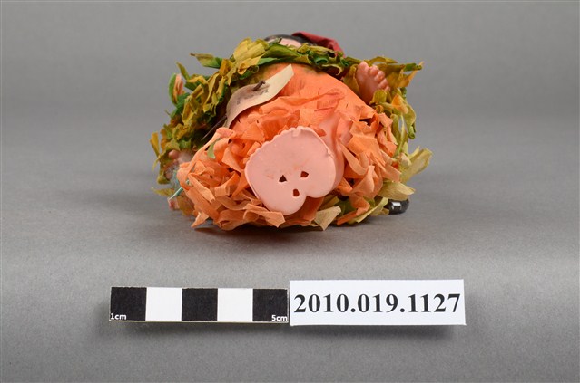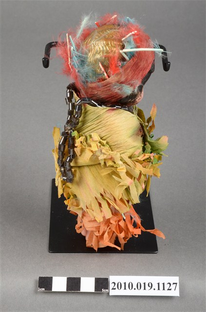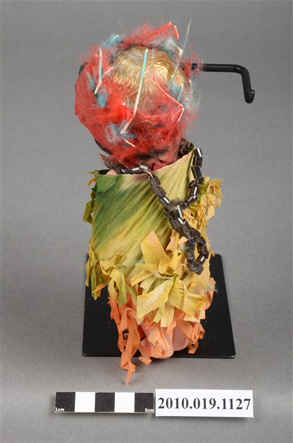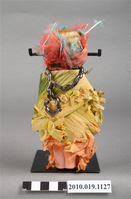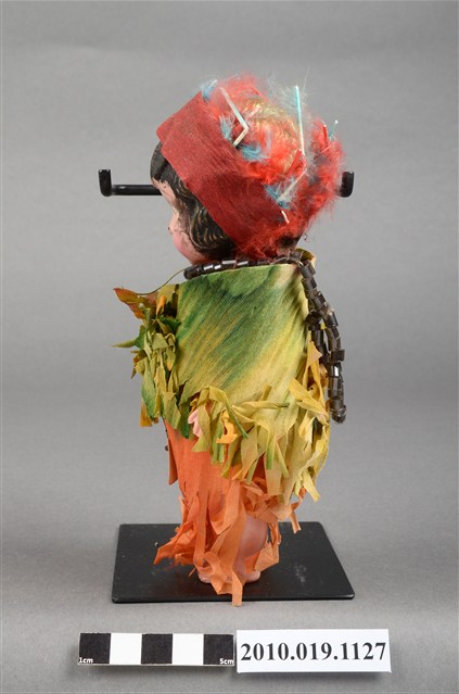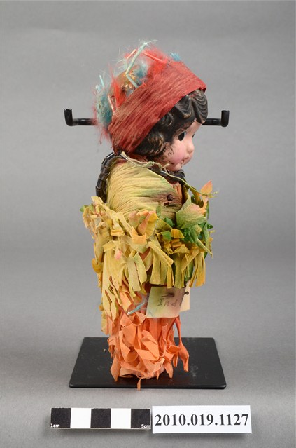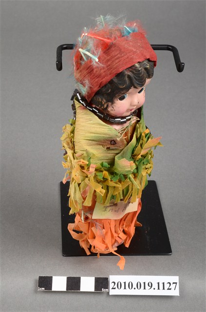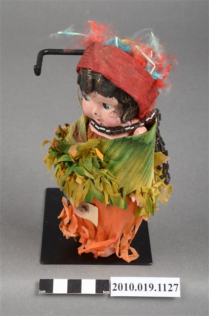 本物件為棕髮藍眼女孩玩偶,女孩為棕髮藍眼,呈站姿,身著黃綠色流蘇上衣與橘色流蘇長裙,裙上釘有黑字「Indian」之米色字條,脖子戴有黑色項鍊,頭戴紅色紗帽。