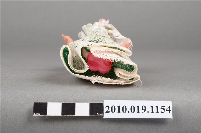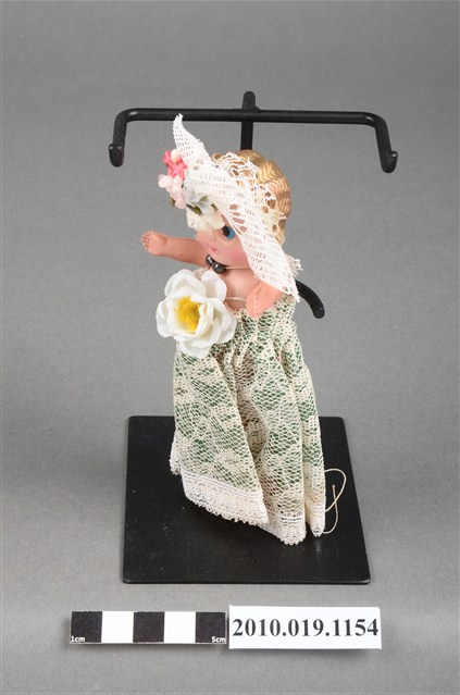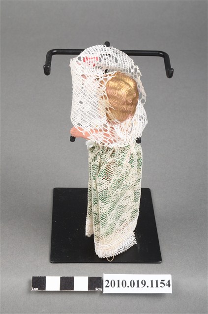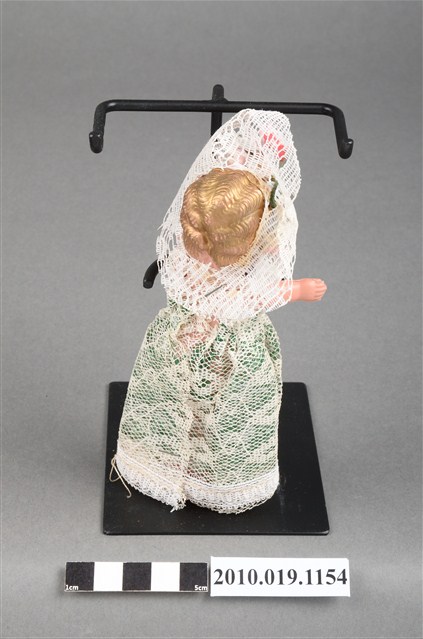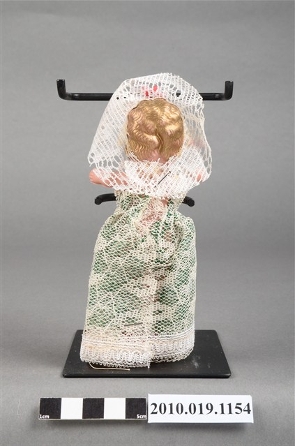 本物件為金髮新娘玩偶,新娘為金髮藍眼,呈站姿,著米色與綠色蕾絲長禮服,且禮服正面別有白色花朵;頭戴鑲花之白色頭紗;脖子戴有黑色珠珠項鍊。