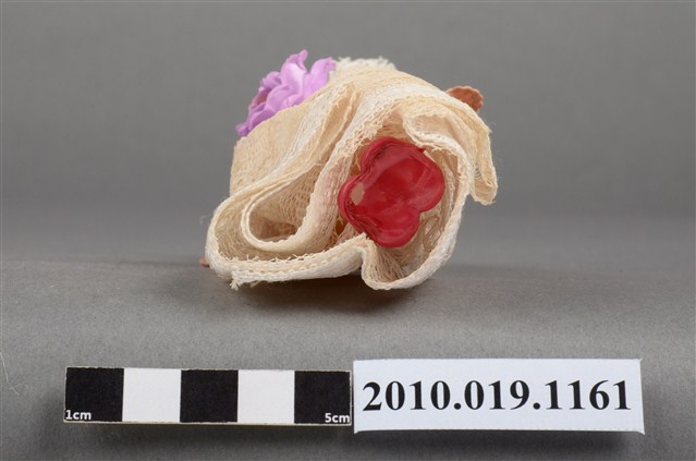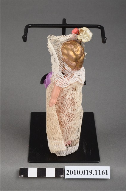 本物件為金髮新娘玩偶,新娘為金髮藍眼,呈站姿,身著米色蕾絲長禮服,且禮服正面別有紫色花朵;頭戴米色頭紗,且別有紅色花朵;脖子戴有黑色珠珠項鍊。